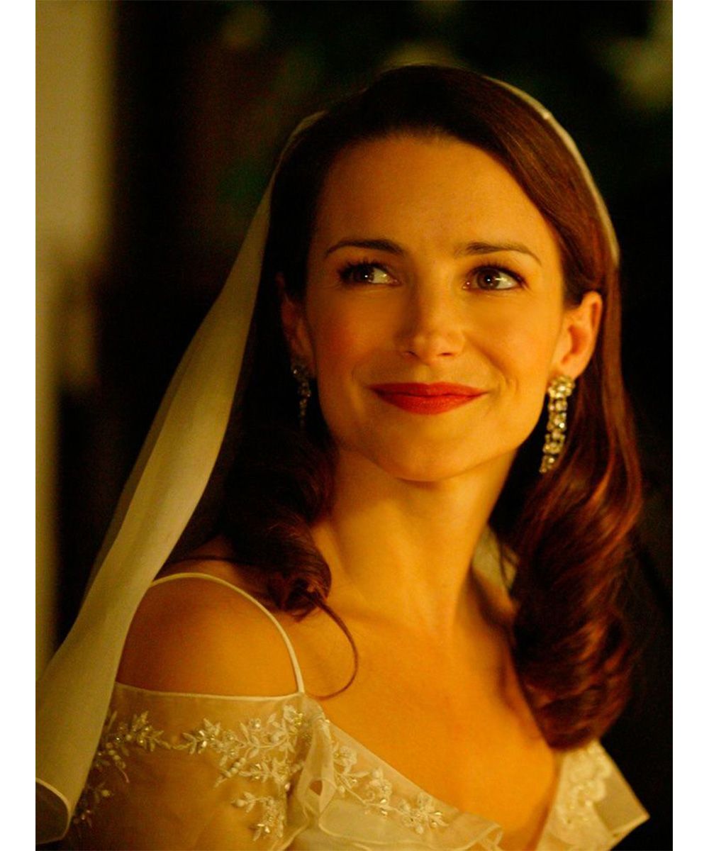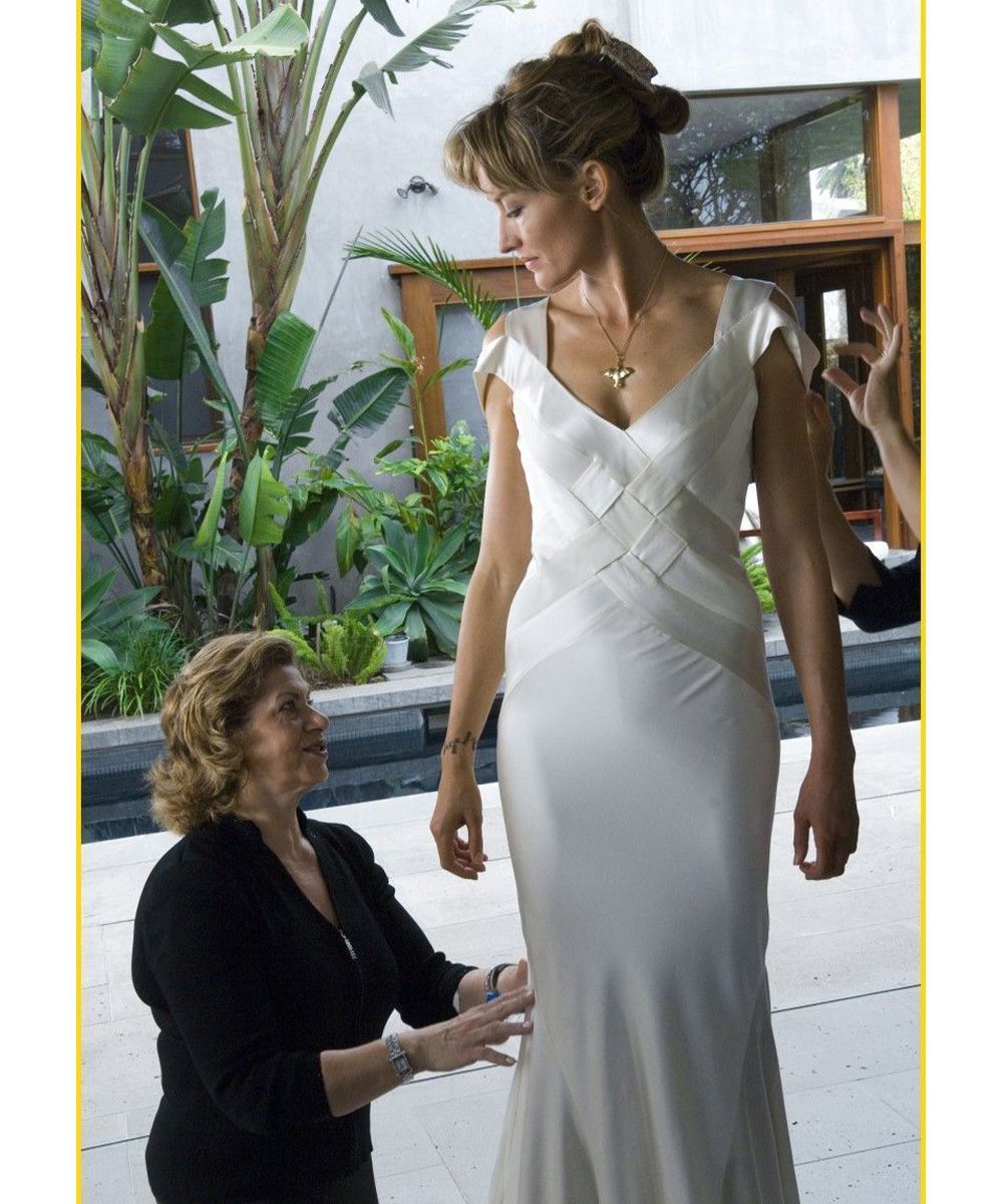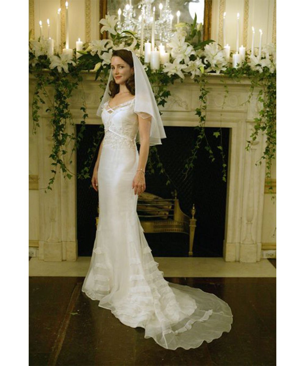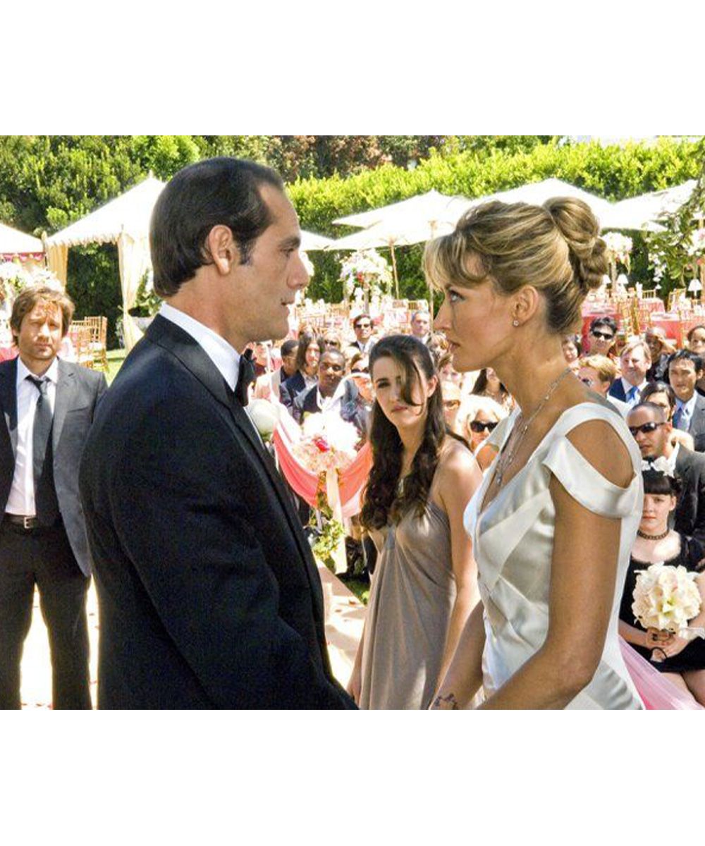 Altro abito "wow", questo semplicissimo wedding dress in raso indossato da Karen Van Der Beek (Natasha McElhone) nella prima stagione di Californication, esilarante sitcom dei late 2000s che racconta la vita dissoluta dello scrittore Hank Moody, personaggio per molti versi analogo al noto Bukowski. Per il finale di stagione Karen sfoggia un abito leggero taglio ad A in pieno mood Californiano con un intreccio di nastri sul busto e spalline, very easy chic.