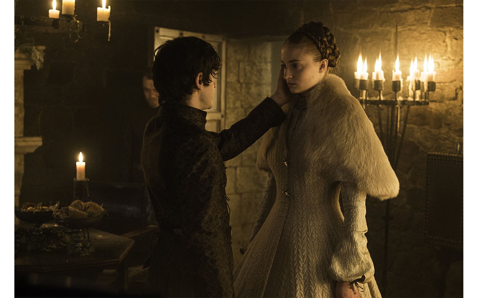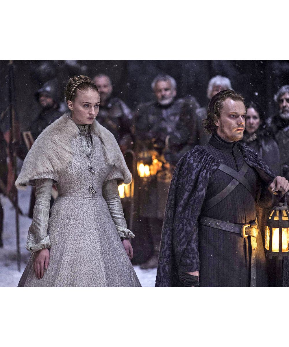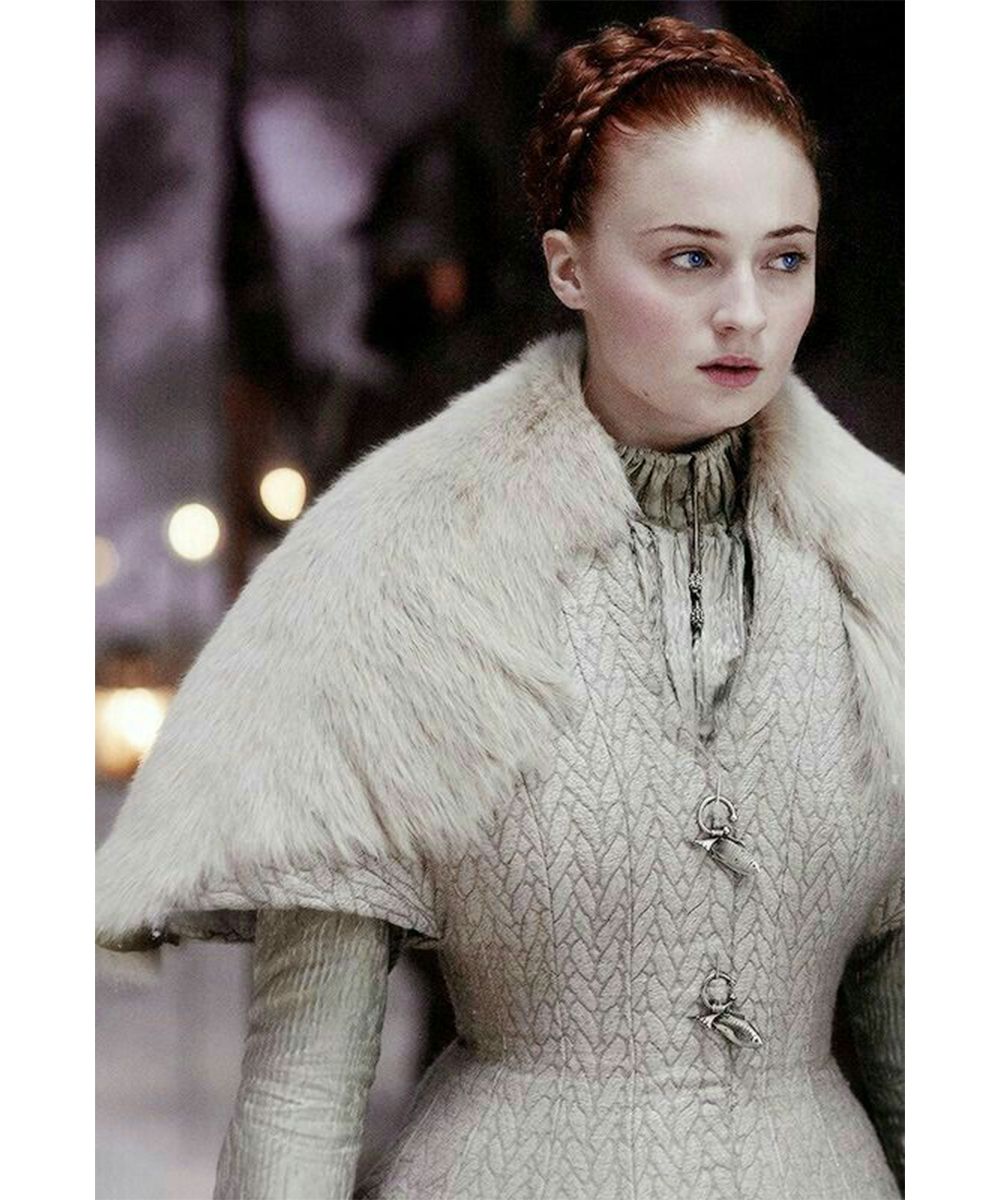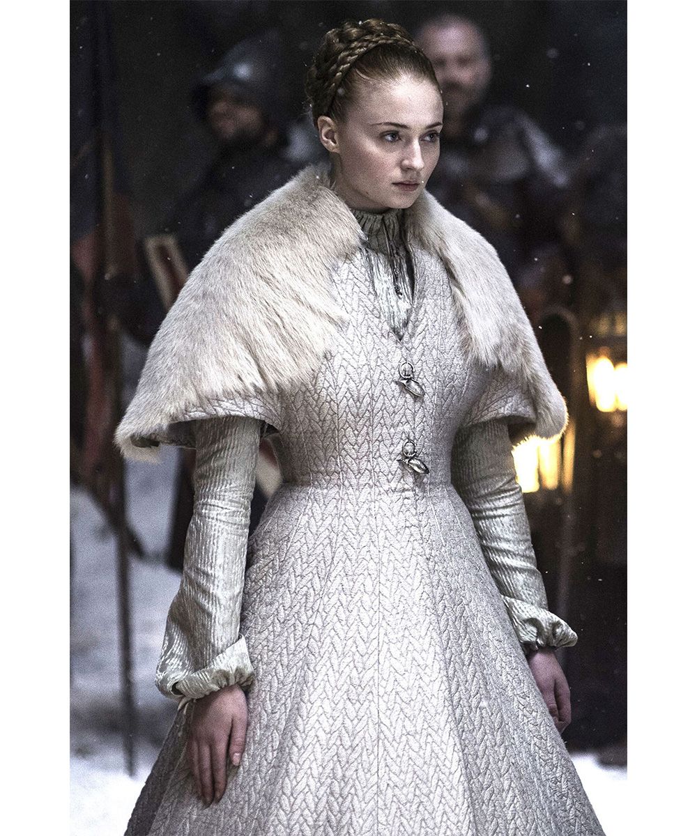 Un abito da sogno, per un matrimonio da incubo. Sansa Stark nella quinta stagione di Game of Thrones, la serie fantasy più amata e discussa degli ultimi anni, cammina lungo una navata innevata per unirsi a Ramsay Bolton con uno splendido abito bianco molto in linea con le sue radici nordiche. Il look costruito dalla costumista dello show Michele Clapton per Lady of Winterfell rende perfettamente la drammaticità del momento, dal taglio rigido del corpetto imbottito con spalline alla maxi gown con strascico, volumi ampissimi e geometrie ben definite. A completare il tutto uno scialle in pelliccia e un meraviglioso chignon di trecce.