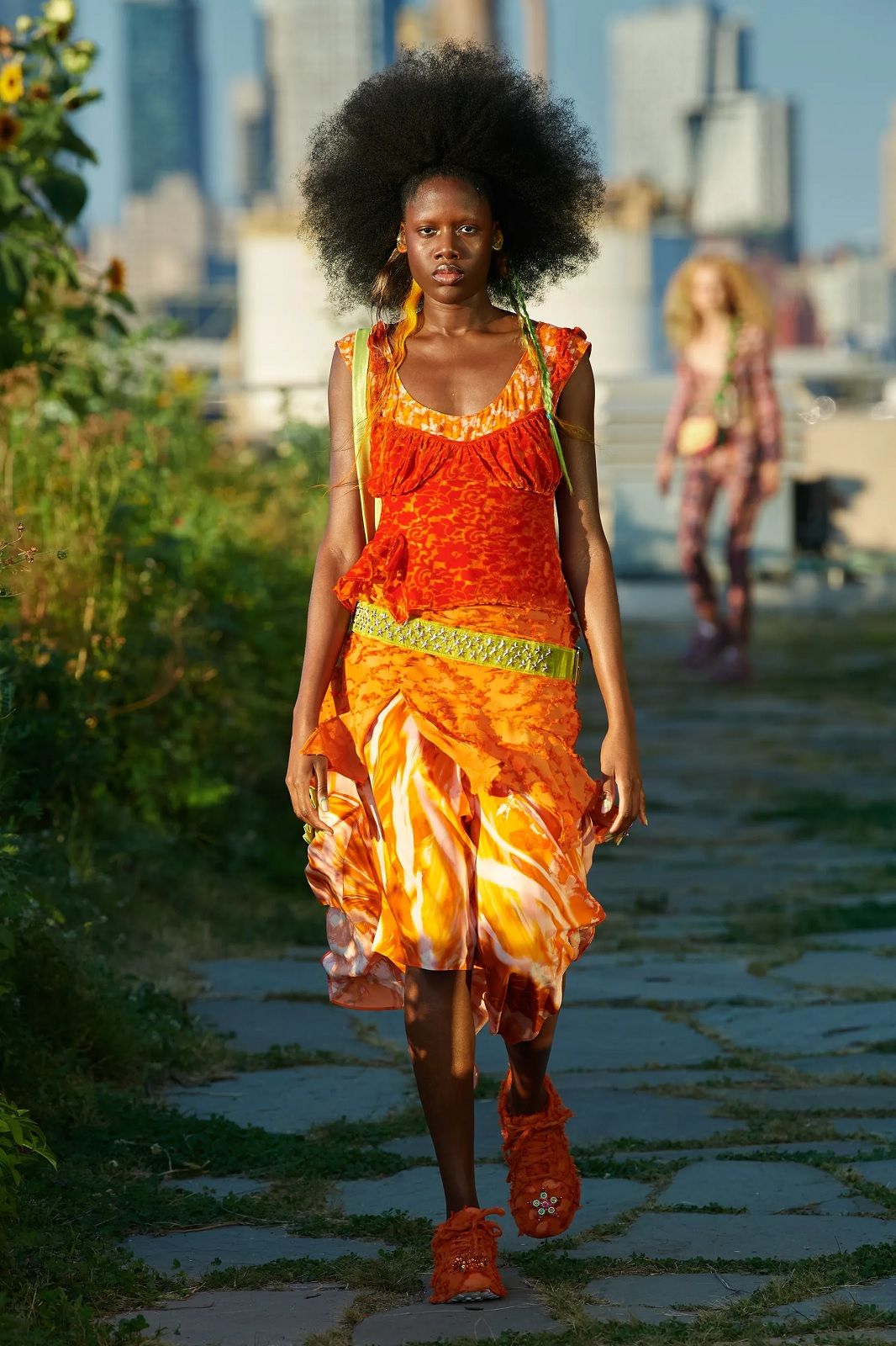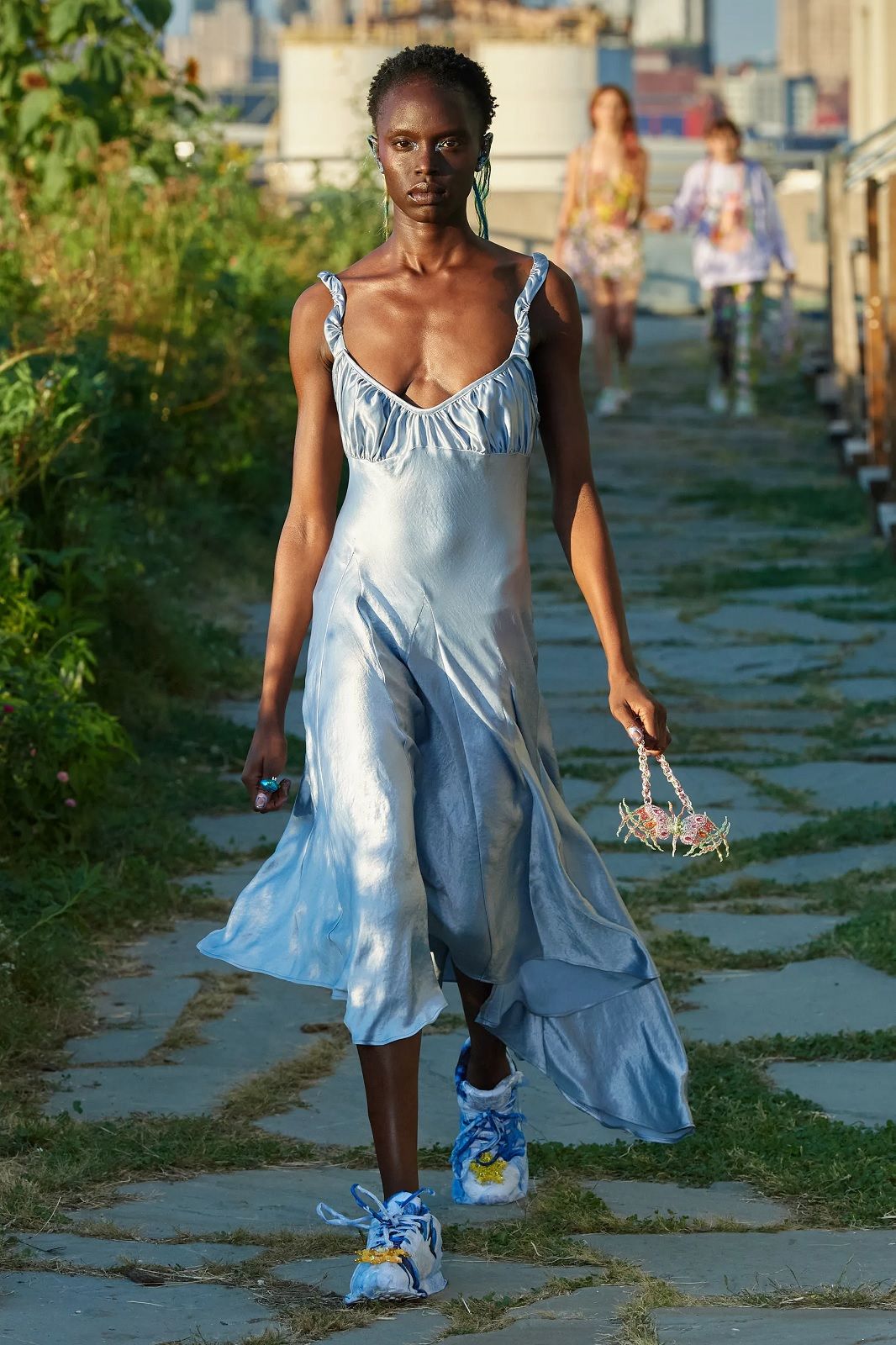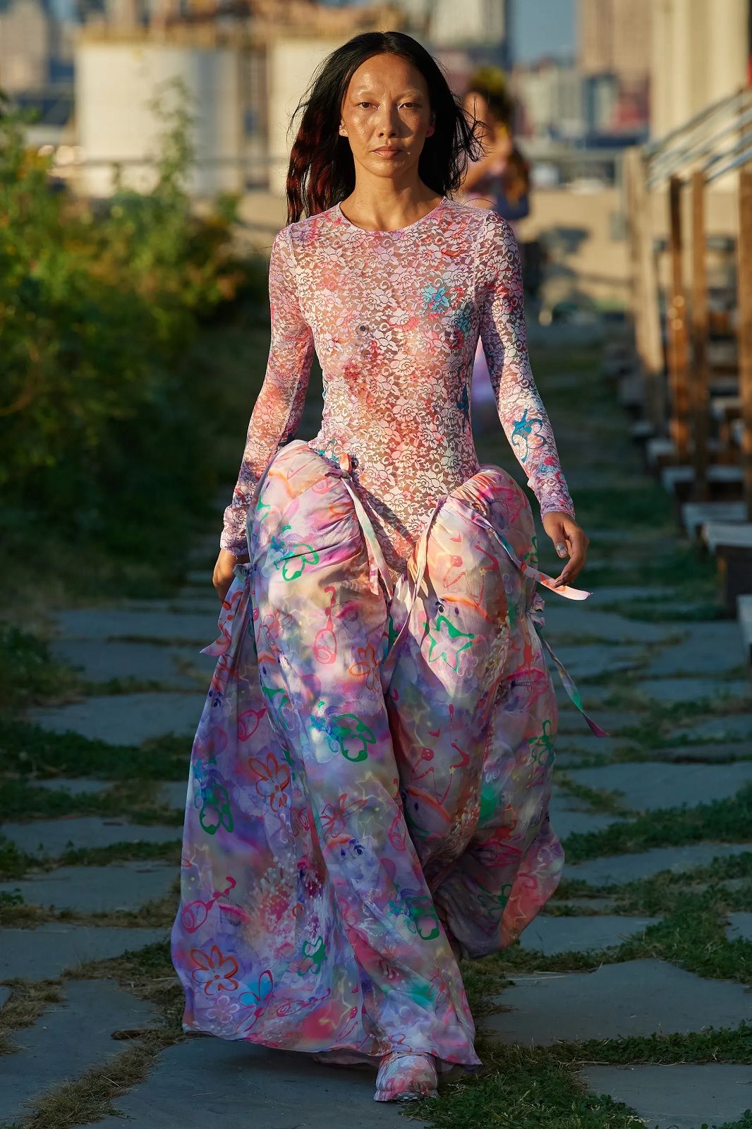 Un’esplosione di energia e colore. Dopo mesi di lockdown, Hillary Taymour ha deciso di presentare Snail’s Pace, la nuova collezione di Collina Strada con un party collettivo, una sorta di celebrazione del ritorno alla socialità, nella fattoria sul tetto del Brooklyn Grange. In questa location particolare, tra filari di pomodori, rucola e jalapeños correva, saltava e ballava un cast inclusivo di madri e figlie, amiche e innamorati, capitanato dalla modella Jazzelle Zanaughtti aka Ugly Worldwide. Il mood gioioso dello show rispecchiava perfettamente il caos multicolor dei nuovi capi del brand fatto di stampe psichedeliche, stelle, check, righe, fiori. La parola chiave della collezione? Massimalismo vibrante. Le gonne asimmetriche e piene di ruches si alternavano ai pantaloni cargo, gli abiti voluminosi ai corsetti, i body ricamati a mano alle skirt in macramè, i bikini alle tee sostenibili, gli slip dress indossati sopra i pantaloni ai jeans frutto della nuova collaborazione con Levi’s.