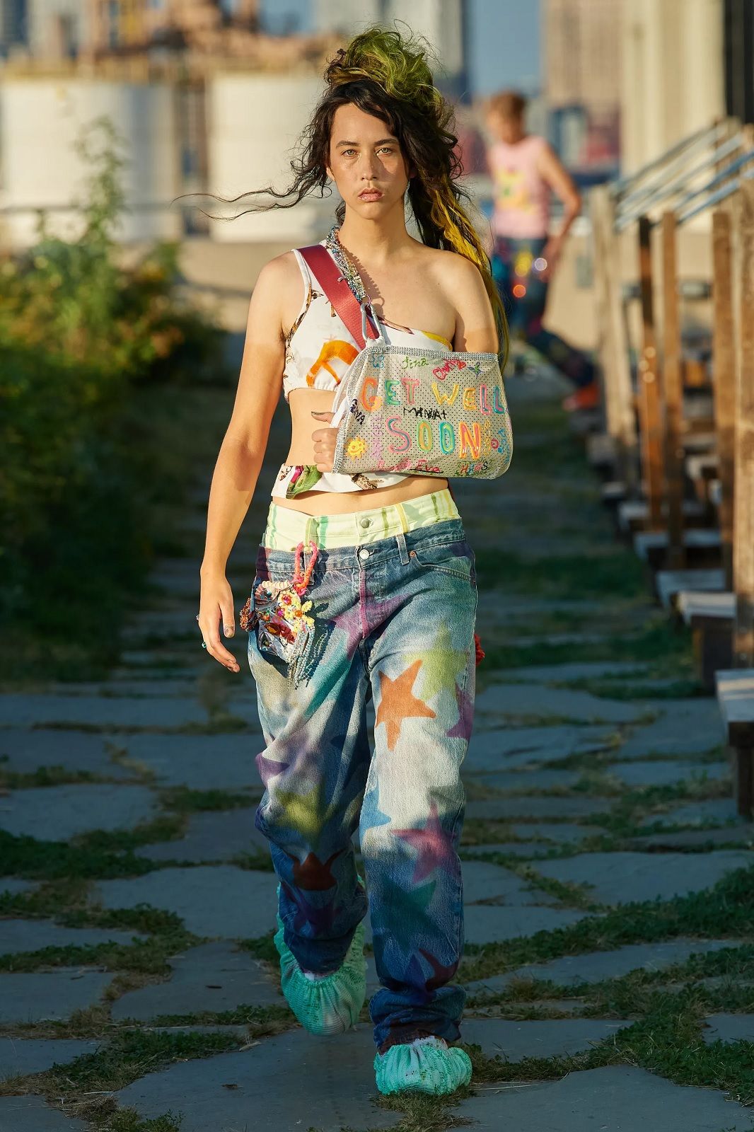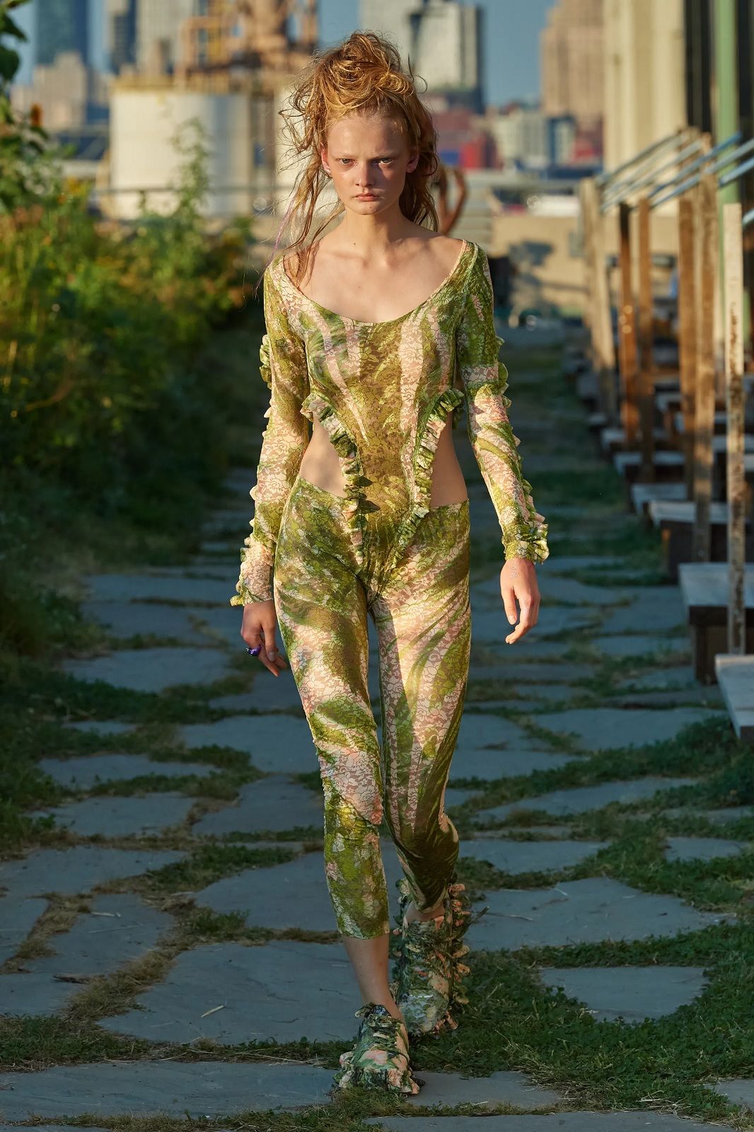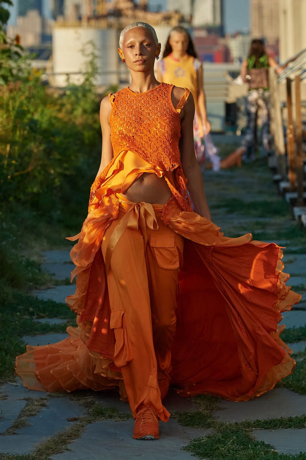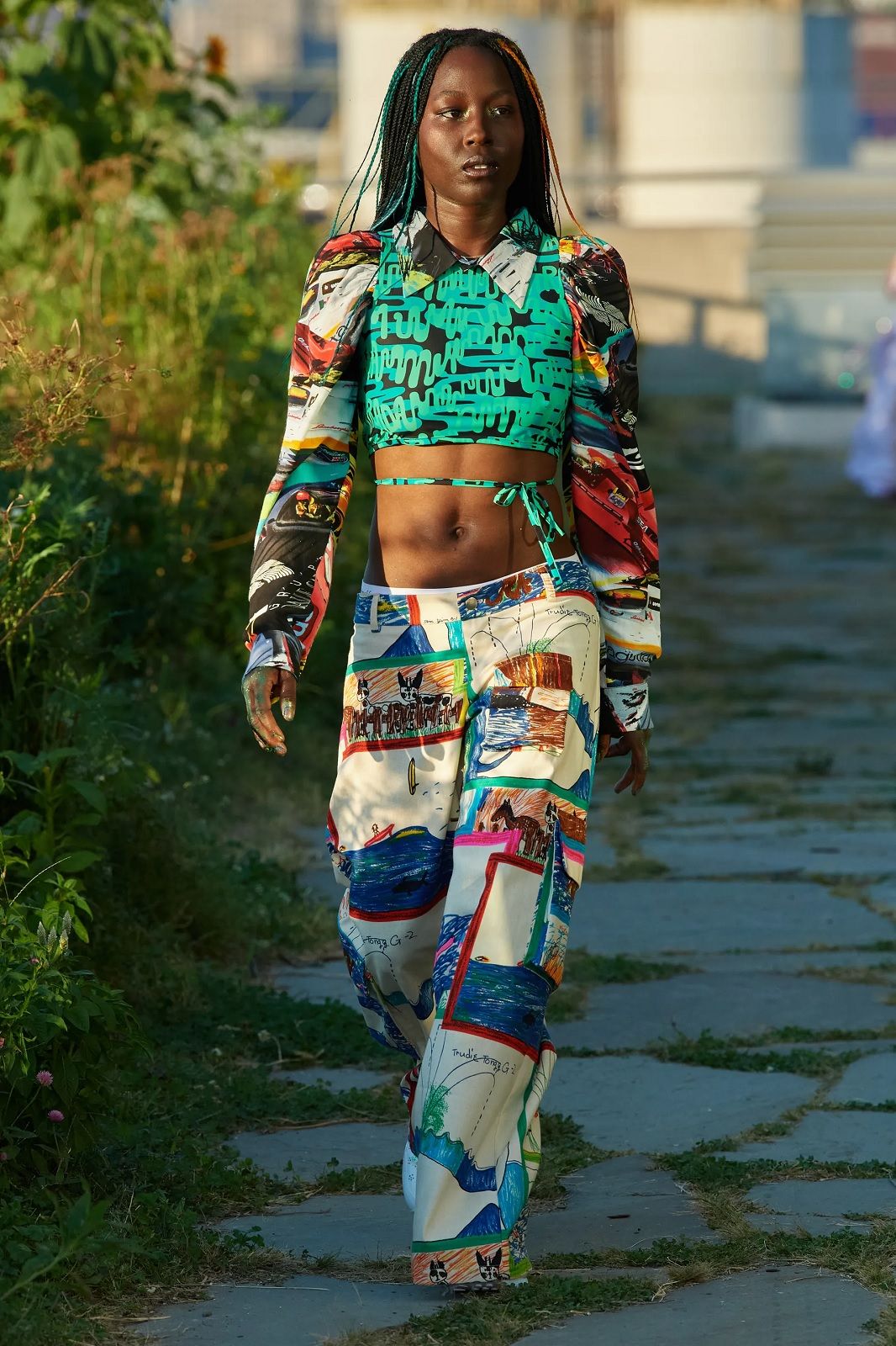 Un’esplosione di energia e colore. Dopo mesi di lockdown, Hillary Taymour ha deciso di presentare Snail’s Pace, la nuova collezione di Collina Strada con un party collettivo, una sorta di celebrazione del ritorno alla socialità, nella fattoria sul tetto del Brooklyn Grange. In questa location particolare, tra filari di pomodori, rucola e jalapeños correva, saltava e ballava un cast inclusivo di madri e figlie, amiche e innamorati, capitanato dalla modella Jazzelle Zanaughtti aka Ugly Worldwide. Il mood gioioso dello show rispecchiava perfettamente il caos multicolor dei nuovi capi del brand fatto di stampe psichedeliche, stelle, check, righe, fiori. La parola chiave della collezione? Massimalismo vibrante. Le gonne asimmetriche e piene di ruches si alternavano ai pantaloni cargo, gli abiti voluminosi ai corsetti, i body ricamati a mano alle skirt in macramè, i bikini alle tee sostenibili, gli slip dress indossati sopra i pantaloni ai jeans frutto della nuova collaborazione con Levi’s.