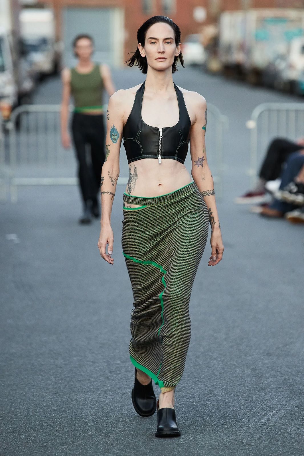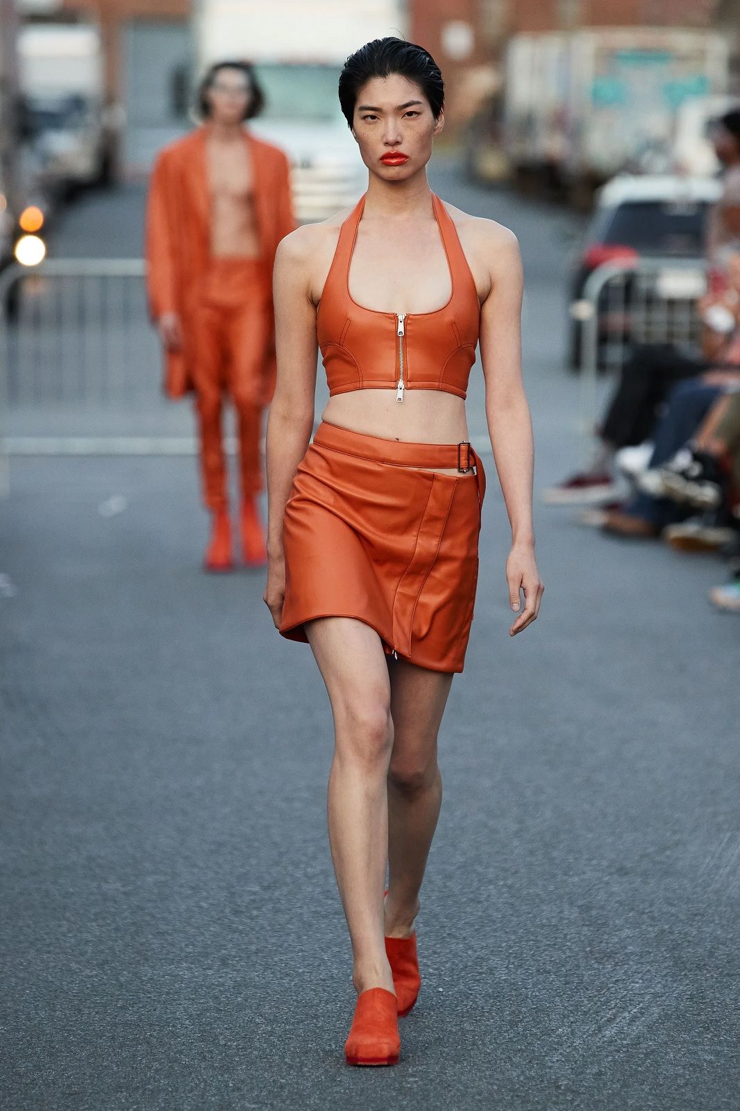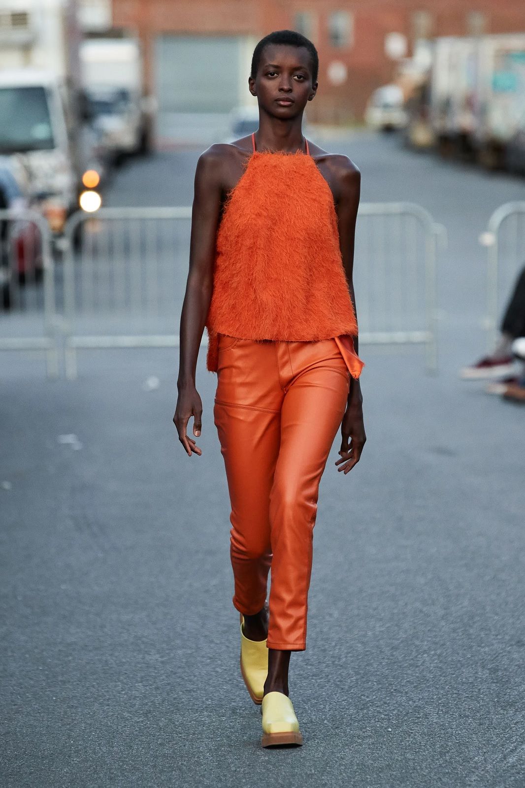 Arrivato al suo decimo anno di attività, il brand continua ad evolvere i propri codici senza dimenticare vestibilità e versatilità, risultando così estremamente contemporaneo. Il duo di designer torna a Bushwick davanti a Rosalía, Troye Sivan e un piccolo gruppo di altri spettatori con una serie di capi che è un inno alla libertà, ad una sensualità positiva, fatto di elementi contrastanti con cui giocare a seconda del proprio mood. Le camicie e gli abiti trasparenti si alternano ai twinset di lana, i completi in maglia tenuti insiemi da file di bottoni automatici ai micro top e ai pantaloni in pelle, le pesanti maglie in lana colorata ai mini dress e agli capi pieni di cut-out. La palette? A fianco al classico black & white, esplodono l’arancione, il viola, il verde. Una scelta di nuances energiche che amplificano l’ispirazione ottimista e sexy della collezione.