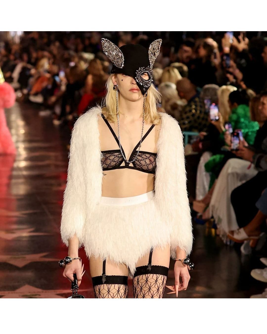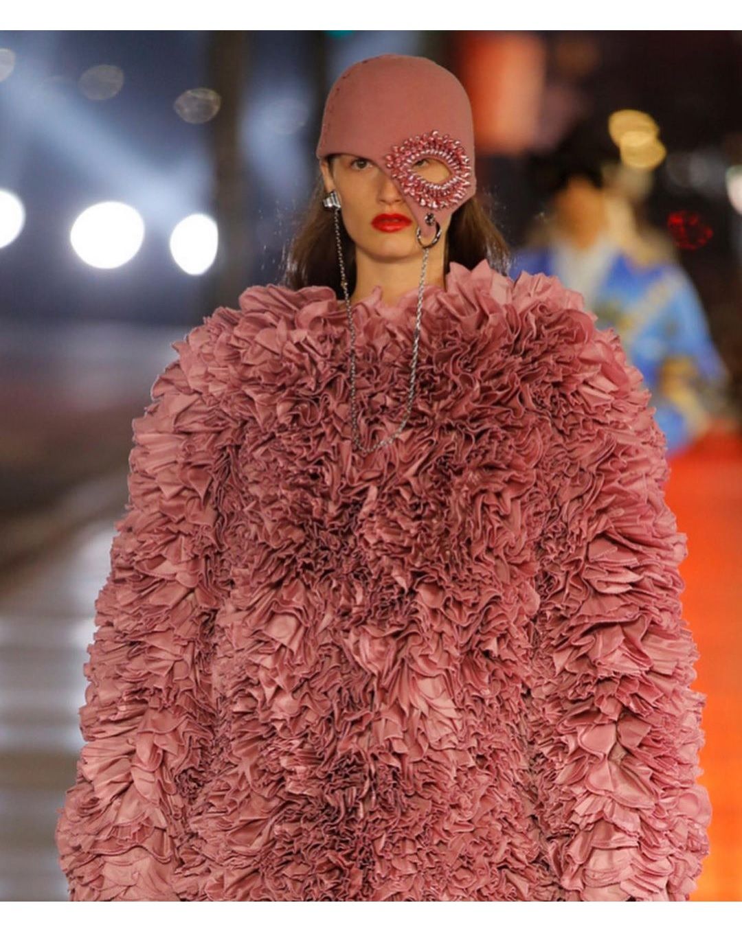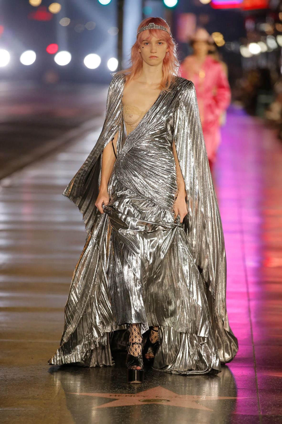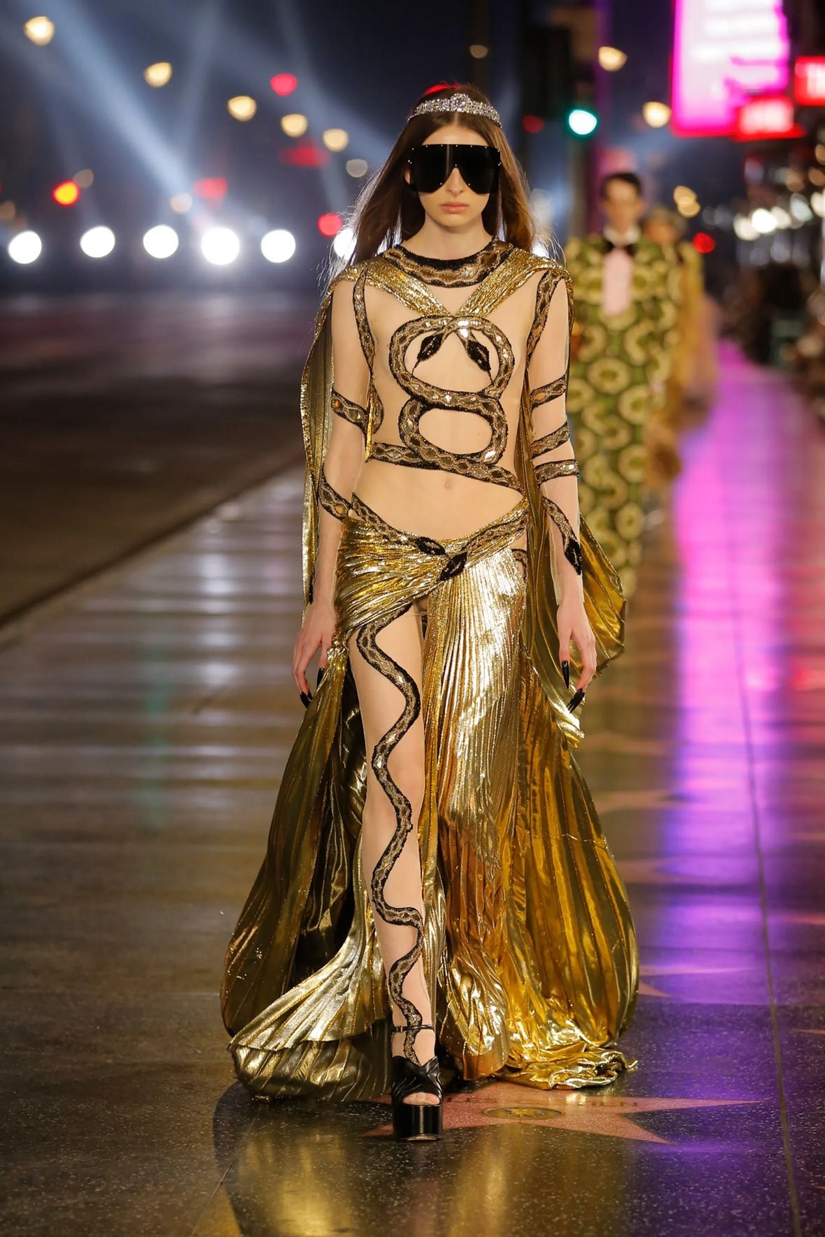 Gli accessori, come i capi della collezione, sono un affascinante ibrido tra la Hollywood più decadente e quella dei parties pieni di glitter e champagne. Ci sono diademi di cristalli e cappelli da cowboy; bellissimi gioielli che incorniciano il naso; copricapi flapper di catene dorate e altri che uniscono il famoso Peek-a-boo Hat di Elsa Schiaparelli con le maschere bondage; occhiali da sole di diverse forme dai cat-eye alla Joan Crawford a quelli da sci super coprenti perfetti per sfuggire ai paparazzi. La nuova collezione di Gucci attinge all’universo di references del designer, un mash-up in cui si fondono la Golden Age di Hollywood, "il pallore d’alabastro e la voce chiara di Marilyn Monroe, i capelli vellutati di Veronica Lake, il fascino seducente di Rock Hudson e l’accattivante potere di trasformazione di Kim Novak", ma anche i gay club degli anni ’70, gli idoli del rock’n roll e i freaks più glam mai visti in passerella.