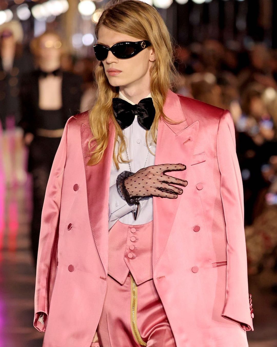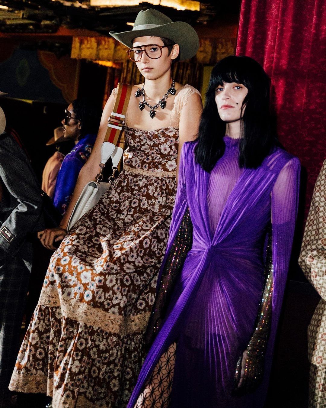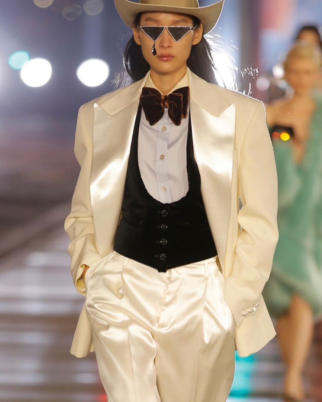 Gli accessori, come i capi della collezione, sono un affascinante ibrido tra la Hollywood più decadente e quella dei parties pieni di glitter e champagne. Ci sono diademi di cristalli e cappelli da cowboy; bellissimi gioielli che incorniciano il naso; copricapi flapper di catene dorate e altri che uniscono il famoso Peek-a-boo Hat di Elsa Schiaparelli con le maschere bondage; occhiali da sole di diverse forme dai cat-eye alla Joan Crawford a quelli da sci super coprenti perfetti per sfuggire ai paparazzi. La nuova collezione di Gucci attinge all’universo di references del designer, un mash-up in cui si fondono la Golden Age di Hollywood, "il pallore d’alabastro e la voce chiara di Marilyn Monroe, i capelli vellutati di Veronica Lake, il fascino seducente di Rock Hudson e l’accattivante potere di trasformazione di Kim Novak", ma anche i gay club degli anni ’70, gli idoli del rock’n roll e i freaks più glam mai visti in passerella.