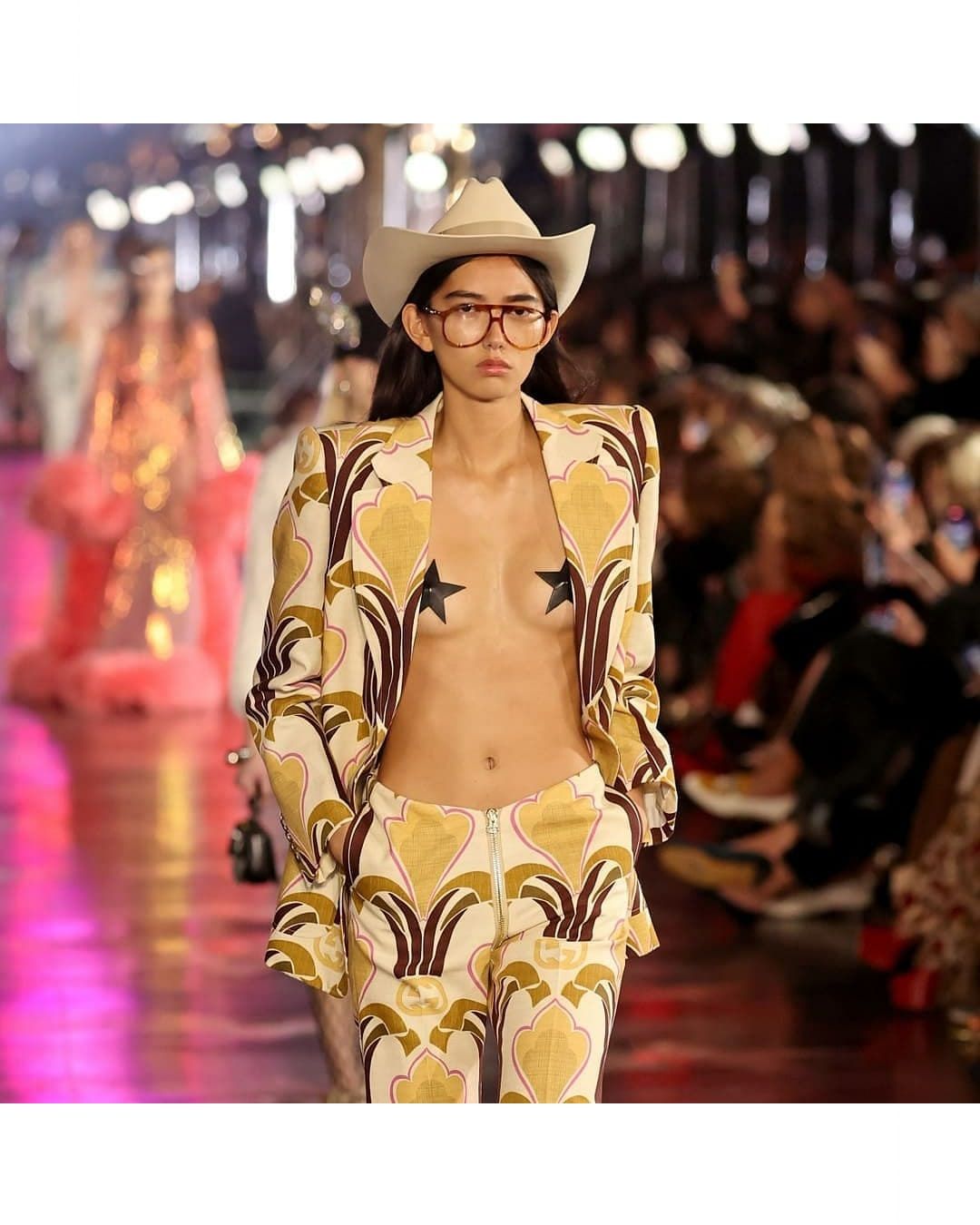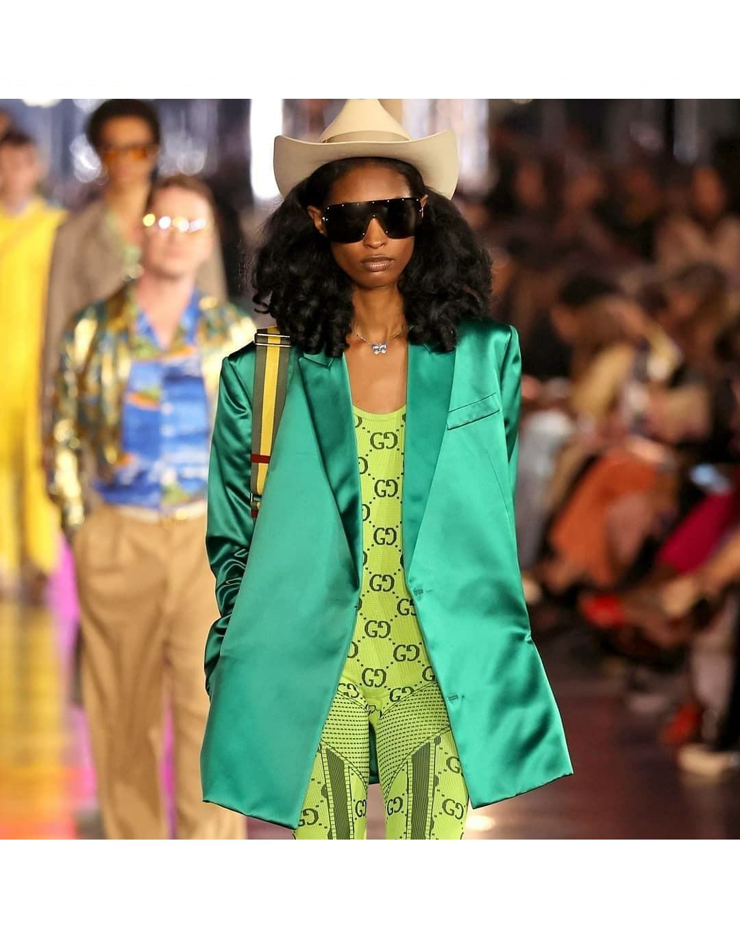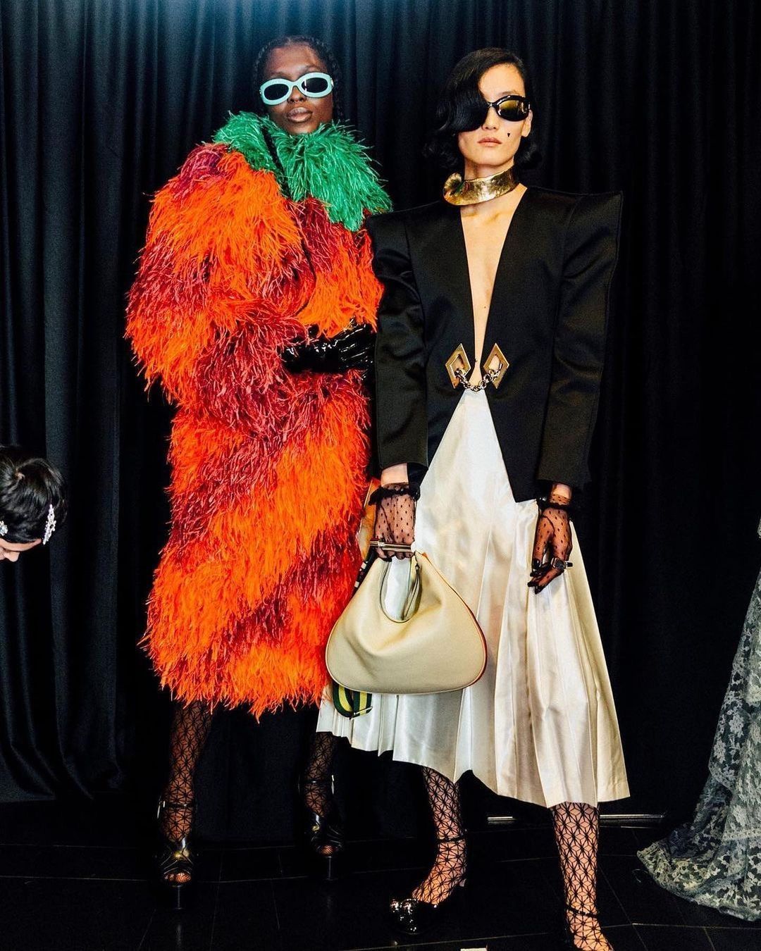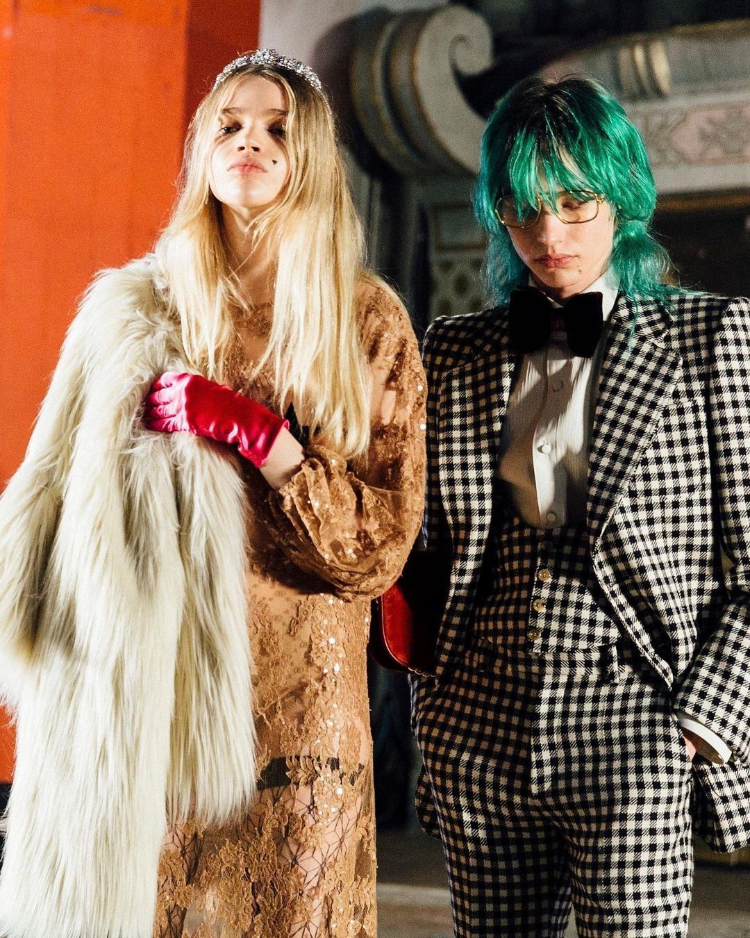 Gli accessori, come i capi della collezione, sono un affascinante ibrido tra la Hollywood più decadente e quella dei parties pieni di glitter e champagne. Ci sono diademi di cristalli e cappelli da cowboy; bellissimi gioielli che incorniciano il naso; copricapi flapper di catene dorate e altri che uniscono il famoso Peek-a-boo Hat di Elsa Schiaparelli con le maschere bondage; occhiali da sole di diverse forme dai cat-eye alla Joan Crawford a quelli da sci super coprenti perfetti per sfuggire ai paparazzi. La nuova collezione di Gucci attinge all’universo di references del designer, un mash-up in cui si fondono la Golden Age di Hollywood, "il pallore d’alabastro e la voce chiara di Marilyn Monroe, i capelli vellutati di Veronica Lake, il fascino seducente di Rock Hudson e l’accattivante potere di trasformazione di Kim Novak", ma anche i gay club degli anni ’70, gli idoli del rock’n roll e i freaks più glam mai visti in passerella.