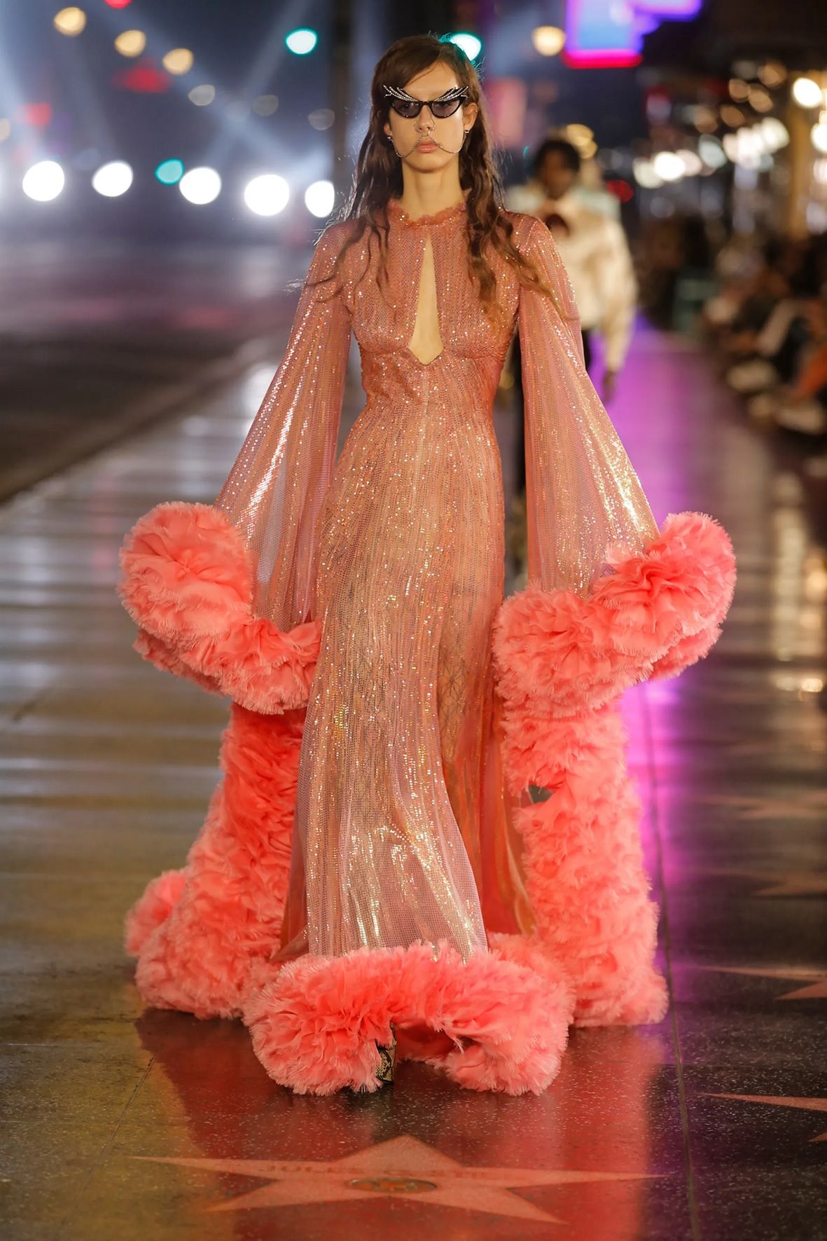 Martedì sera, Alessandro Michele ha presentato la collezione Gucci Love Parade all’Hollywood Boulevard, omaggiando le dive del cinema vintage e il fascino decadente e po’ kinky della Città degli Angeli. Jared Leto, Macaulay Culkin, Miranda July, St. Vincent e un cast eterogeneo di oltre 100 modelli uscivano uno dopo l’altro dal Chinese theatre, lo storico cinema che per decenni ha ospitato gli Academy Awards, calpestando l’iconico marciapiedi l’iconico dell’Hollywood Boulevard con le stelle e le impronte nel cemento di attori e attrici entrati nella leggenda. Tutto mentre le note di Björk riempivano l’aria e un front di amici del brand, che includeva tra gli altri Lizzo, Billie Eilish, Dakota Johnson, i Maneskin, Miley Cyrus, Diane Keaton, Olivia Wilde, Gwyneth Paltrow (in un vintage tuxedo. in un vintage Gucci by Tom Ford del 1996), applaudiva gli eccentrici look.