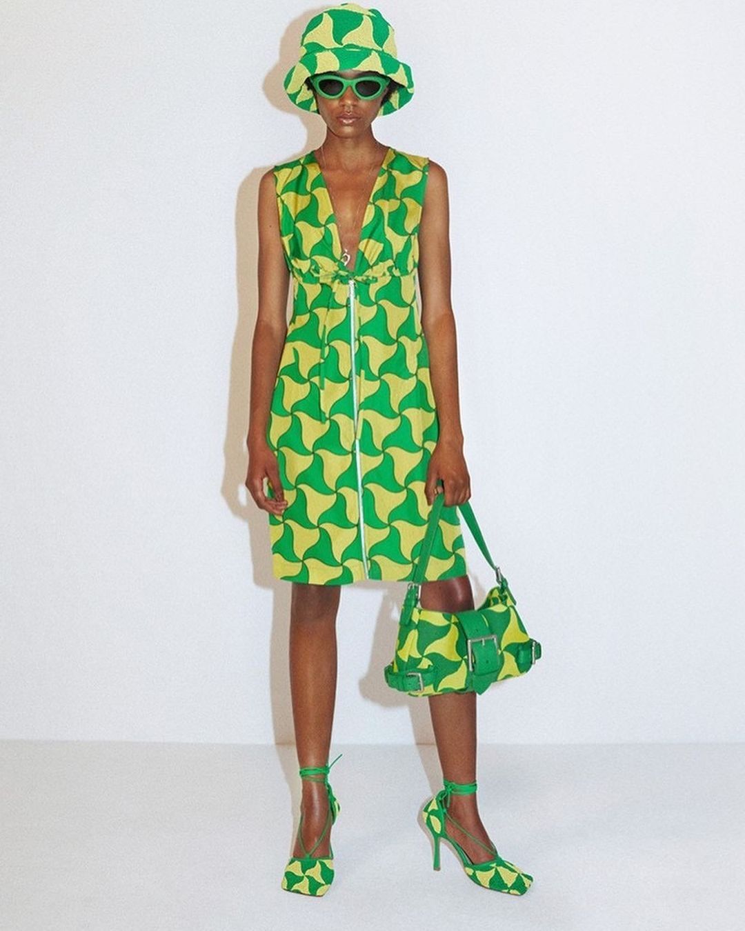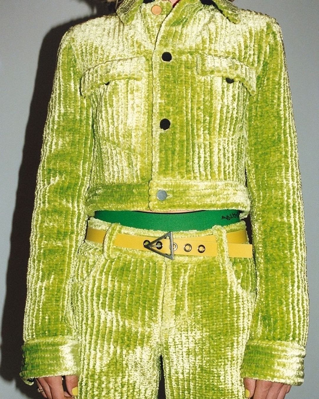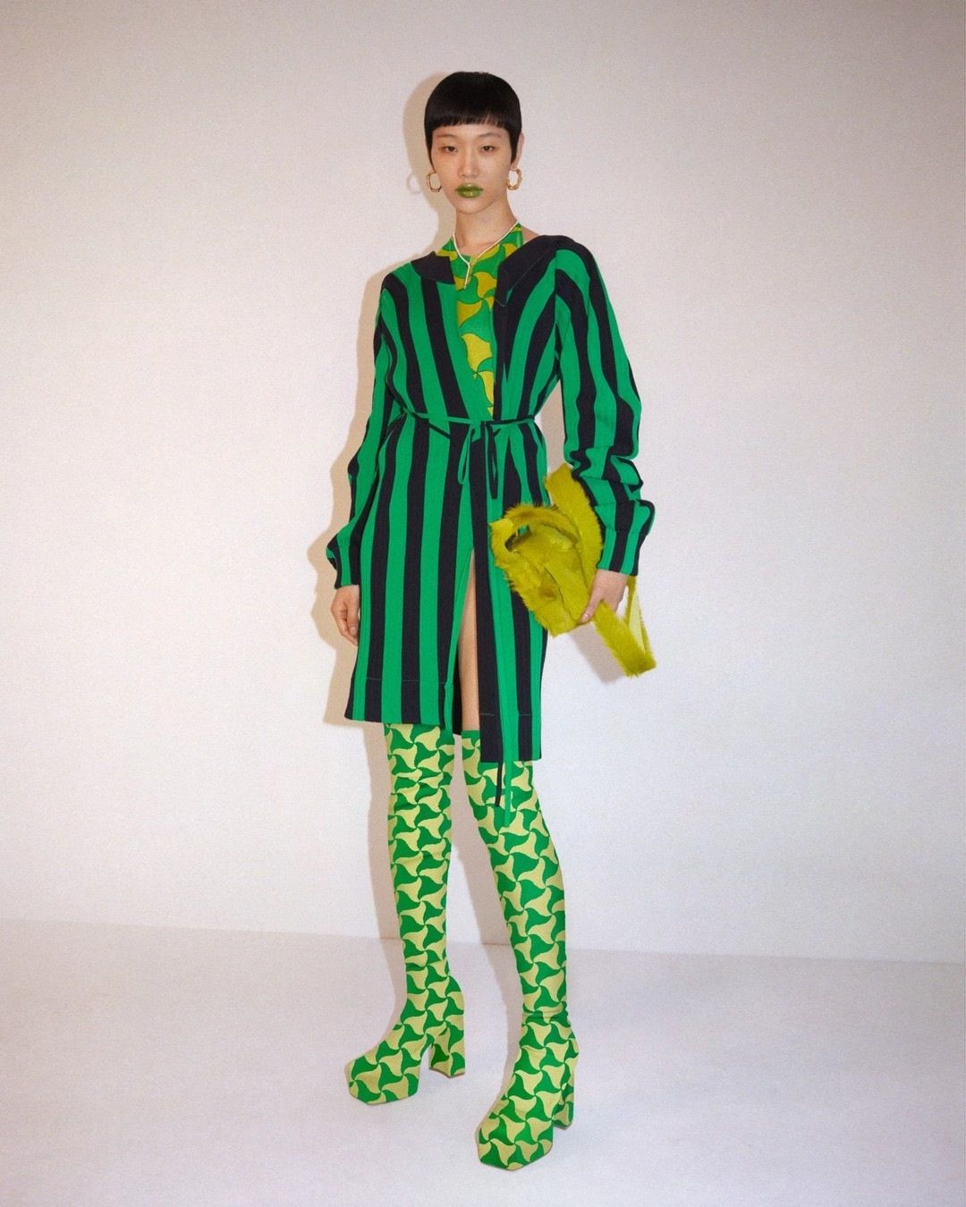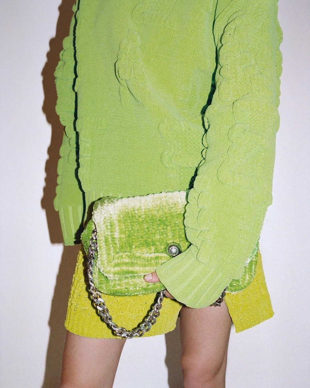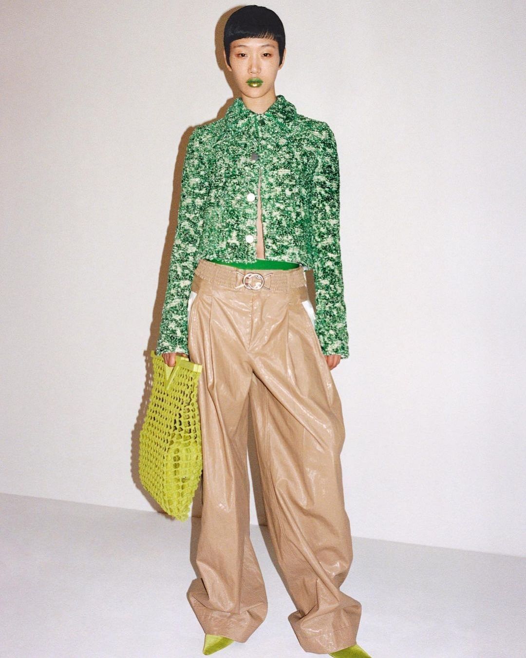 C’è una sorta di ottimismo edonista nei tanti look di Wardrobe 03. Si può leggere nei colori che vanno dal classico B&W che si accende poi di giallo, verde, arancione, rosso, rosa e azzurro; ma anche nei tessuti che comprendono denim, velluto a coste, tweed, shearling, ciniglia, cotta di maglia specchiata e pelle dal finish glossy. Il lusso è nei dettagli e nei ruggenti anni '20 versione 2.0 che reclamano un ritorno alla moda degno di tale nome. Le lavorazioni intricate caratteristiche del marchio non trasformano la pelle ma questa volta i cristalli in minidress e it-bag. Nelle cuciture verde acido che spiccano sui jeans, nei patter caledoscopici che regalano un twist funny ai cappotti in shearling, nei colori fluo che svecchiano il velluto a coste è chiaramente presente la firma del designer inglese che ha portato Bottega Veneta alla sua posizione odierna come brand iper-desiderato nel mercato del lusso.