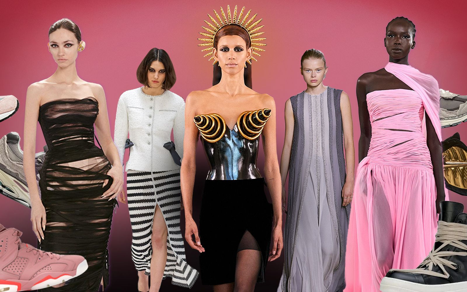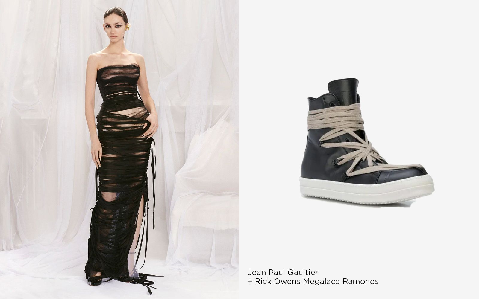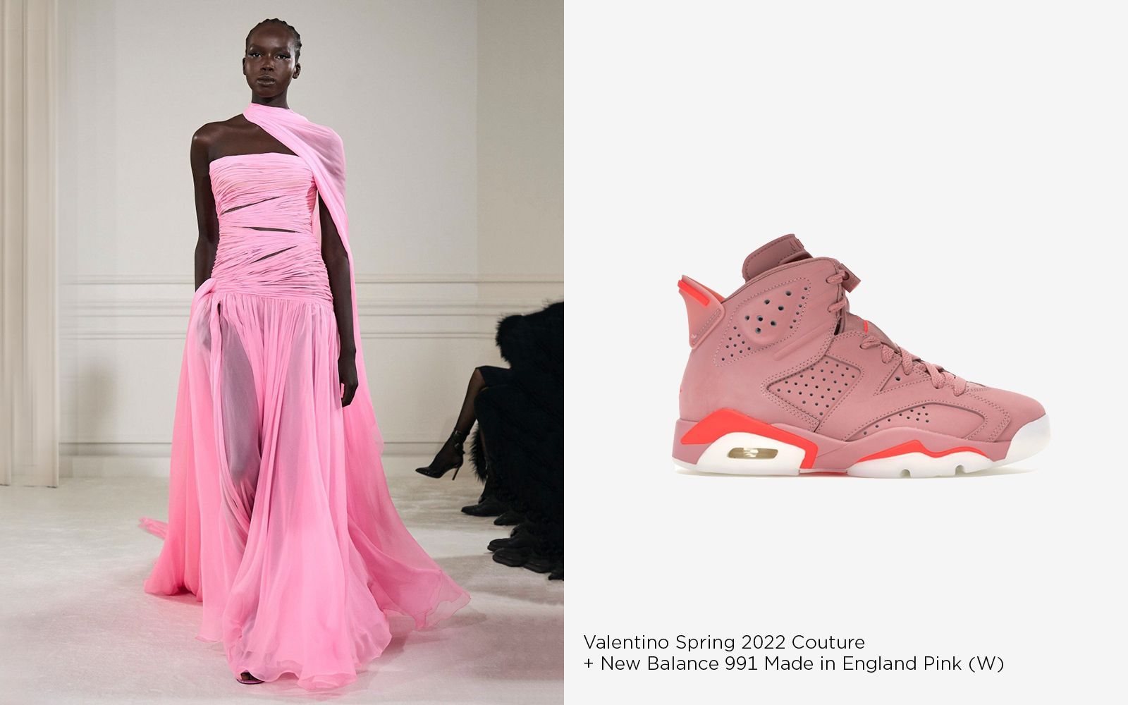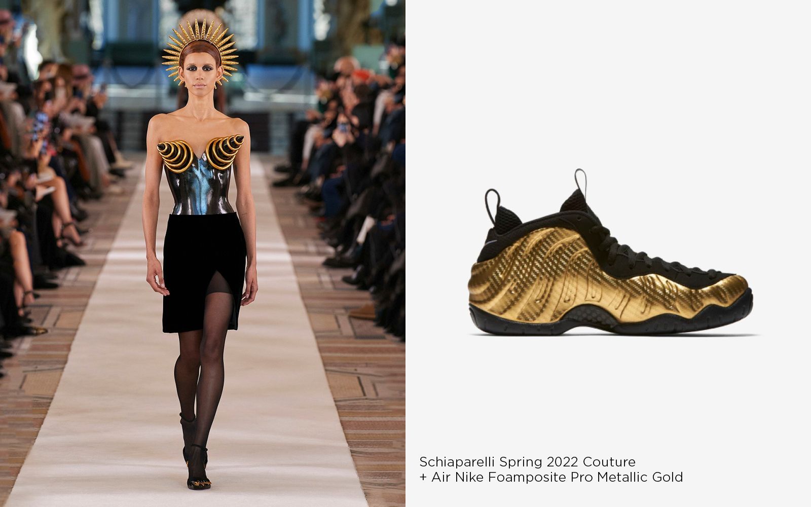 Le passerelle dell'Haute Couture di Parigi sono una fantasia di design che diventa realtà da fine 1800. Immagini astratte diventano abiti concreti grazie alla sapiente manifattura artigiana dei laboratori delle maison francesi, in cui vivono secoli di tecnica e studio delle forme del corpo. Con meno anni di rodaggio ma equivalente impatto visivo e culturale in un lasso di tempo decisamente inferiore, grazie anche al lavoro creativo e di significato di visionari come Virgil Abloh, anche le sneakers sono diventate un simbolo moderno di design nel footwear, che applicato al piede e al movimento rappresenta una preferenza studiata nei dettagli oltre che ad un mood e uno status, anche economico. Nonostante la differenza di contesti d'origine, sneakers e Haute Couture convivono perfettamente nello scenario dell'alta moda attuale alimentando la sfera aspirazionale del mondo della moda. Basandoci su un'associazione estetica libera abbiamo creato un ponte visivo tra le sneakers del momento e le creazioni di Schiaparelli, Dior, Chanel, Valentino e Jean Paul Gaultier che hanno sfilato dal 22 al 27 gennaio 2022, creando un moodboard a cui attingere per stimolare la creatività.