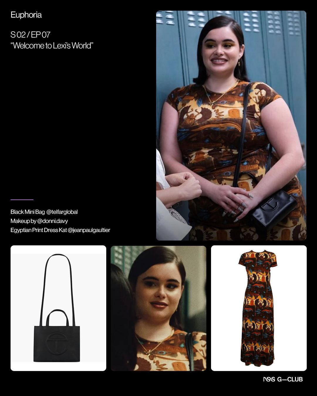 L'anima fashion di Kat è sempre più evidente: i suoi look avantgarde e ricercati, sempre in colori cupi e a contrasto con la carnagione chiarissima dell'attrice Barbie Ferreira non deludono mai. In questo episodio di è decisamente superata, indossando un capo vintage di Jean Paul Gaultier vintage, l'Egyptian Dress, in combo con una Telfar Bag Mini in colorazione nera. Ma quando gli spotlight del teatro si appoggiano sui suoi capelli perfetti illuminando il Vivienne Westwood Portrait Corset Flame Print in Arancione l'applauso se lo merita tutto, anche se non direttamente a lei.