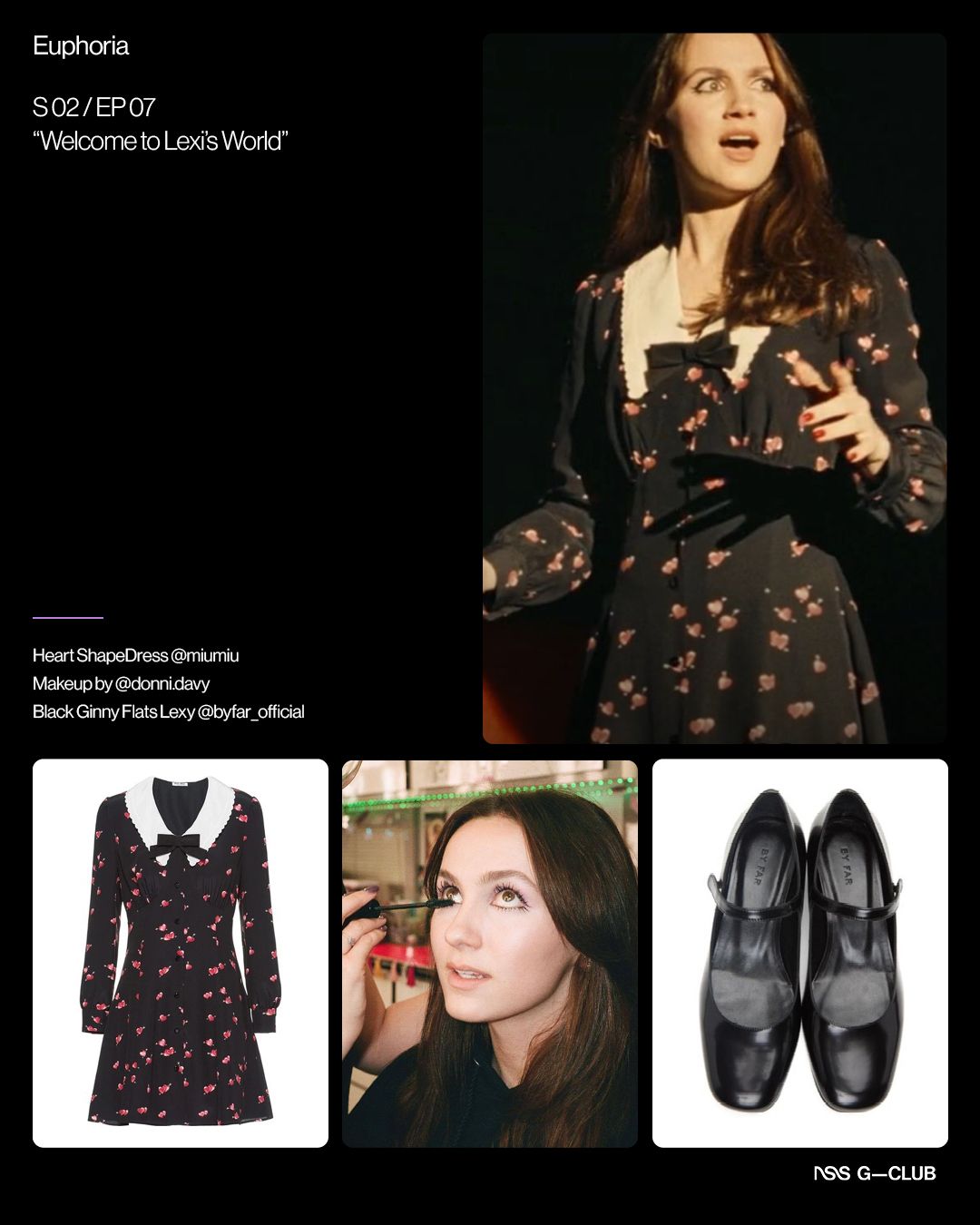 "Lexi sei una gangster" urla Maddy alla fine di una scena epica della pièce teatrale che obbliga tutta la Easthighland High a guardare negli occhi la tossicità delle dinamiche dei ragazzi del gruppo sui cui è incentrata la storia. Il suo debutto la vede agitata, nervosa, felice e allo stesso tempo spaventata di come verrà recepito il frutto del suo lavoro. Indossa un vestito in Velluto Nero in Prairie Cotton di Batsheva e un paio di Mary Jane basse lucide di By Far. Mentre sale sul palco il vestito ad A Miu Miu a cuoricini con colletto è l'outfit giusto per debuttare con stile. Completa il look un eyeliner con 3 codine che amplia l'occhio.