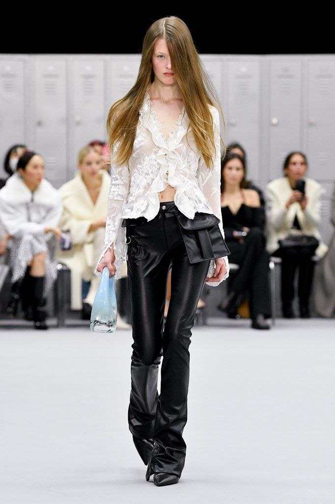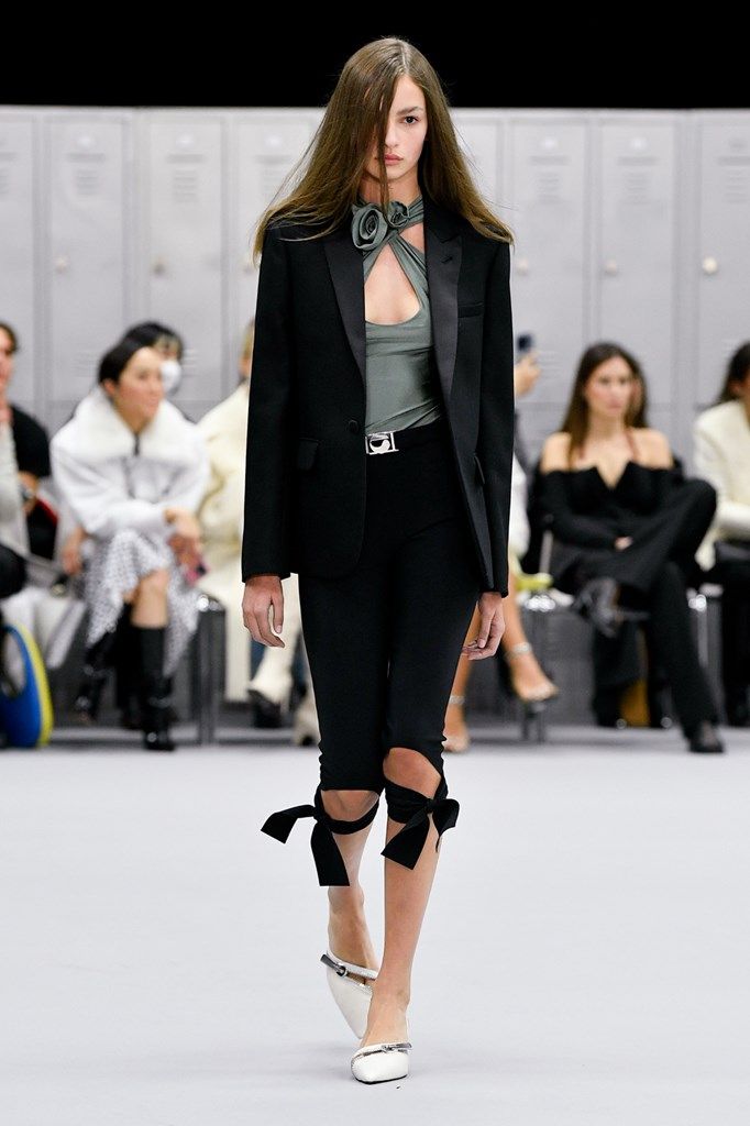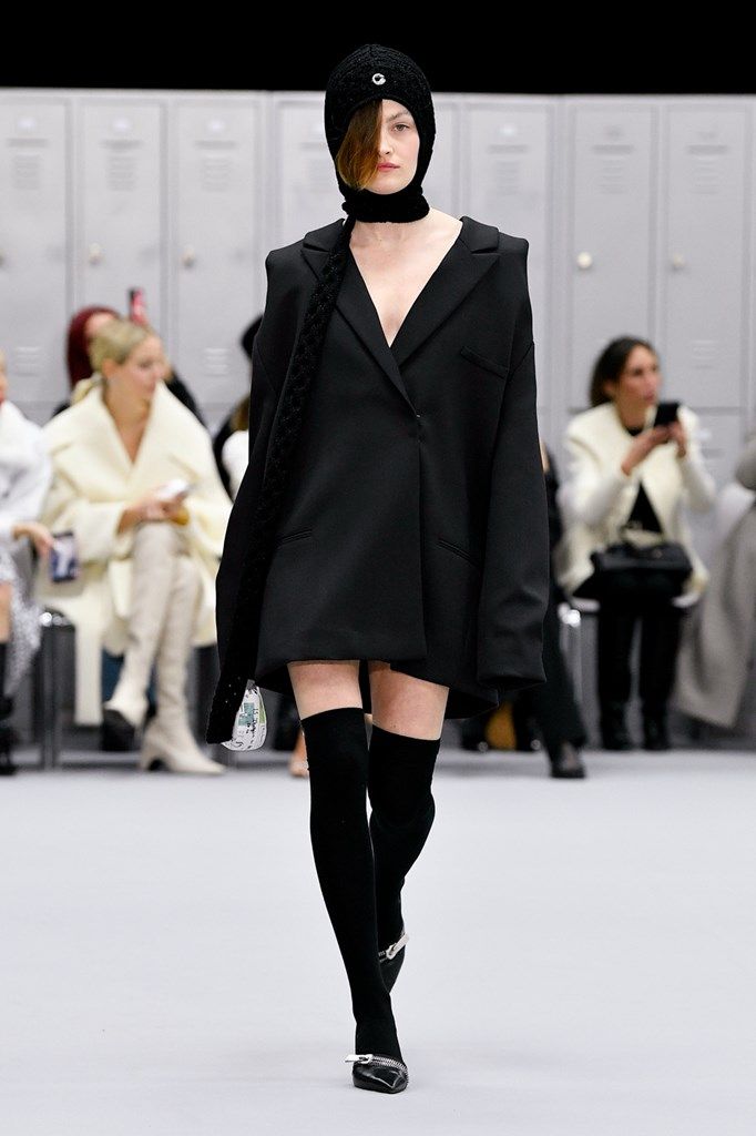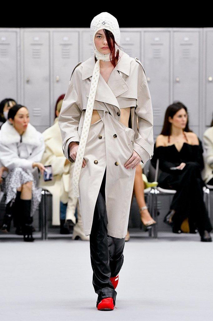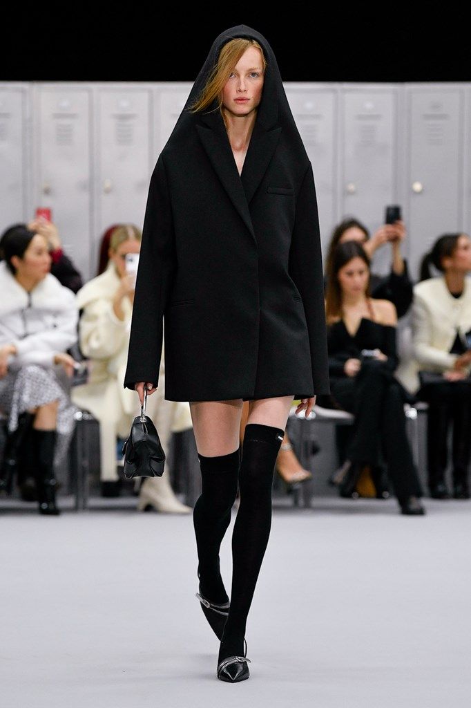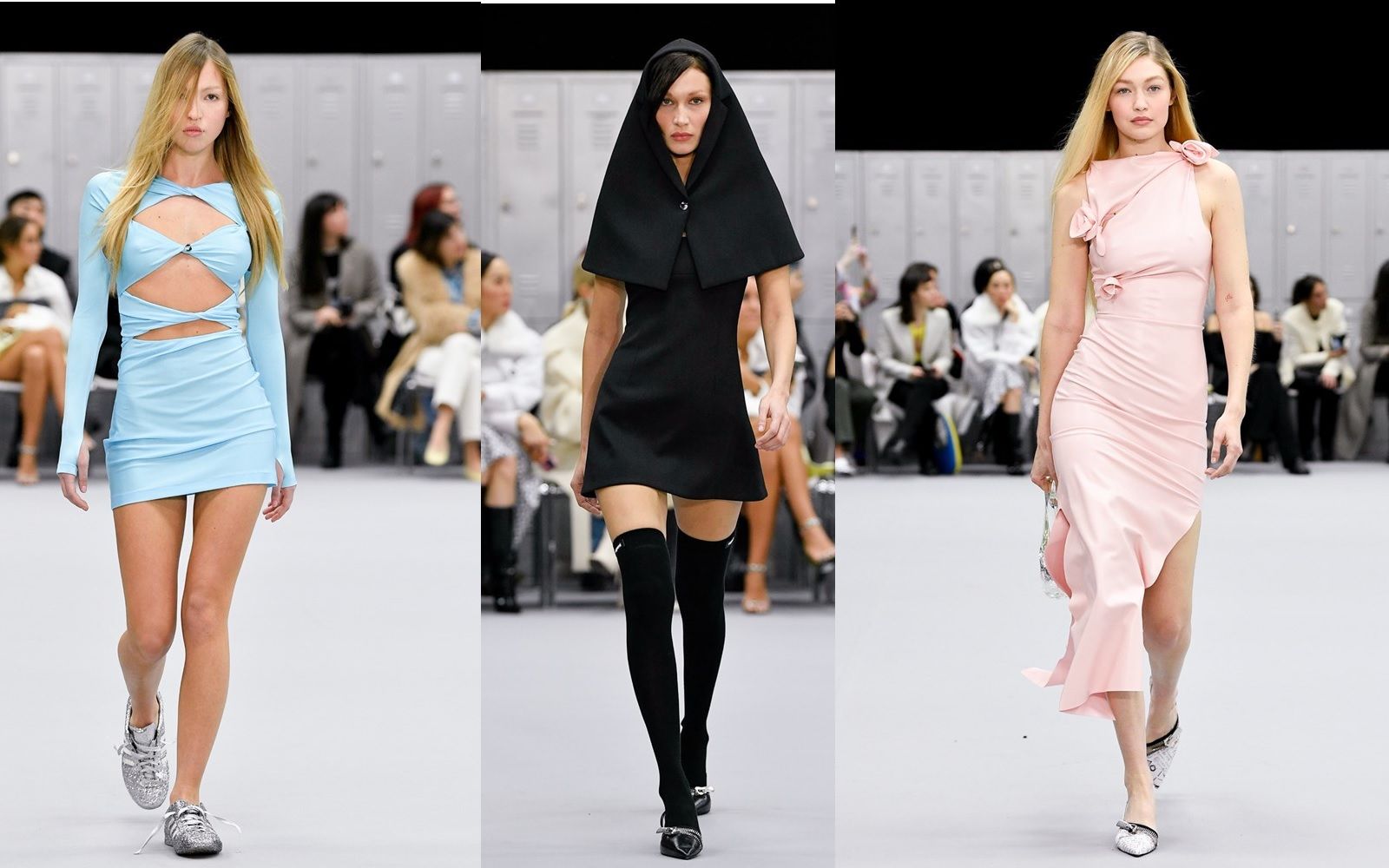 In passerella, circondate da una cortina di armadietti stile high-school, si alternano Gigi e Bella Hadid, Lila Moss e Paloma Elsesser, che, stringendo tra le mani una versione in vetro soffiato della famosa Swipe bag, indossano i capi della collezione autunno/inverno 2022. Per la prossima stagione fredda, Arnaud Vaillant e Sébastien Meyer giocano con forme e tagli, mostrando una nuova maturità che ne conferma il talento. Giacche, trench e minidress si annodano formando dettagli cut-out che lasciano la pelle nuda, mentre i body in maglia si arricchiscono di cappucci simili a balaclava che riecheggiano alle creazioni di Cristobal Balenciaga e si trasformano in abitini minimal e cool. Sulle hoodie spuntano graziose orecchiette da gatto, mentre gli item in pelle hanno comodi tasconi/marsupi dove riporre piccoli oggetti. Non mancano i set minigonna- micro top che confermano l’influenza del famoso set di Miu Miu né gli abiti, trasparenti e glitterati o attillati e midi, dal mood anni ‘90, che seguono le linee del corpo.