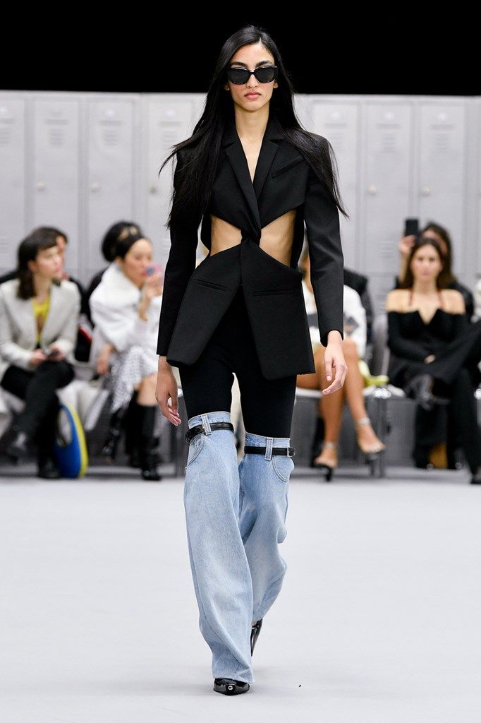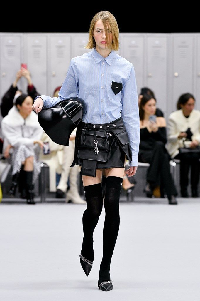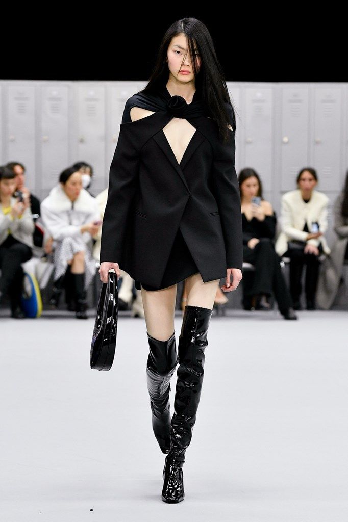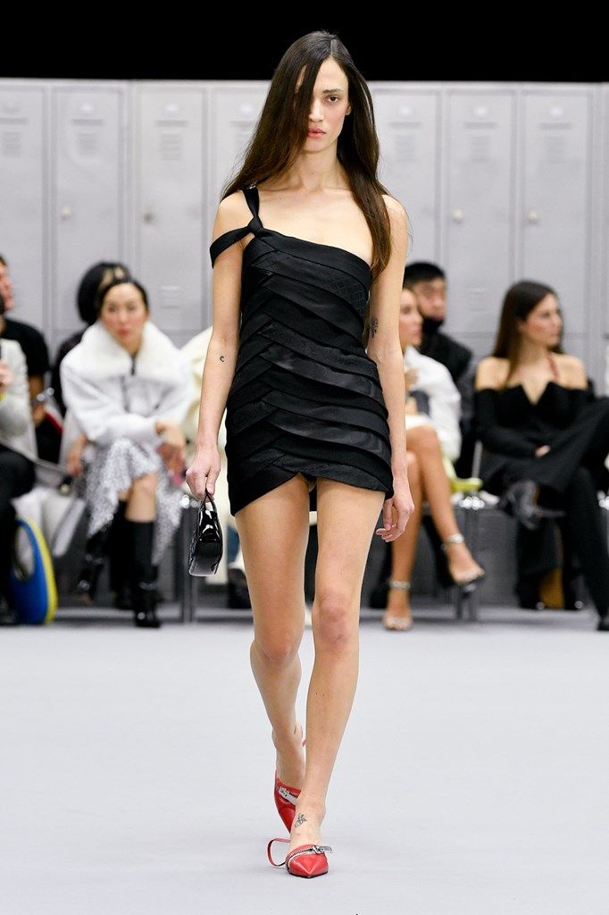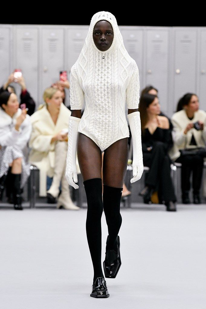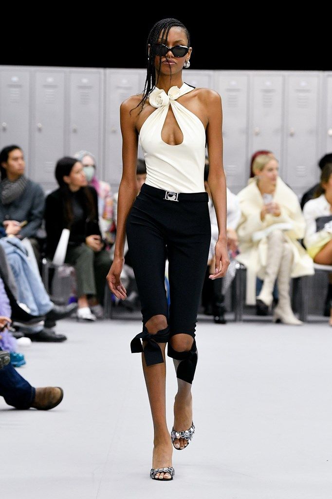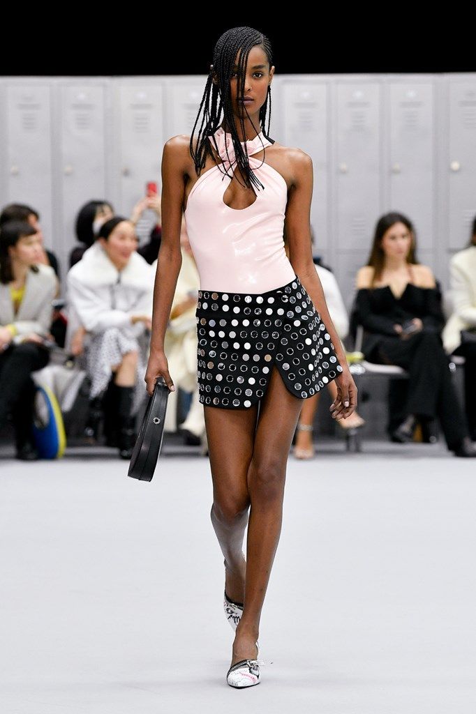 In passerella, circondate da una cortina di armadietti stile high-school, si alternano Gigi e Bella Hadid, Lila Moss e Paloma Elsesser, che, stringendo tra le mani una versione in vetro soffiato della famosa Swipe bag, indossano i capi della collezione autunno/inverno 2022. Per la prossima stagione fredda, Arnaud Vaillant e Sébastien Meyer giocano con forme e tagli, mostrando una nuova maturità che ne conferma il talento. Giacche, trench e minidress si annodano formando dettagli cut-out che lasciano la pelle nuda, mentre i body in maglia si arricchiscono di cappucci simili a balaclava che riecheggiano alle creazioni di Cristobal Balenciaga e si trasformano in abitini minimal e cool. Sulle hoodie spuntano graziose orecchiette da gatto, mentre gli item in pelle hanno comodi tasconi/marsupi dove riporre piccoli oggetti. Non mancano i set minigonna- micro top che confermano l’influenza del famoso set di Miu Miu né gli abiti, trasparenti e glitterati o attillati e midi, dal mood anni ‘90, che seguono le linee del corpo.