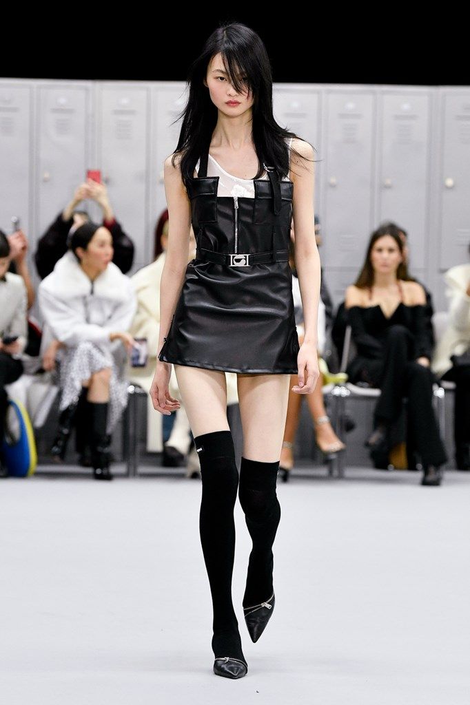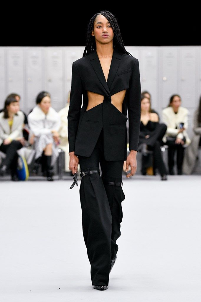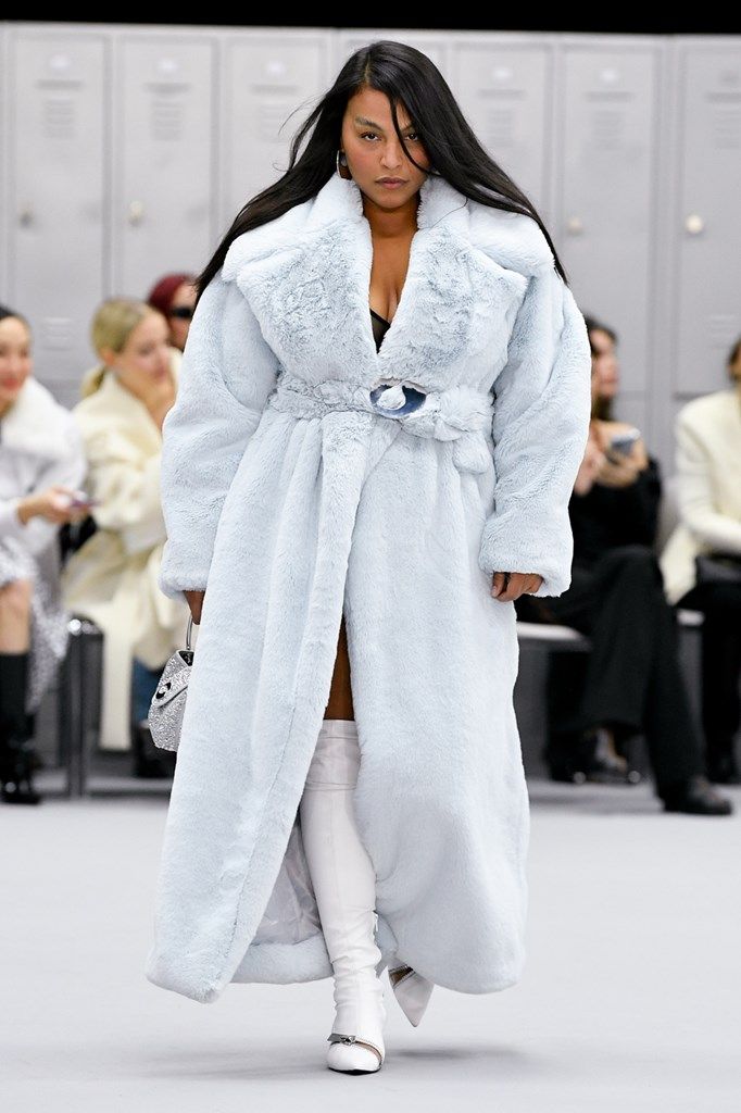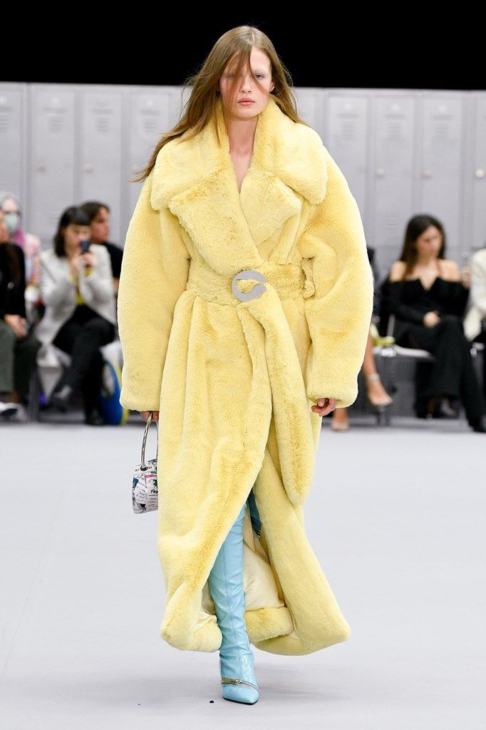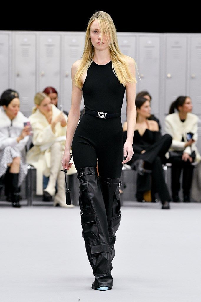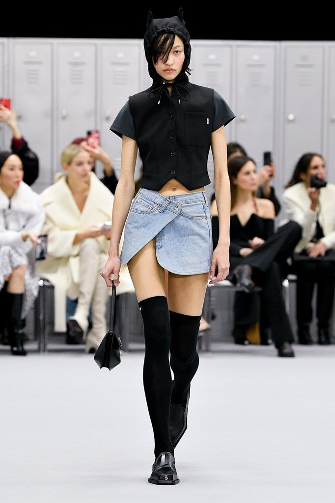 In passerella, circondate da una cortina di armadietti stile high-school, si alternano Gigi e Bella Hadid, Lila Moss e Paloma Elsesser, che, stringendo tra le mani una versione in vetro soffiato della famosa Swipe bag, indossano i capi della collezione autunno/inverno 2022. Per la prossima stagione fredda, Arnaud Vaillant e Sébastien Meyer giocano con forme e tagli, mostrando una nuova maturità che ne conferma il talento. Giacche, trench e minidress si annodano formando dettagli cut-out che lasciano la pelle nuda, mentre i body in maglia si arricchiscono di cappucci simili a balaclava che riecheggiano alle creazioni di Cristobal Balenciaga e si trasformano in abitini minimal e cool. Sulle hoodie spuntano graziose orecchiette da gatto, mentre gli item in pelle hanno comodi tasconi/marsupi dove riporre piccoli oggetti. Non mancano i set minigonna- micro top che confermano l’influenza del famoso set di Miu Miu né gli abiti, trasparenti e glitterati o attillati e midi, dal mood anni ‘90, che seguono le linee del corpo.