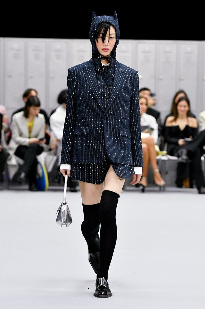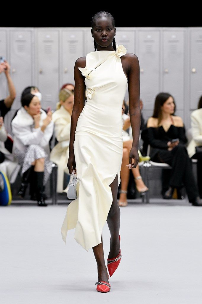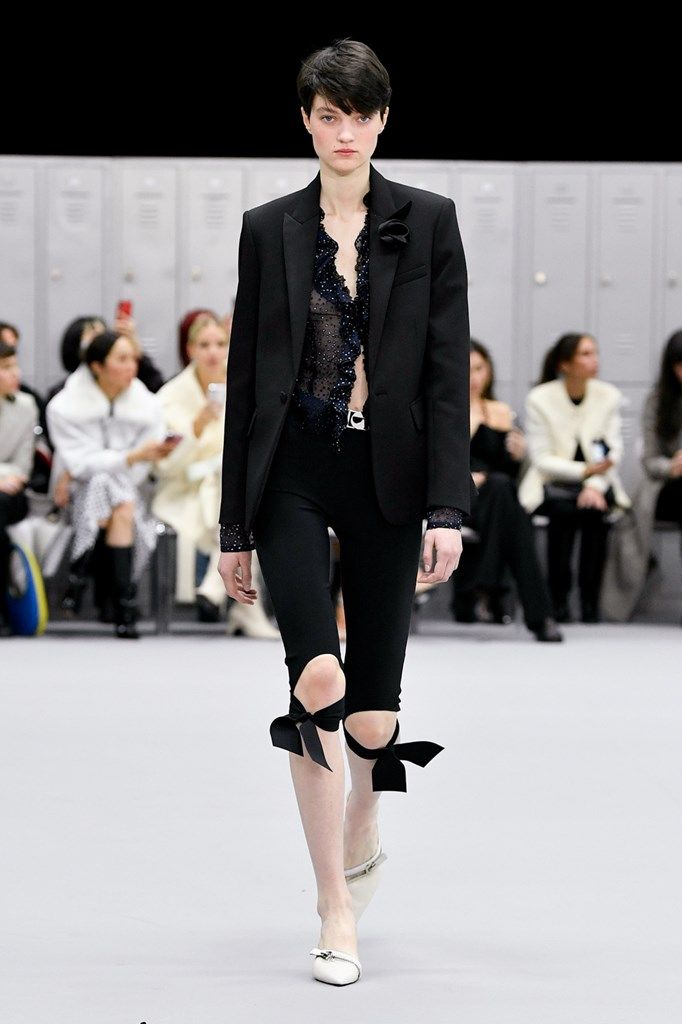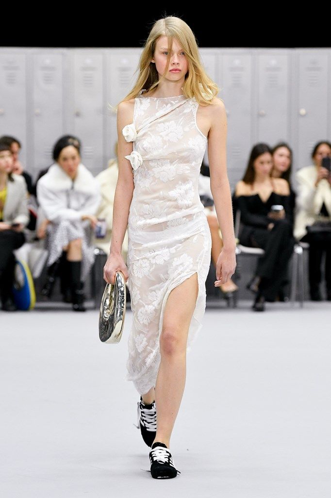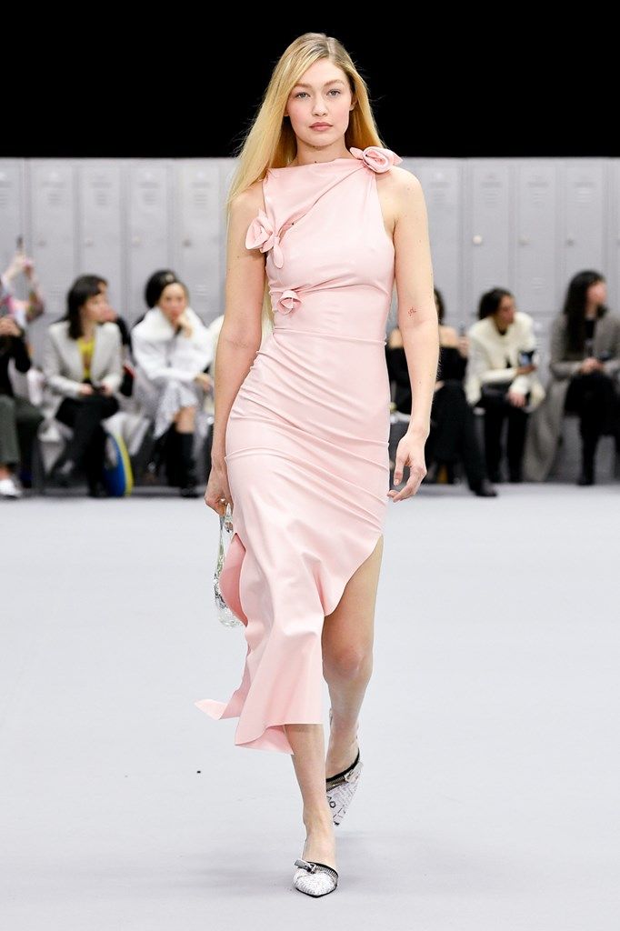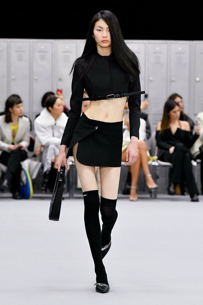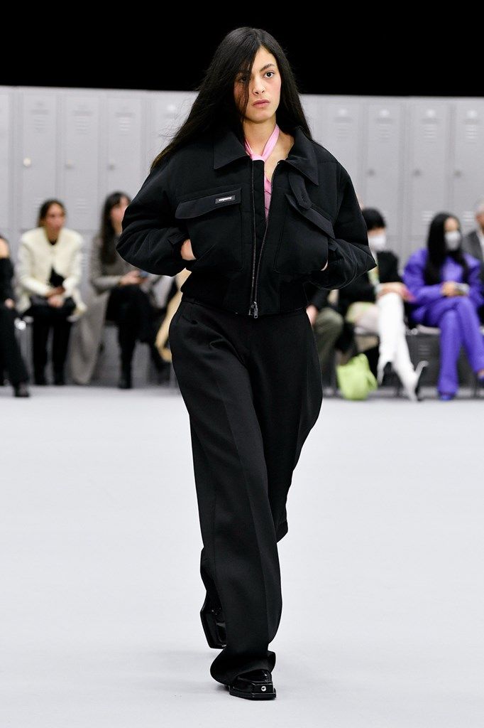 In passerella, circondate da una cortina di armadietti stile high-school, si alternano Gigi e Bella Hadid, Lila Moss e Paloma Elsesser, che, stringendo tra le mani una versione in vetro soffiato della famosa Swipe bag, indossano i capi della collezione autunno/inverno 2022. Per la prossima stagione fredda, Arnaud Vaillant e Sébastien Meyer giocano con forme e tagli, mostrando una nuova maturità che ne conferma il talento. Giacche, trench e minidress si annodano formando dettagli cut-out che lasciano la pelle nuda, mentre i body in maglia si arricchiscono di cappucci simili a balaclava che riecheggiano alle creazioni di Cristobal Balenciaga e si trasformano in abitini minimal e cool. Sulle hoodie spuntano graziose orecchiette da gatto, mentre gli item in pelle hanno comodi tasconi/marsupi dove riporre piccoli oggetti. Non mancano i set minigonna- micro top che confermano l’influenza del famoso set di Miu Miu né gli abiti, trasparenti e glitterati o attillati e midi, dal mood anni ‘90, che seguono le linee del corpo.