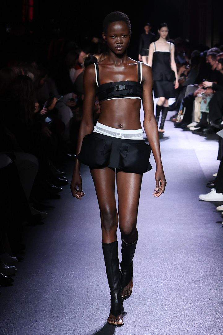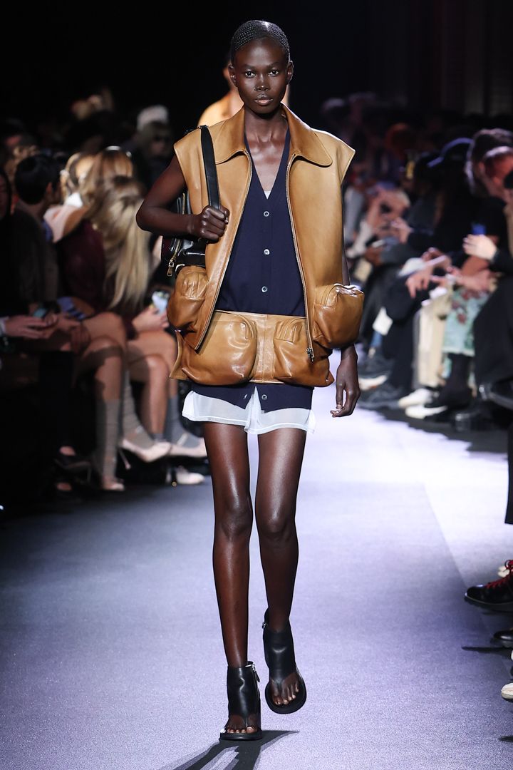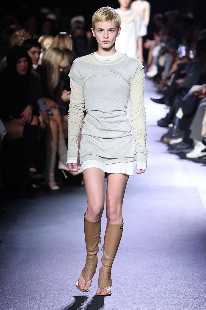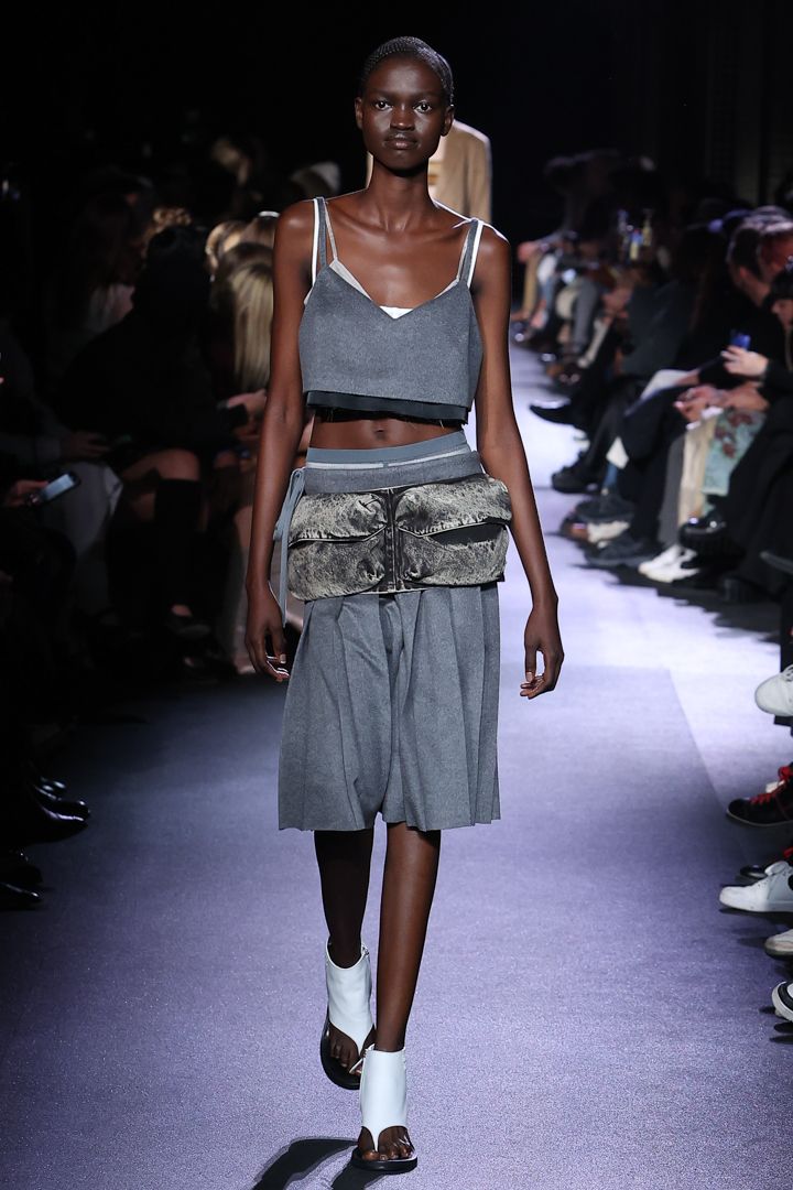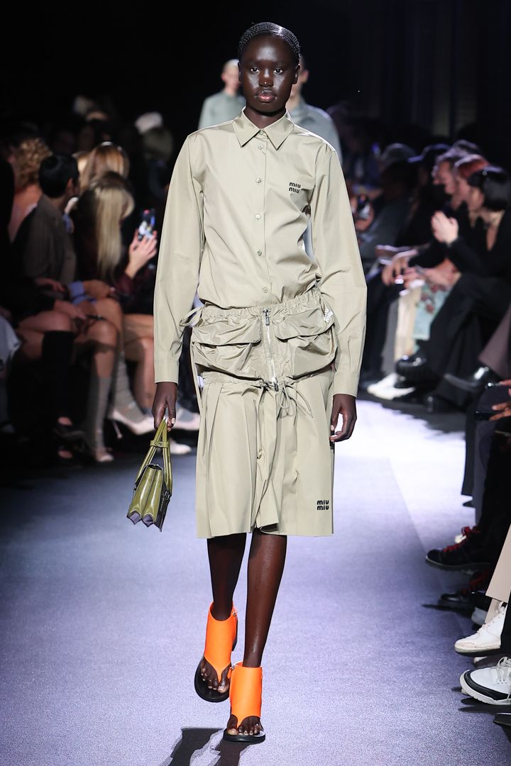 Nella sala del Palais d’Iéna, allestita dallo studio Amo in collaborazione con l'artista Shuang, va in scena la collezione SS23 di Miu Miu. Miuccia Prada, come nelle ultime stagioni, continua a rileggere e decostruire i codici della moda Y2K, flirtando con sensualità, utilitarismo e codici borghesi. In passerella, indossati da un cast che include FKA Twigs, Bella Hadid, Emily Ratajkowski, Miranda July ed Ethel Cain, ritroviamo minigonne a vita bassa dagli orli sfilacciati e lunghezza di pochi centimetri maglioncini; gonne a pieghe; minidress in felpa sovrapposti; camicie; top così ultra cropped da evolversi in semplici bra; giacche sartoriali e cappotti che alternano tessuto tecnico, pelle e denim lavato. Tra sovrapposizioni, dettagli scintillanti e trasparenze, il vero accessorio must-have sono le tasche che arricchiscono ogni capo, imitando una sorta di bisaccia o marsupio: dalle gonne plissettate alla mini, dalle giacche in pelle alle longuette in denim. Mentre ai piedi spiccano calzature ibride che uniscono la forma di stivali in morbida pelle, alti fino al ginocchio, con la punta di un infradito.