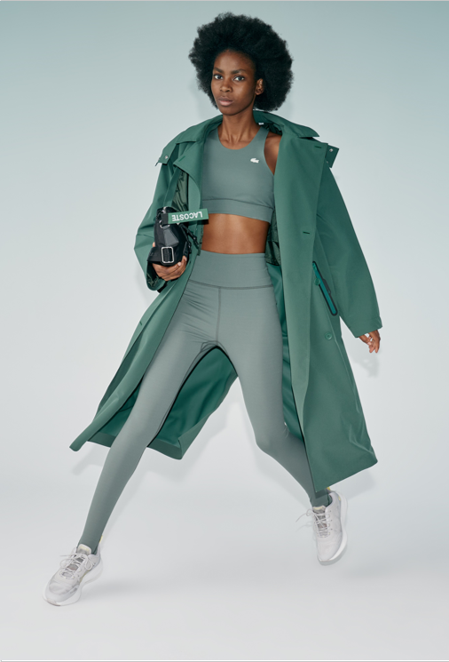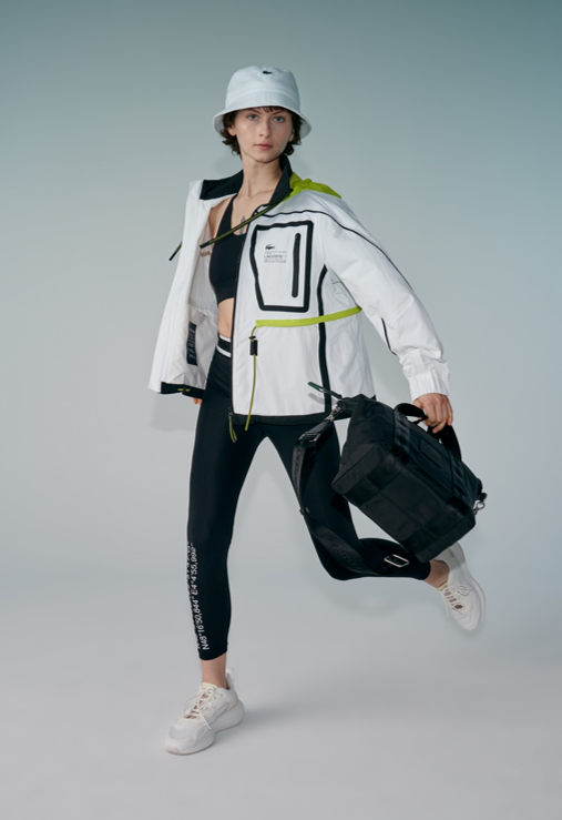 I capi della collezione uniscono la praticità e la funzionalità dell'abbigliamento sportivo con l'attenzione ai dettagli e ai materiali propria del mondo della moda, si compongono di tessuti traspiranti, leggeri e tecnici che hanno un fit perfetto sul corpo grazie ai lavori sulla forma studiati ad hoc. I design sono pensati per abbracciare il comfort, diventando la scelta perfetta da indossare durante giornate frenetiche ma piene di energia: il trench in piquè a doppio strato e la giacca oversize garantiscono leggerezza, impermeabilità e protezione, mentre il completo da yoga e la tuta rosa accennano al mondo dello sport ma sono iper-versatili per essere mixati con capi sartoriali. L'elemento del taglio deciso dell'estetica Lacoste rimane sulle pieghe della gonna da tennis, capo iconico del brand che evolve oltrepassando i confini del campo di terra rossa fino ad atterrare sull'asfalto di qualsiasi metropoli senza forzatura stilistica grazie alle nuove shade acide e audaci come il giallo neon e il viola acceso.