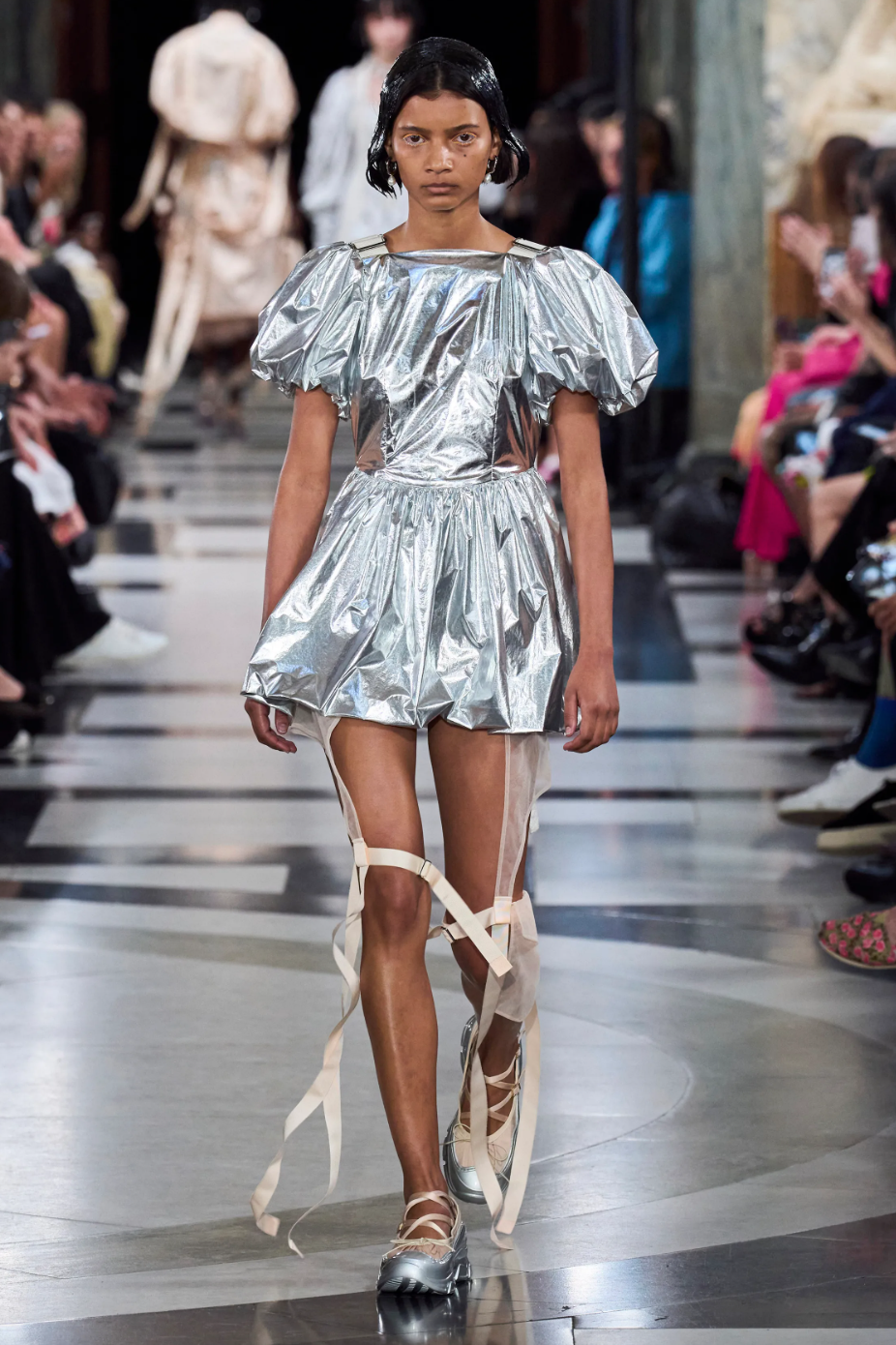 Bagliori metallici attraversano le nuove collezioni e i tessuti più inaspettati. Se metallico faceva rima con paillettes e lamè, ora sono le texture più corpose ad essere spalmate, traforate, lavorate. Tra gli esempi più lampanti: Chloè ricopre Gigi Hadid con una rete a maxi trafori, Altuzarra sceglie loro per il top e la gonna multi plissetata, Simone Rocha gioca coi volumi e con un effetto marcatamente glossy. Oro scintillante per la mini bag di Coperni, maxi fiocchi silver per i sandali di Loewe, paillettes a perdifiato per il body super sgambato di LaQuan Smith.