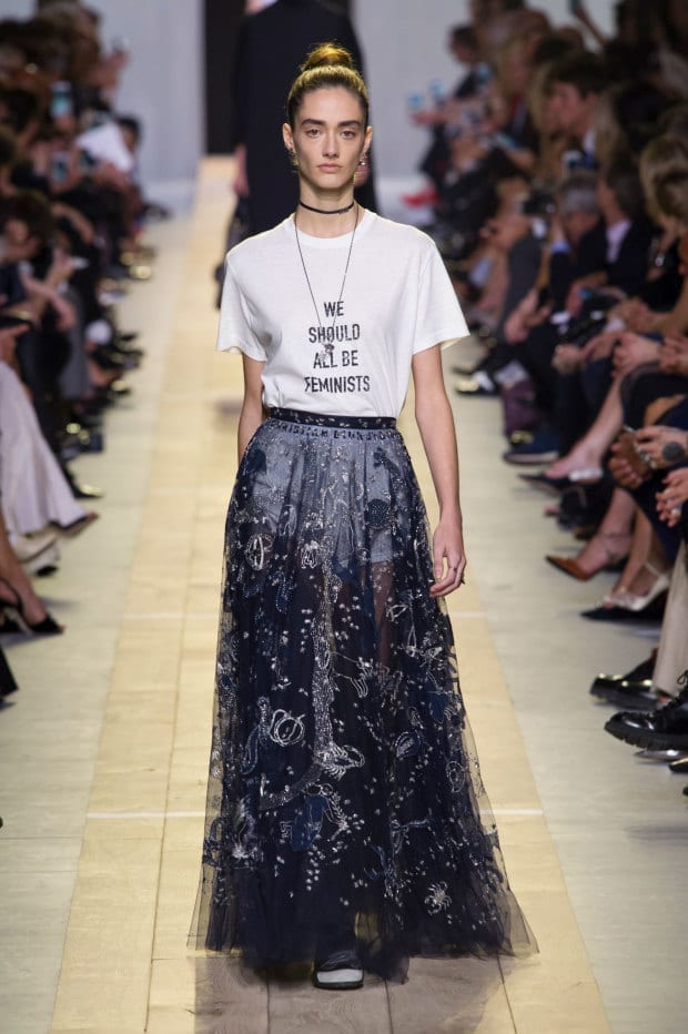 C’è da dire che di questa Paris Fashion Week va premiata l’originalità. Gli show hanno tratto ispirazione da donne di epoche diverse (Gabriela Hearst guardava ad Artemisa Gentileschi, Maria Grazia Chiuri a Catherine Dior), prendendo le distanze dal femminismo anni ’70 da cui altri designer avevano già precedentemente ripescato l'immaginario, come Karl Lagerfeld, che aveva replicato i cartelloni di protesta delle attiviste “brucia reggiseni” del 1968 sulla passerella della collezione Spring Summer 2015 di Chanel. Inutile sottolineare che le modelle mandate in passerella dagli stilisti, sia da Lagerfeld nel 2015 che da Hearst e Chiuri questa settimana, sono convezionalmente belle, alte e magre, e quasi tutte bianche. E che il pubblico a cui sono rivolte le collezioni, oltre a quello social, è soprattutto quello che compra, ossia un gruppo ristretto di donne privilegiate che hanno già tratto vantaggio dal femminismo, e che sono già “empowered.” Usando la narrativa femminista, gli abiti vengono pubblicizzati come scusa per acquisti guilt-free, un meccanismo che valorizza un successo materialista che rilega un intero movimento ideologico a un solo look, e non a conseguimenti professionali o personali, suggerendo che il successo delle donne si può misurare solo in base al loro aspetto: se hai la power-suit, sei a posto.
