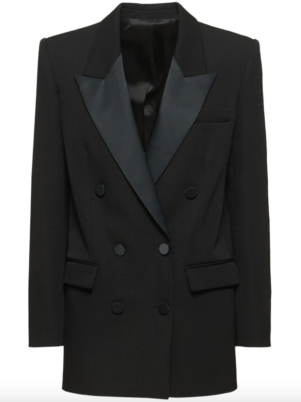 Look notturno composto da pantaloni super preziosi di Prada, reggiseno essenziale di Eres e blazer doppiopetto con revers in raso di Isabel Marant.