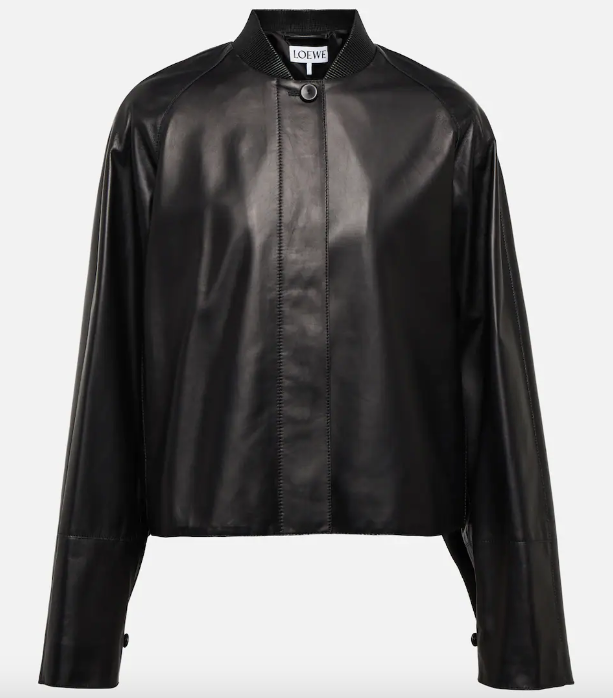 Per calarsi con grinta nelle soirèee, la giacca di pelle di ordinanza di Loewe, il body black di Alix NYC e i collant in rete effetto maculato di Alaïa.