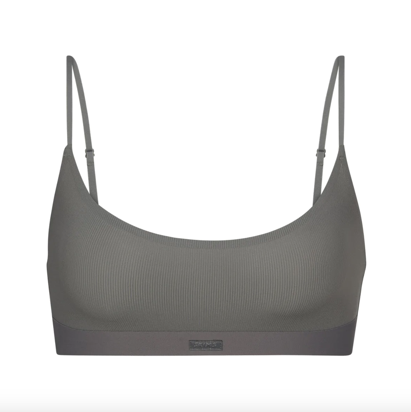 Top e panties di Skims da portare con la camicia, aperta, in denim delavè di Off White. Calcolando che l’abbottonatura non segue regole, tutto è permesso.