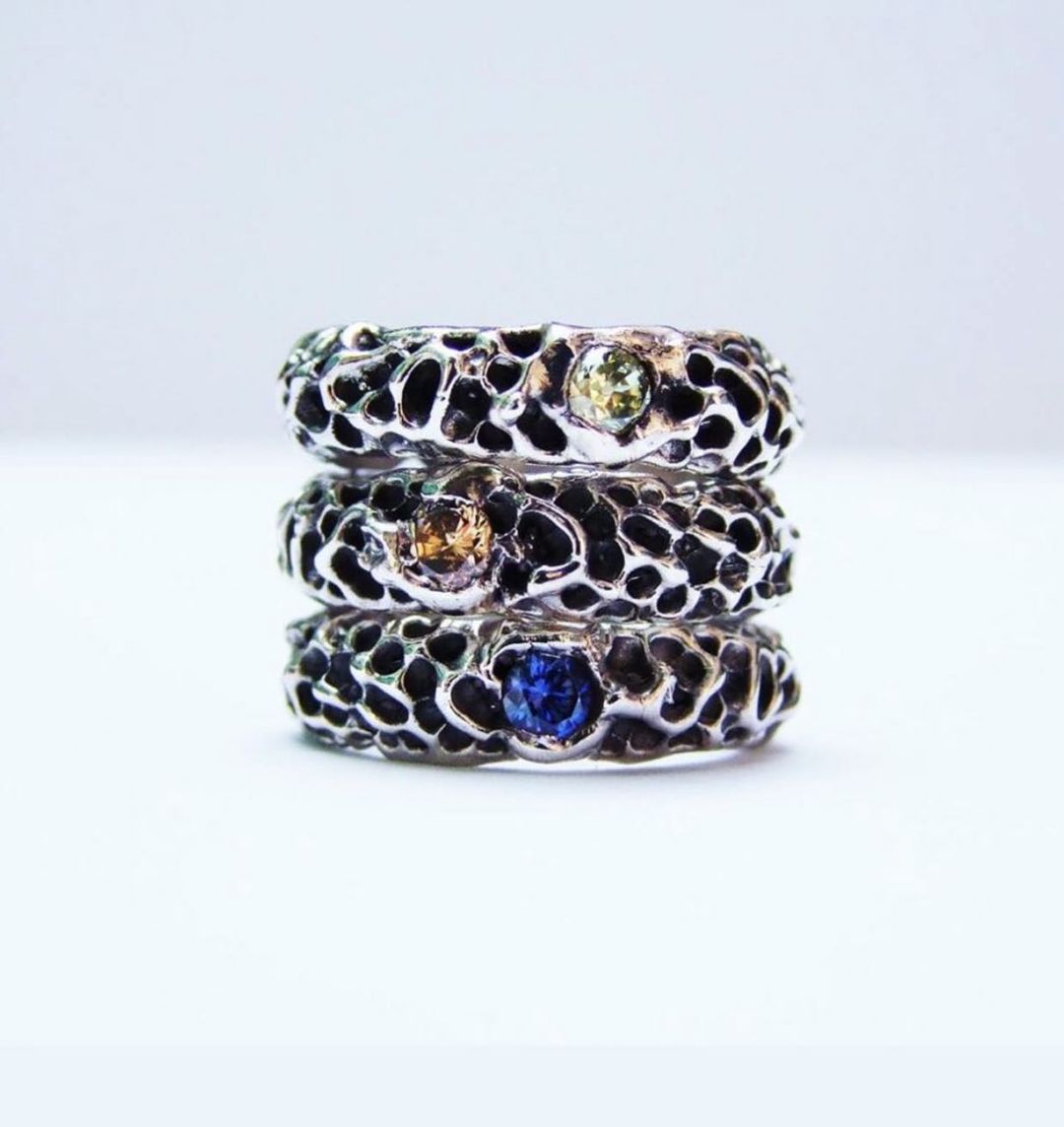 Gioielli unici non convenzionali sono quelli creati da Madina Visconti, designer rapita e affascinata dalla bellezza della natura tanto da aver scelto di riflettere l’unicità di fiori, foglie, rami e stelle in modo sinuoso, non prevedibile, ma armonico e proporzionato. I suoi gioielli sono organici, materici, lavorati con la tecnica della fusione a cera persa e colorati da smalti bold.