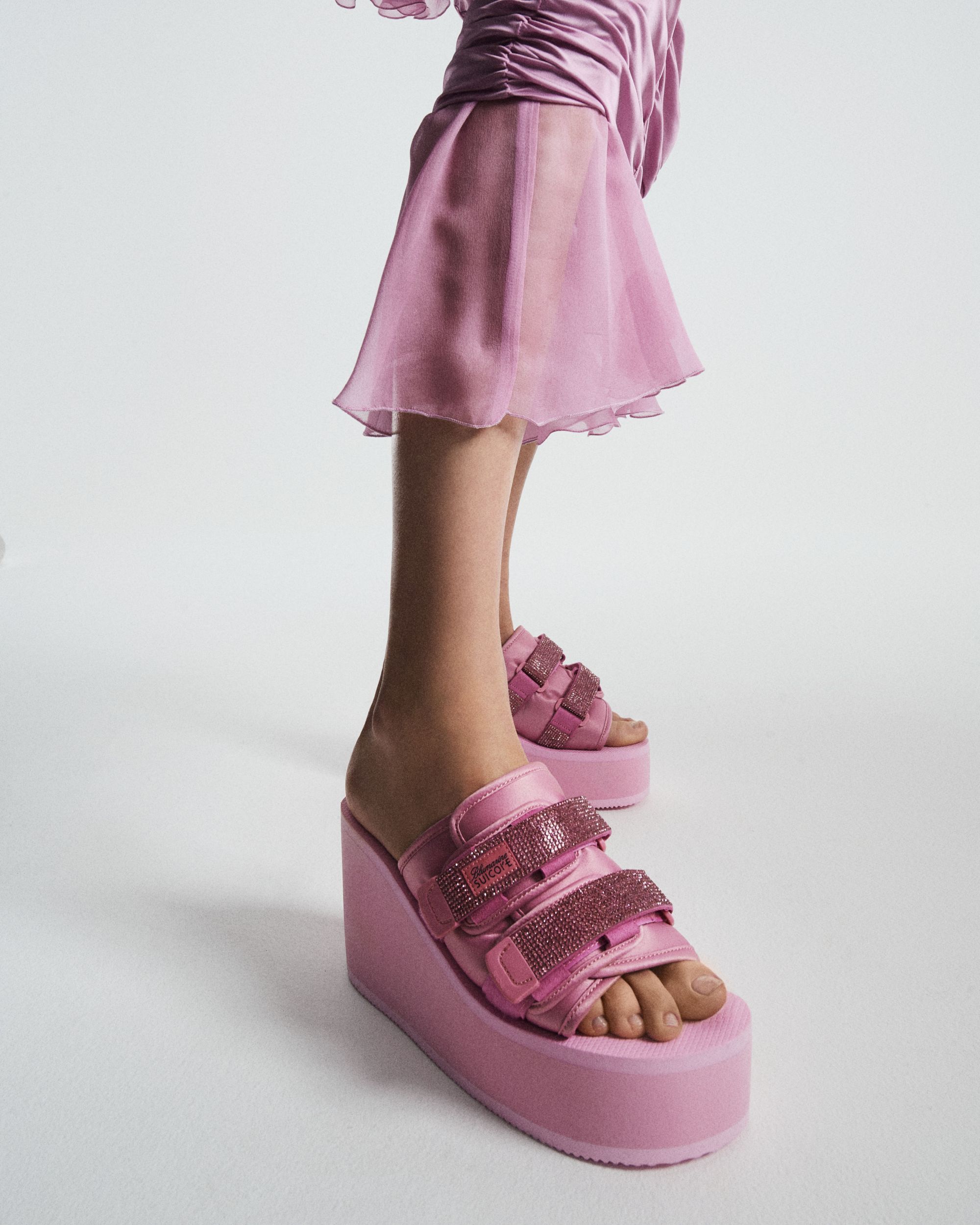 A risvegliarci dal torpore delle vacanze di Pasqua appena terminate ci pensa la nuova esclusiva capsule collection Blumarine x Suicoke. Dall’inedita collaborazione tra i due brand nascono due nuove versioni di Moto, l’iconico sandalo della label giapponese. Caratterizzata da 2 differenti modelli, flat e con zeppa, entrambi sviluppati nella variante rosa e nera con decorazione di microcristalli in tono. La capsule di sandali Blumarine x Suicoke diventa espressione genderless della simbiosi tra glamour e funzionalità, tra leggerezza dello spirito e performance dei materiali. L’inconfondibile tocco sparkling del marchio italiano Blumarine incontra la qualità, la multi-funzionalità e il comfort dell’estetica Suicoke, i cui prodotti hanno dettato la coolness della praticità.