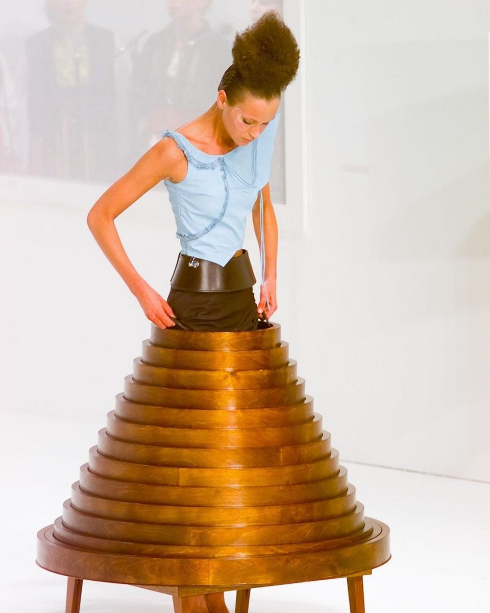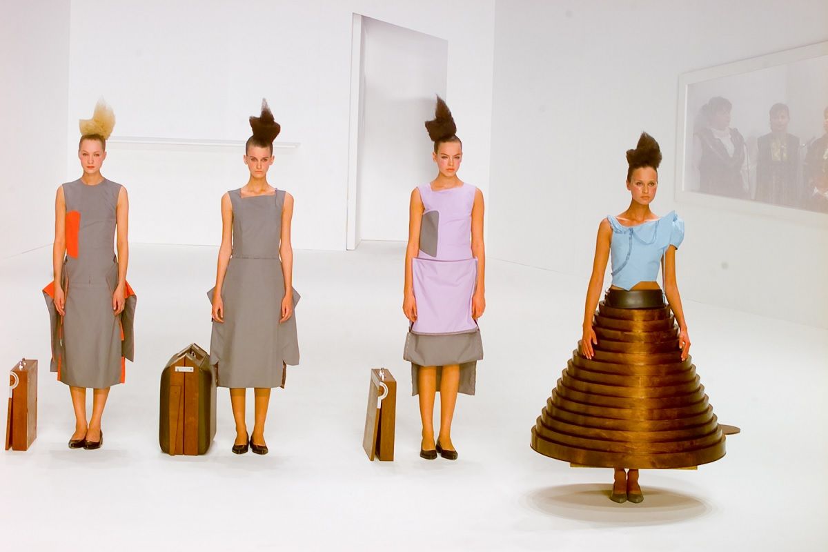 La teoria dello spazio, del luogo, delle dimensioni del corpo e dei materiali è sempre stata alla base delle creazioni di Hussein Chalayan. Con After Words, la collezione FW 2000, ha però superato se stesso. Lo stilista britannico-cipriota ha attinto ai suoi ricordi d’infanzia e all’esperienza dei rifugiati della guerra del Kosovo, costretti a fuggire all'improvviso portando con sé i propri averi, per portare in passerella che ricordava un salotto, completo di sedie, tavolo, televisore, vasi e pentole, un momento iconico. All’interno di questo set "casalingo" le modelle in sottovesti grigie toglievano le fodere dalle sedie e le indossavano come un vestito, piegavano le sedie per farle diventare valigie. Alla fine, l’ultima modella si avvicinava la centro di un coffee table, lo sollevava e lo indossava, trasformandolo in una gonna a ruota metallica.