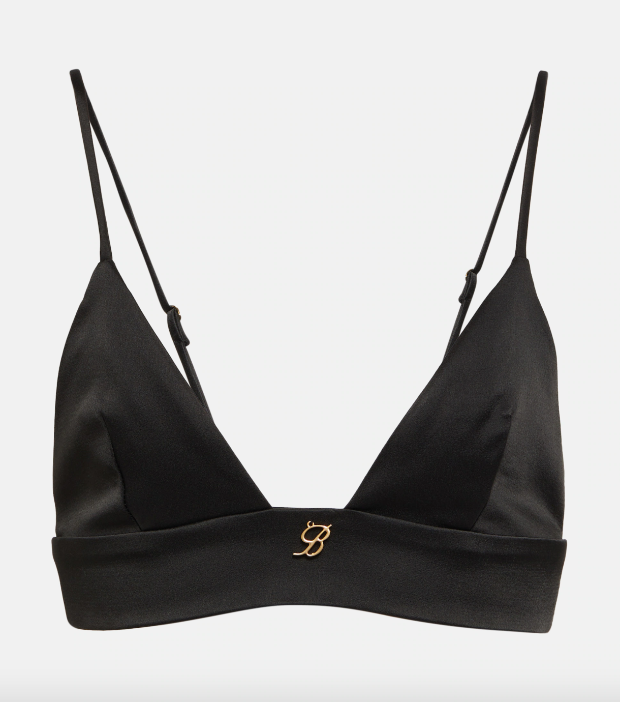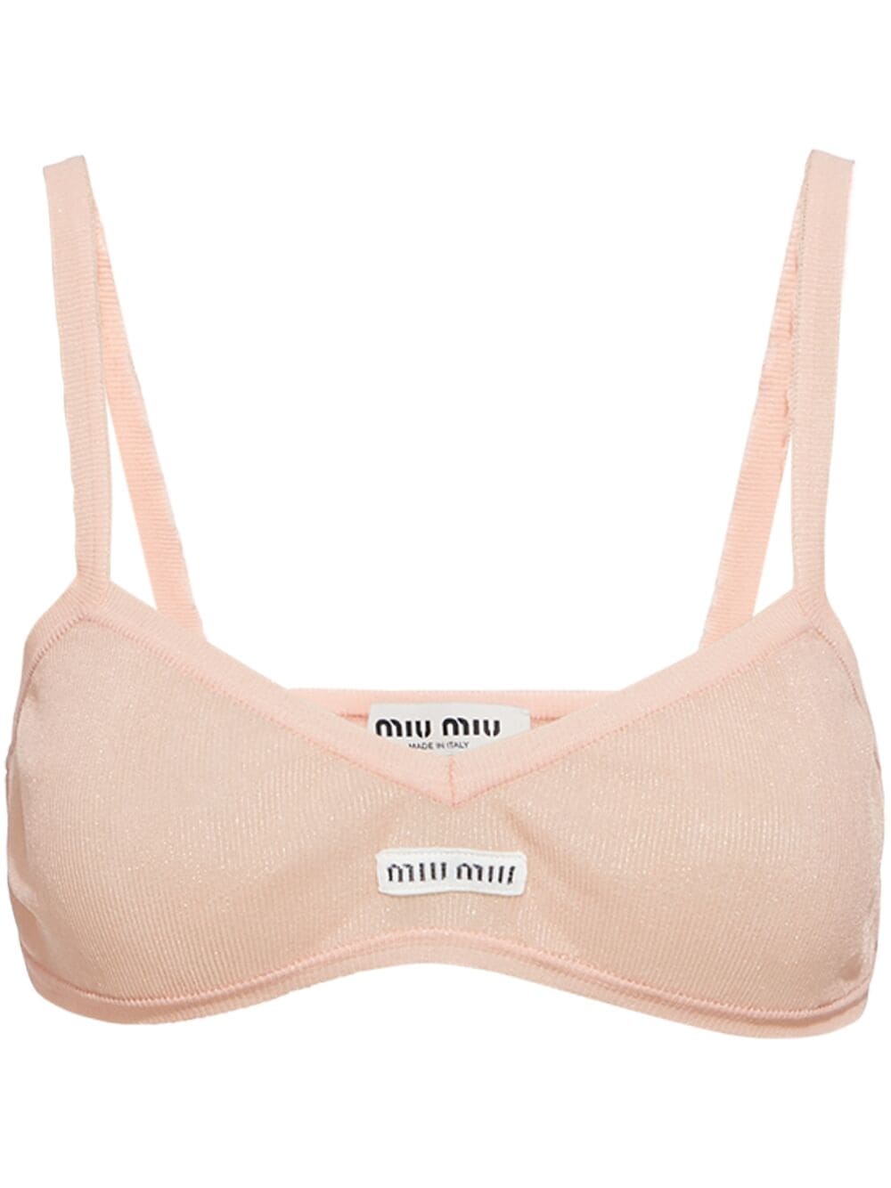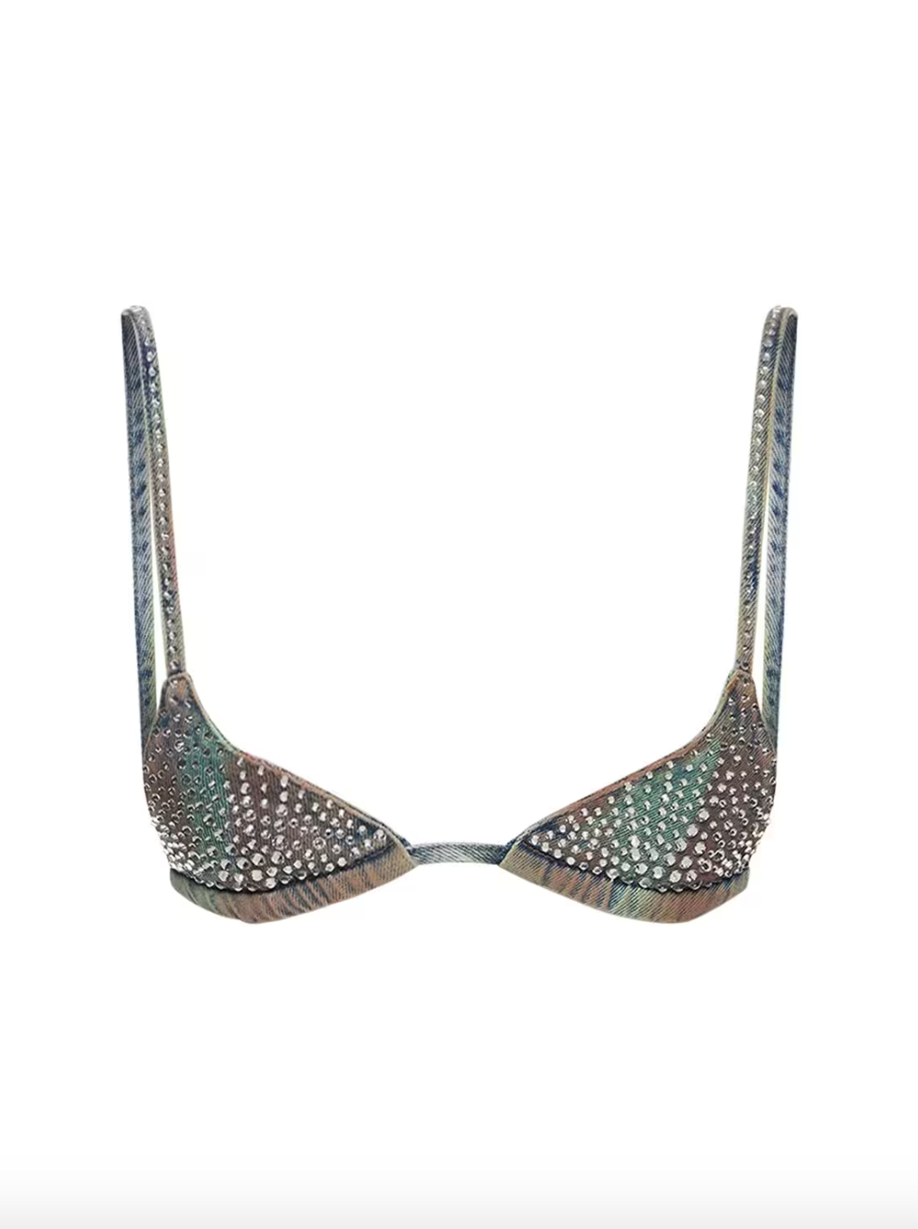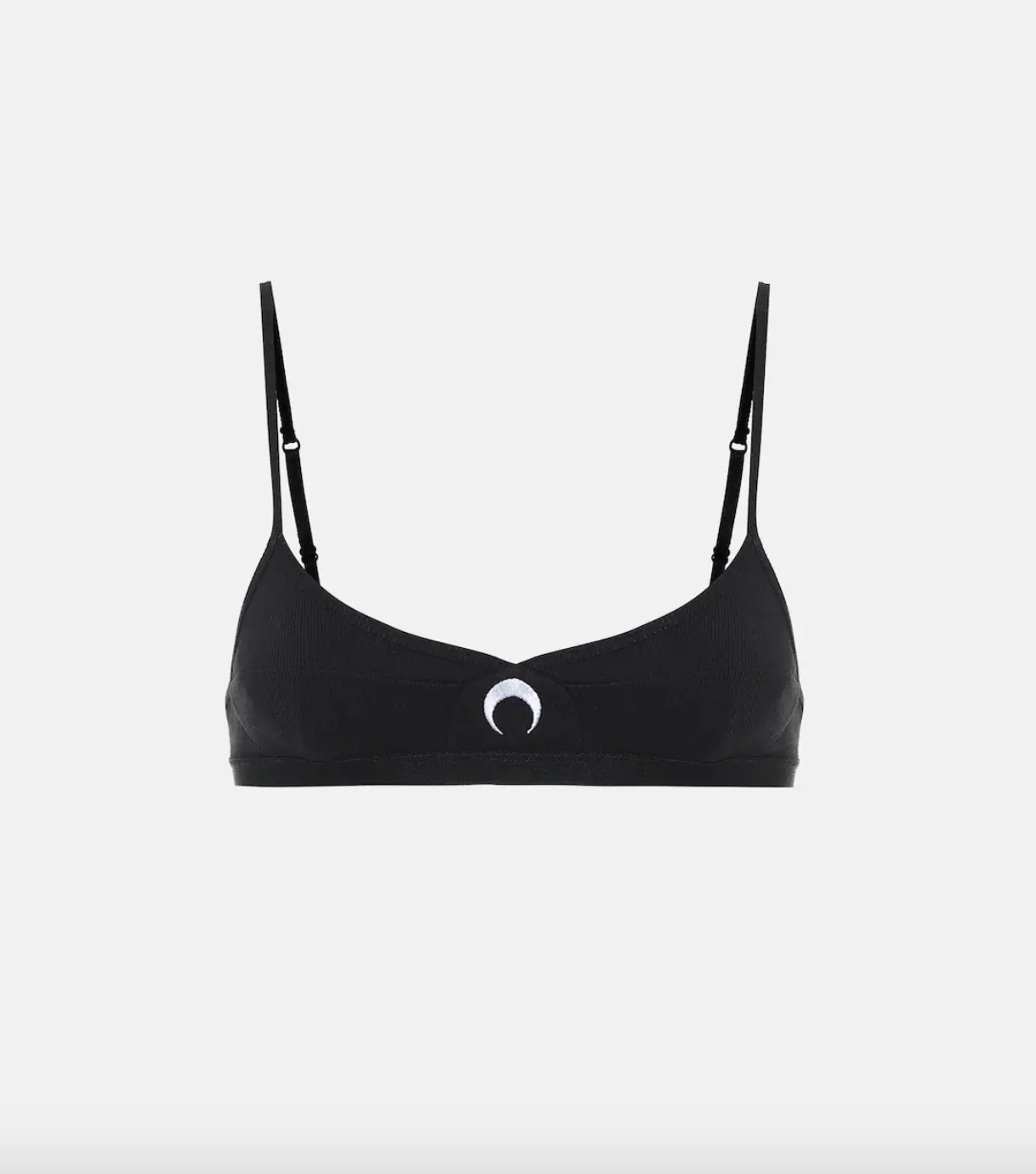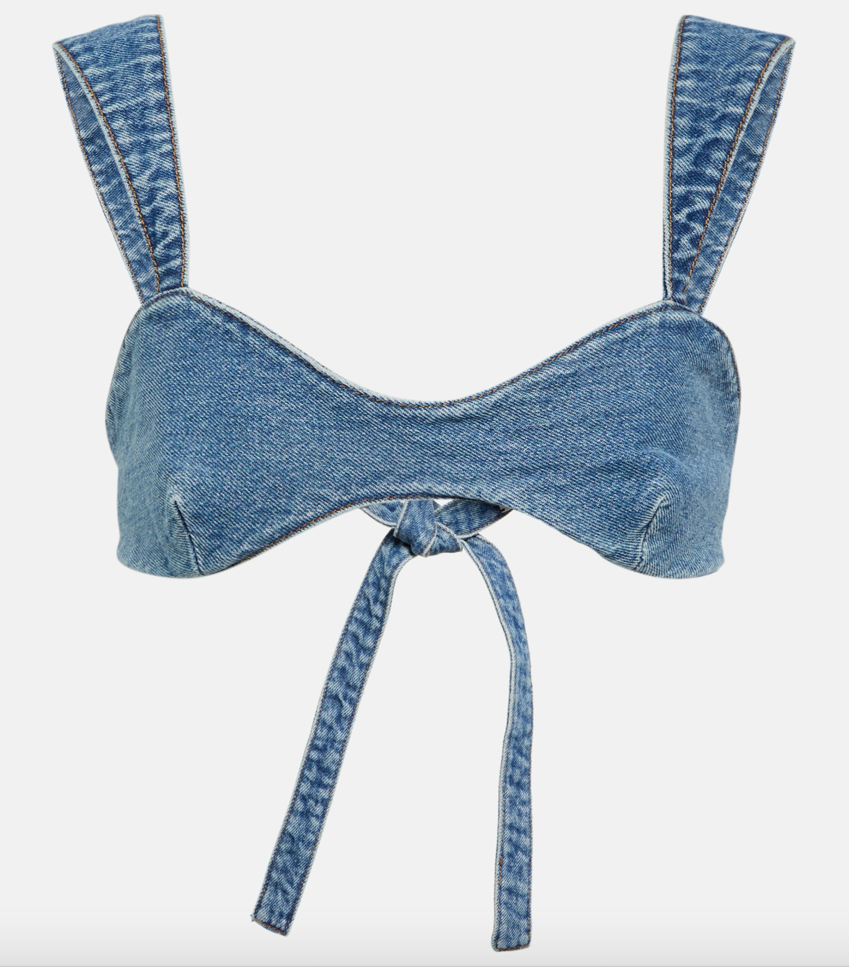 Intreccio e mono spallina per il bra terracotta di Jacquemus; denim corposo e fiocchetto posteriore per Magda Butrym; rosa delicato e logo centrale per Miu Miu; maglina a righe e giochi di string per Andrea Adamo; logo mezzaluna a contrasto sul total black per Marine Serre; raso color bianco caldo per Arte; tulle rosso e foulard compreso per Yves Saint Laurent; maglia a trecce e degrado multi color per Etro; triangolo black, logo dorato e spalline sottili per Blumarine; denim e strass a profusione per The Attico.