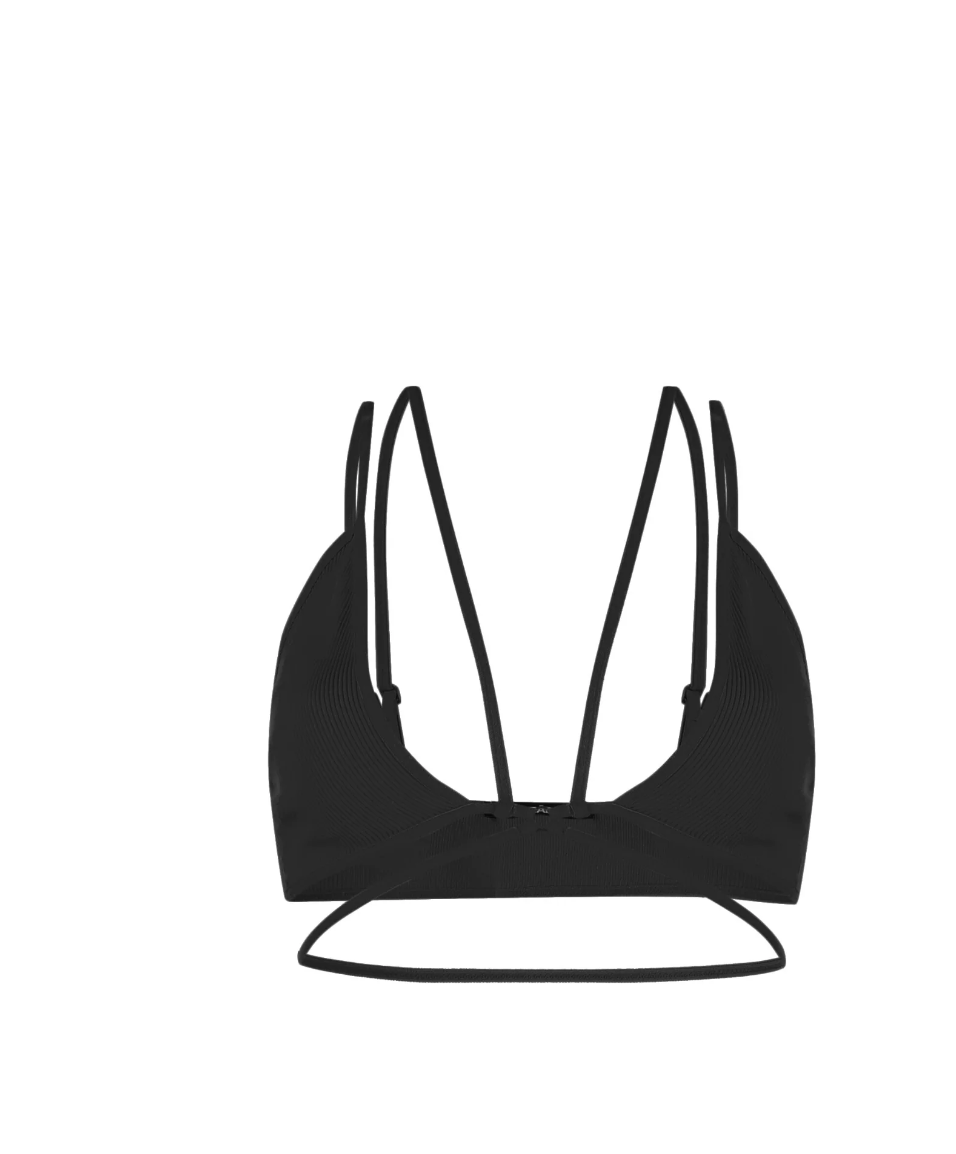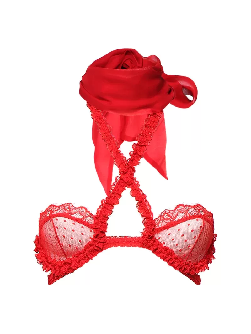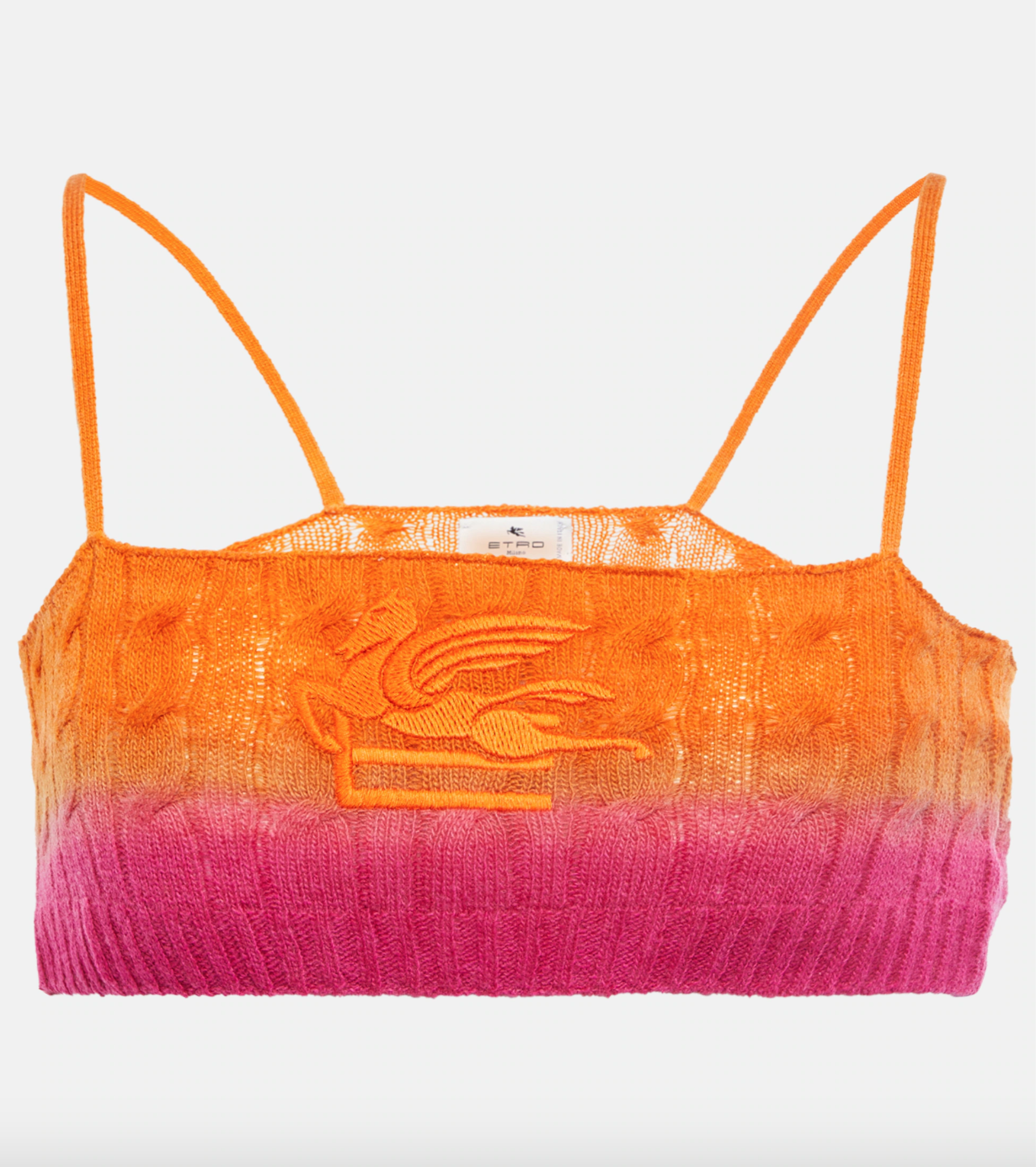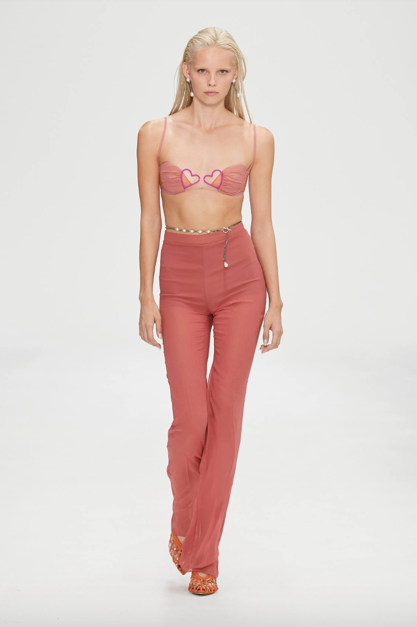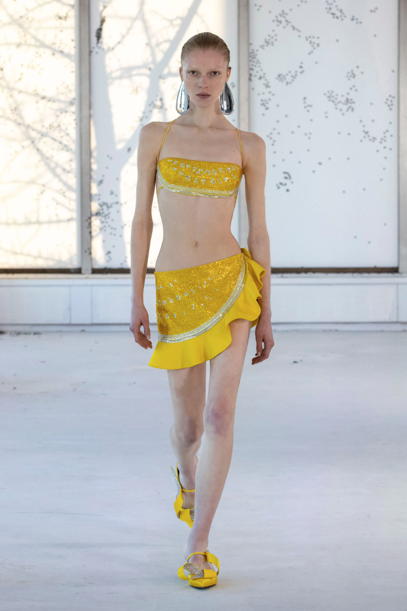 Intreccio e mono spallina per il bra terracotta di Jacquemus; denim corposo e fiocchetto posteriore per Magda Butrym; rosa delicato e logo centrale per Miu Miu; maglina a righe e giochi di string per Andrea Adamo; logo mezzaluna a contrasto sul total black per Marine Serre; raso color bianco caldo per Arte; tulle rosso e foulard compreso per Yves Saint Laurent; maglia a trecce e degrado multi color per Etro; triangolo black, logo dorato e spalline sottili per Blumarine; denim e strass a profusione per The Attico.
