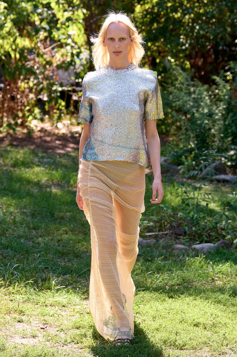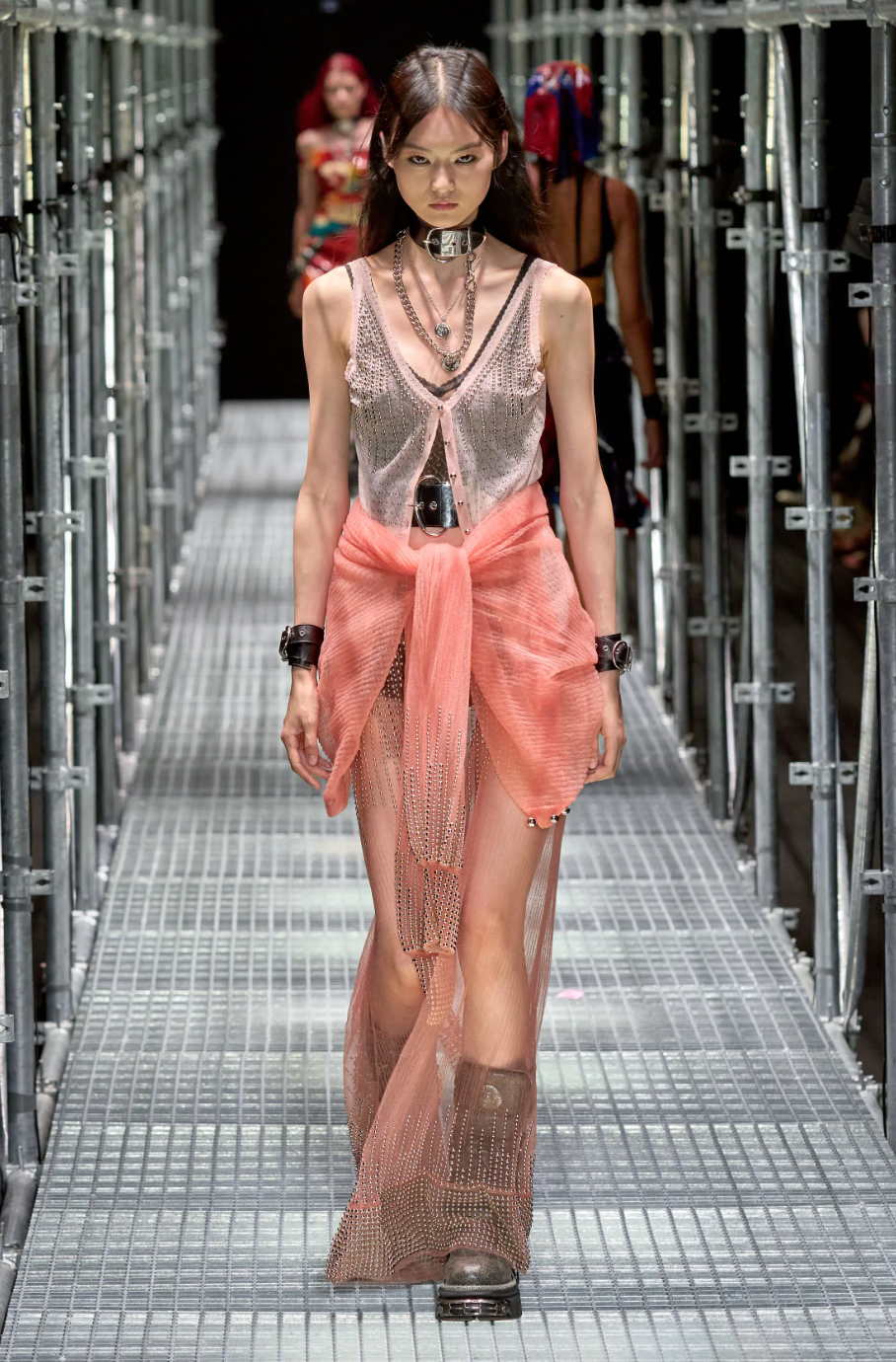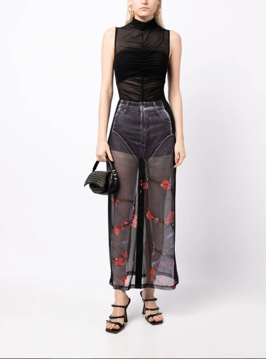 Tra gli show della SS23 le gonne sheer hanno fatto la loro apparizione sulle passerelle di: A.W.A.K.E MODE dove morbida e nera è stata accompagnata da una t-shirt oversize ton-sur-ton, di Cucculelli Shaheen preziosissima, tempestata di decori luminosi, cristalli e affini, di Eckaus Latta tra micro trafori abbinati al top dai bagliori metal, di Marni in un purificante total white con gonna dallo spacco più che vertiginoso e crop top, di Paco Rabanne che ha mescolato rosa, black e silver con armonia assoluta.