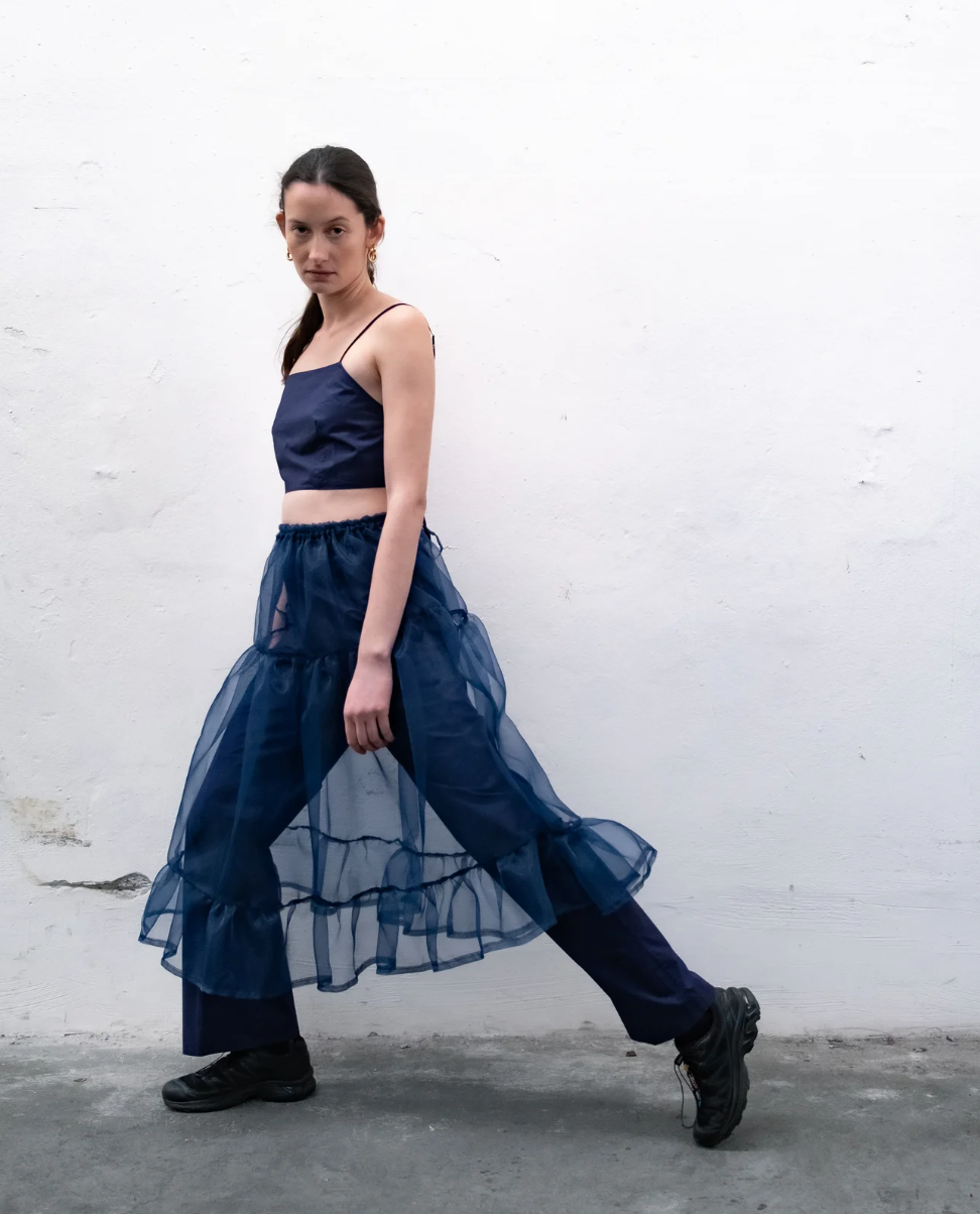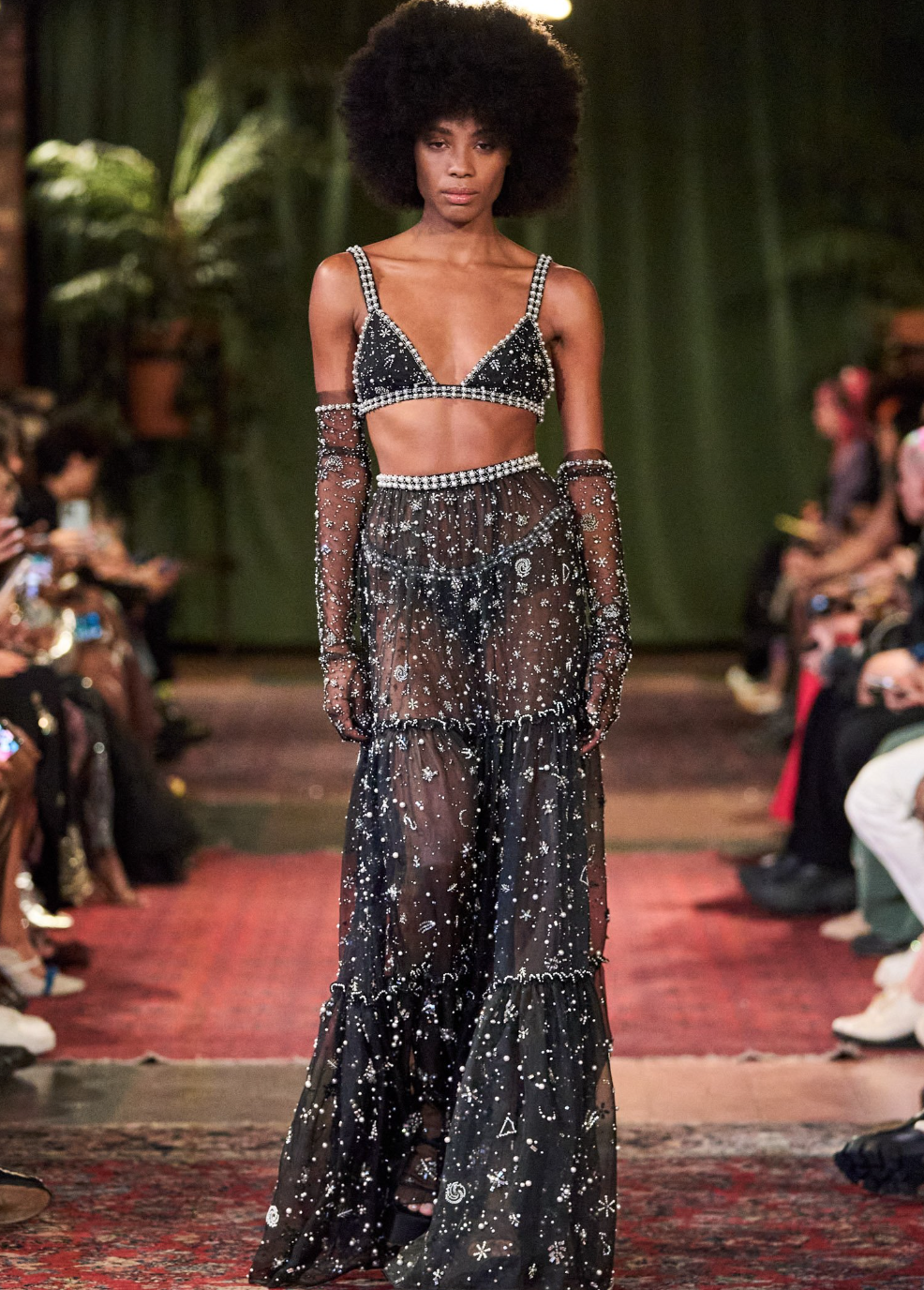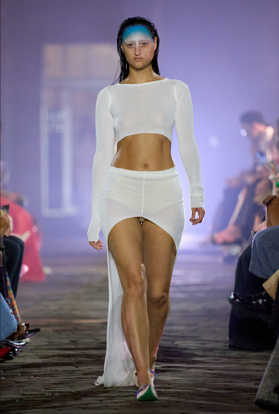 Tra gli show della SS23 le gonne sheer hanno fatto la loro apparizione sulle passerelle di: A.W.A.K.E MODE dove morbida e nera è stata accompagnata da una t-shirt oversize ton-sur-ton, di Cucculelli Shaheen preziosissima, tempestata di decori luminosi, cristalli e affini, di Eckaus Latta tra micro trafori abbinati al top dai bagliori metal, di Marni in un purificante total white con gonna dallo spacco più che vertiginoso e crop top, di Paco Rabanne che ha mescolato rosa, black e silver con armonia assoluta.