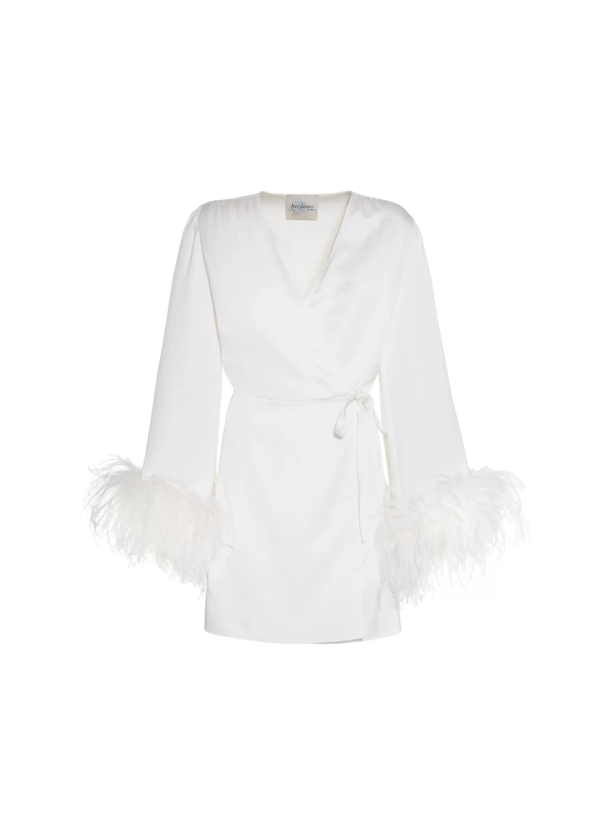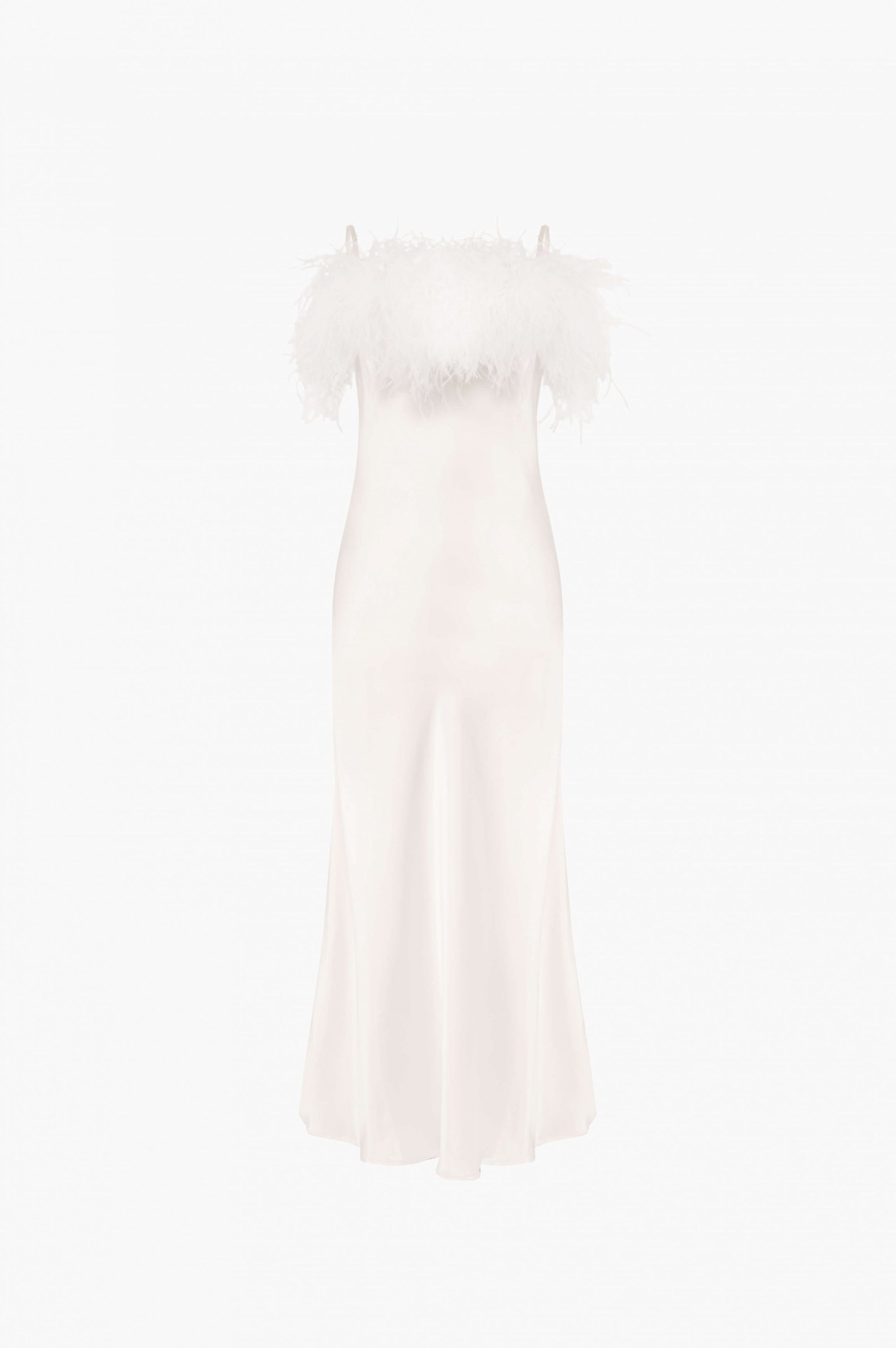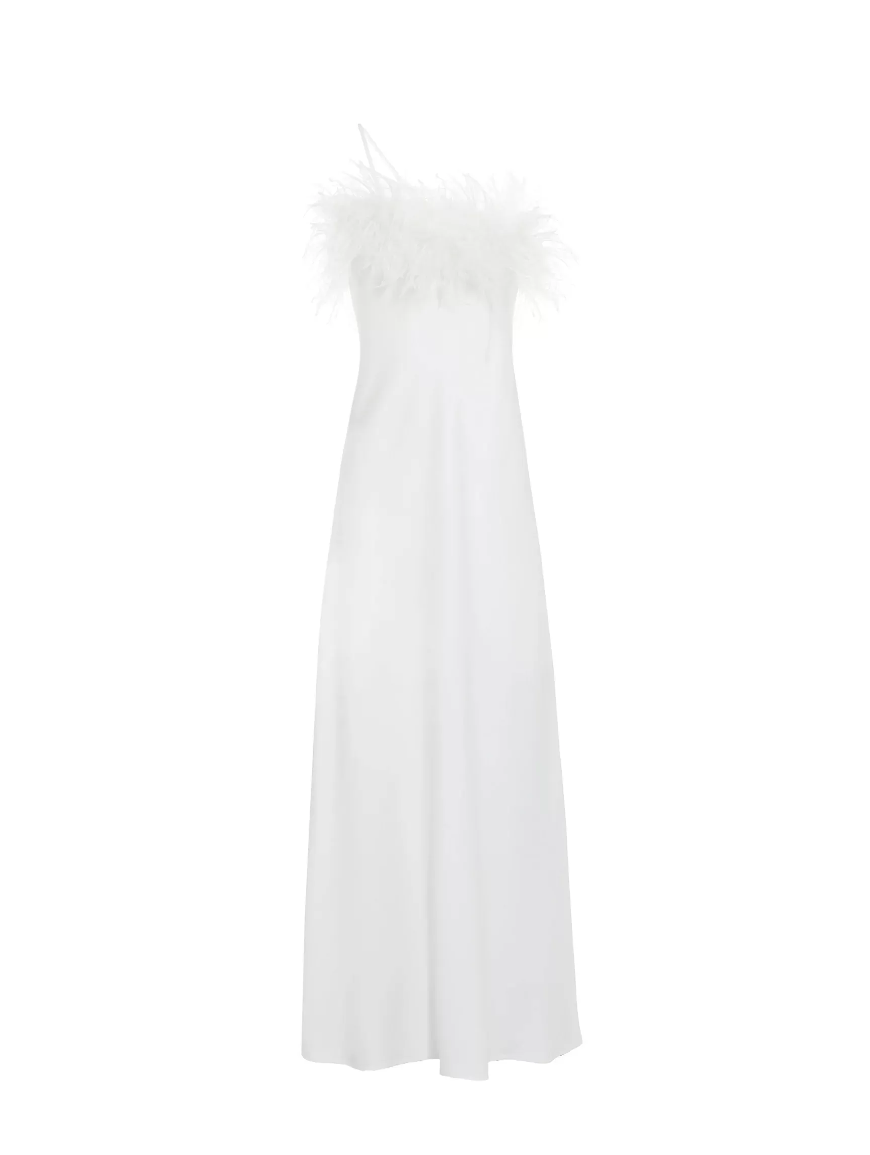 Cinque modelli dedicati alle fan delle piume. Una collezione pensata per una sposa alternativa (ma anche per chi vuole riutilizzare queste creazioni, magari sulla spiaggia), o che vuole sposarsi in municipio, o ancora che desidera fare un rapido cambio outfit per ballare la sera. Abiti a portafoglio, corti e con la schiena scoperta, oppure lungo e monospalla o in modalità slip dress. Tutti accomunati dalla seta, e con il fattore feather.