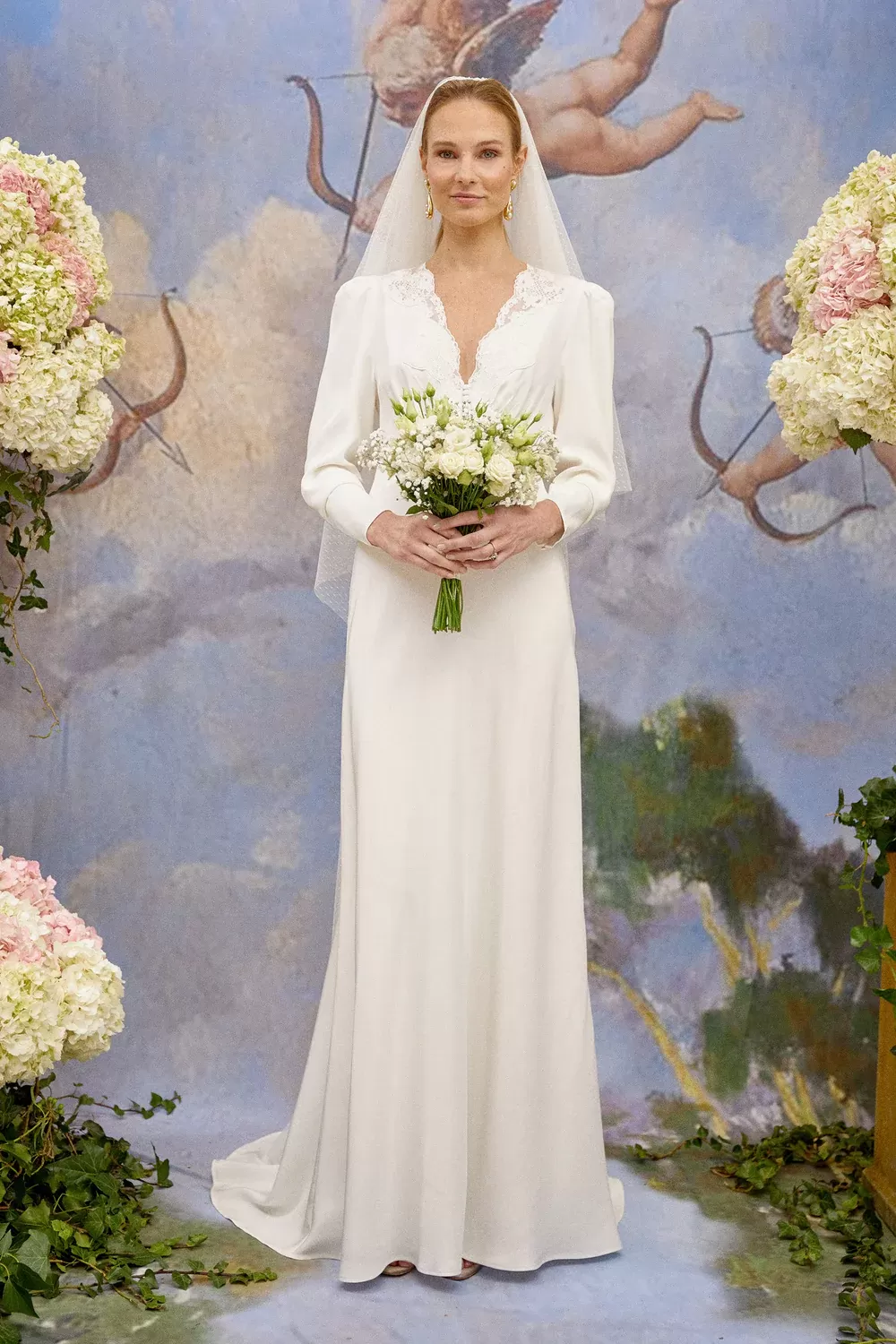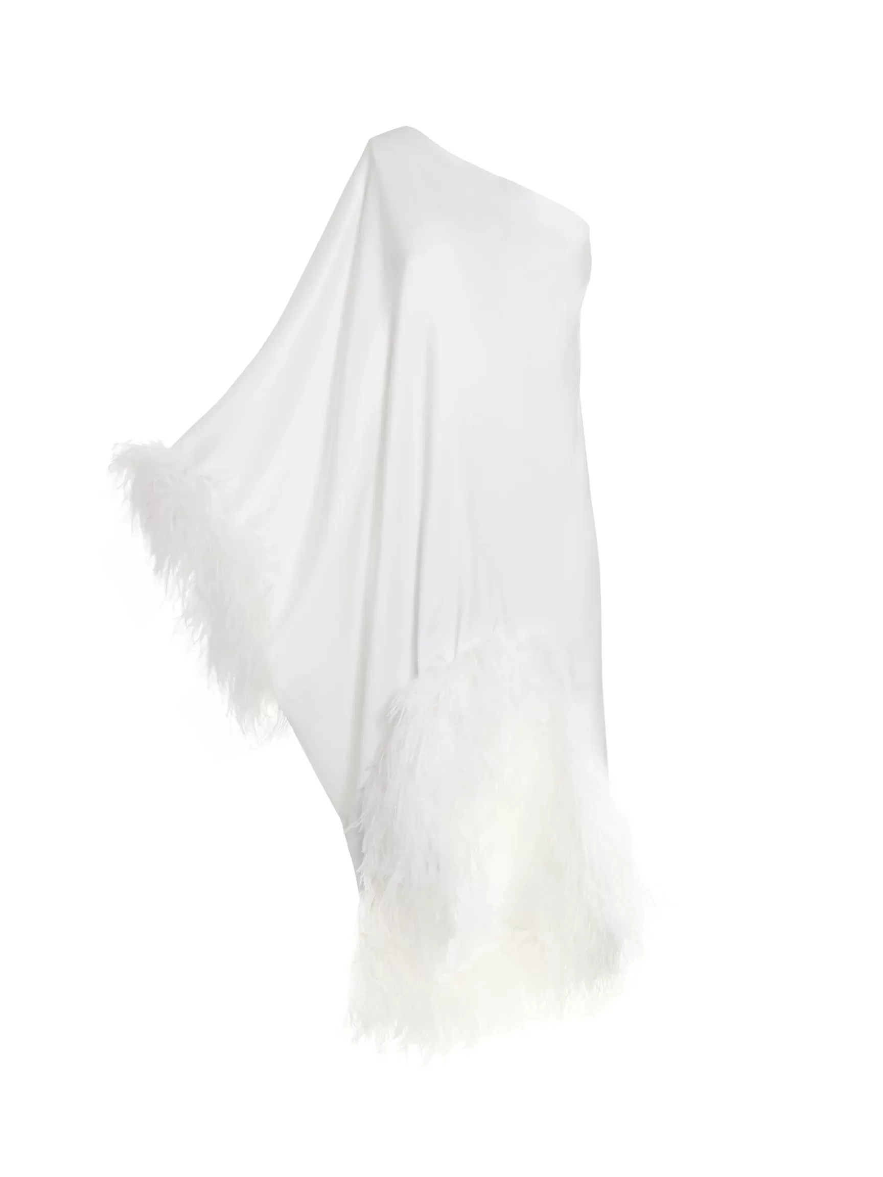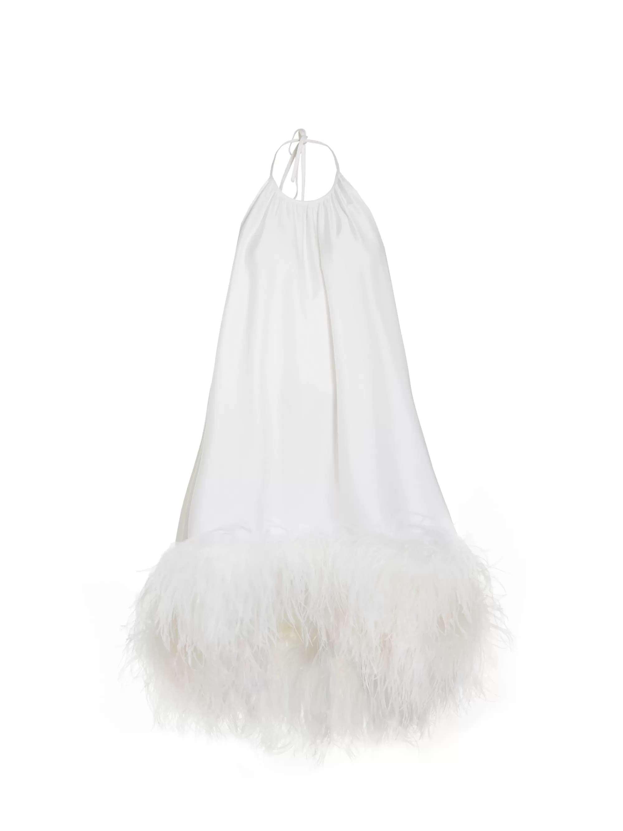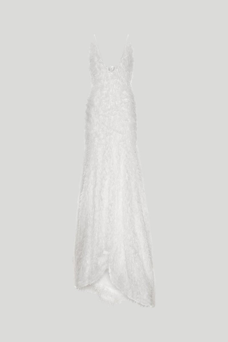 Cinque modelli dedicati alle fan delle piume. Una collezione pensata per una sposa alternativa (ma anche per chi vuole riutilizzare queste creazioni, magari sulla spiaggia), o che vuole sposarsi in municipio, o ancora che desidera fare un rapido cambio outfit per ballare la sera. Abiti a portafoglio, corti e con la schiena scoperta, oppure lungo e monospalla o in modalità slip dress. Tutti accomunati dalla seta, e con il fattore feather.