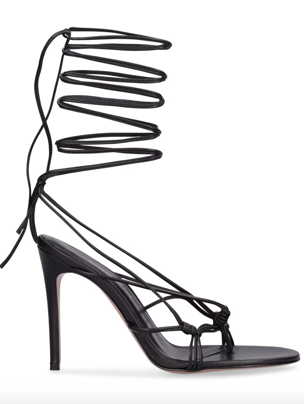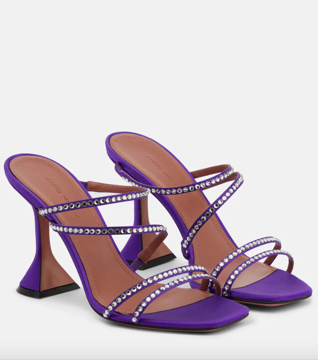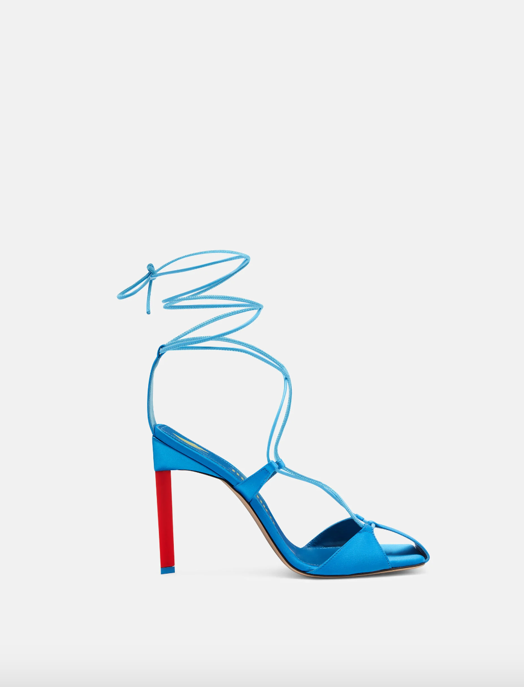 Sandalo dal tacco a rocchetto, listini di cristalli e tessuto viola cardinalizio di Amina Muaddi; i giochi di intrecci e lacci total black di Andrea Wazen; tacco sottile, pelle black e micro logo di Coperni; vernice blu baby e punta affusolata di Gia Borghini; plateau con loghi e borchiette metalliche, cinturini alla caviglia e rosa tenue di Gucci; tacco prezioso tempestato da cristalli, laccio nero alla caviglia e listino in raso di Miu Miu; tacco architettonicamente complesso e color pastello di N°21; raso brown, catenelle e cinturino in pelle di Yves Saint Laurent; incontri di nero e rosso, tacco sottilissimo e tessuto elastico di Salvatore Ferragamo; raso turchese, tacco rosso e lacci discreti di The Attico.