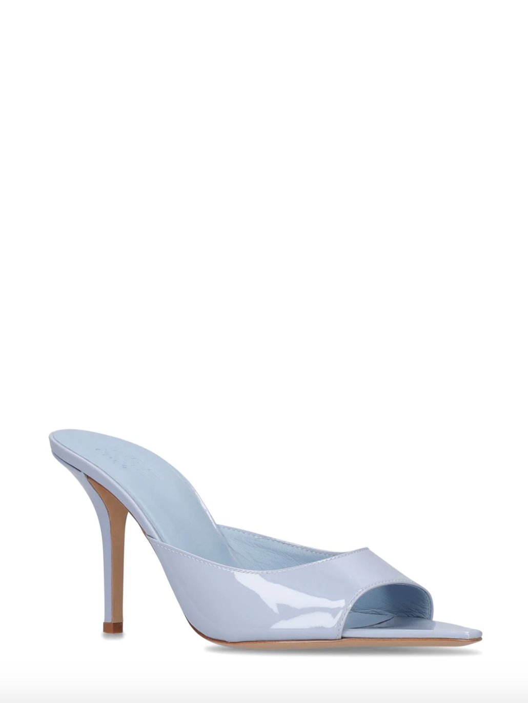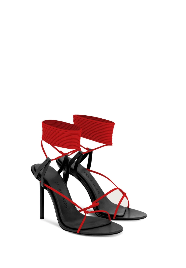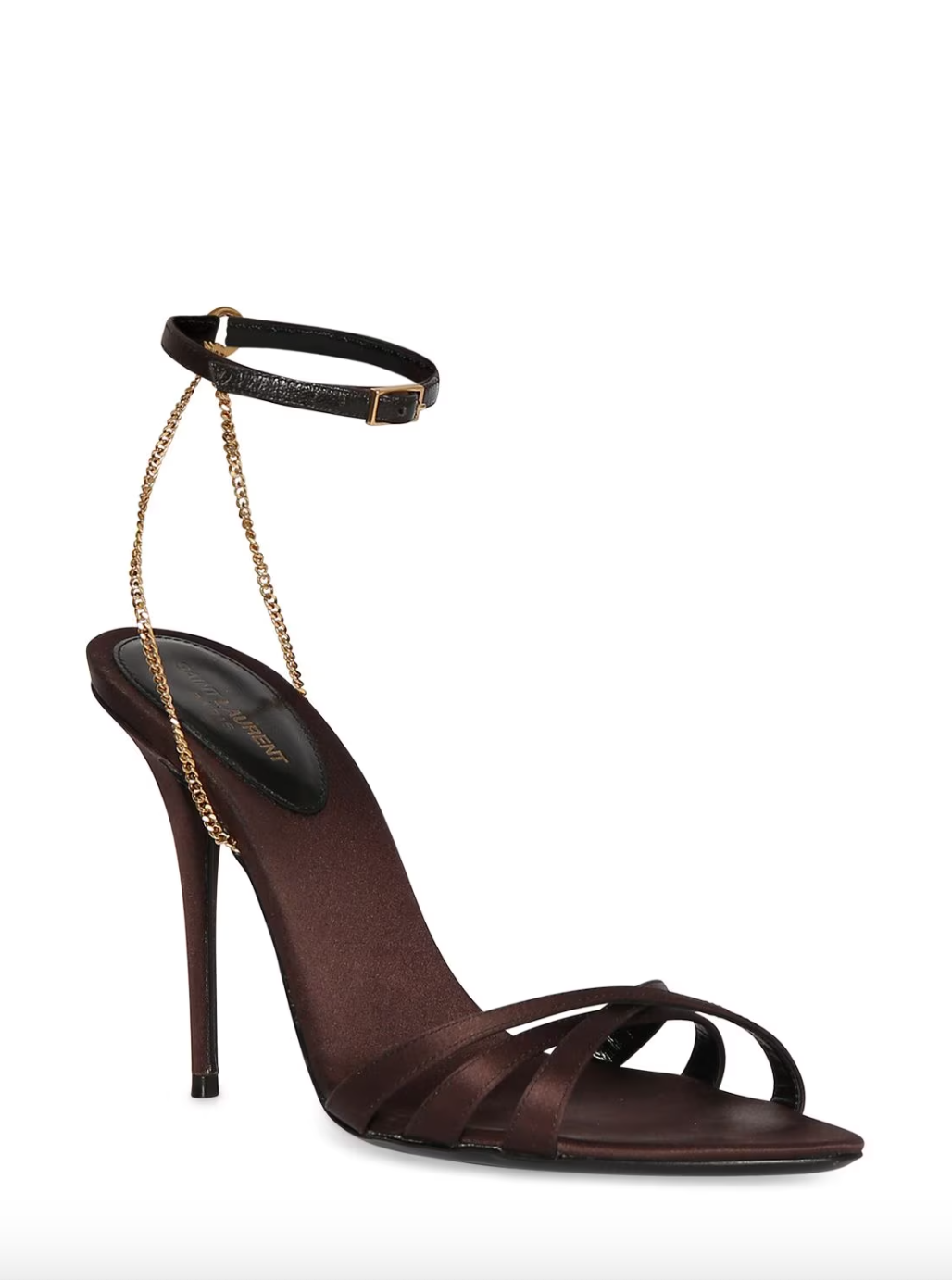 Sandalo dal tacco a rocchetto, listini di cristalli e tessuto viola cardinalizio di Amina Muaddi; i giochi di intrecci e lacci total black di Andrea Wazen; tacco sottile, pelle black e micro logo di Coperni; vernice blu baby e punta affusolata di Gia Borghini; plateau con loghi e borchiette metalliche, cinturini alla caviglia e rosa tenue di Gucci; tacco prezioso tempestato da cristalli, laccio nero alla caviglia e listino in raso di Miu Miu; tacco architettonicamente complesso e color pastello di N°21; raso brown, catenelle e cinturino in pelle di Yves Saint Laurent; incontri di nero e rosso, tacco sottilissimo e tessuto elastico di Salvatore Ferragamo; raso turchese, tacco rosso e lacci discreti di The Attico.