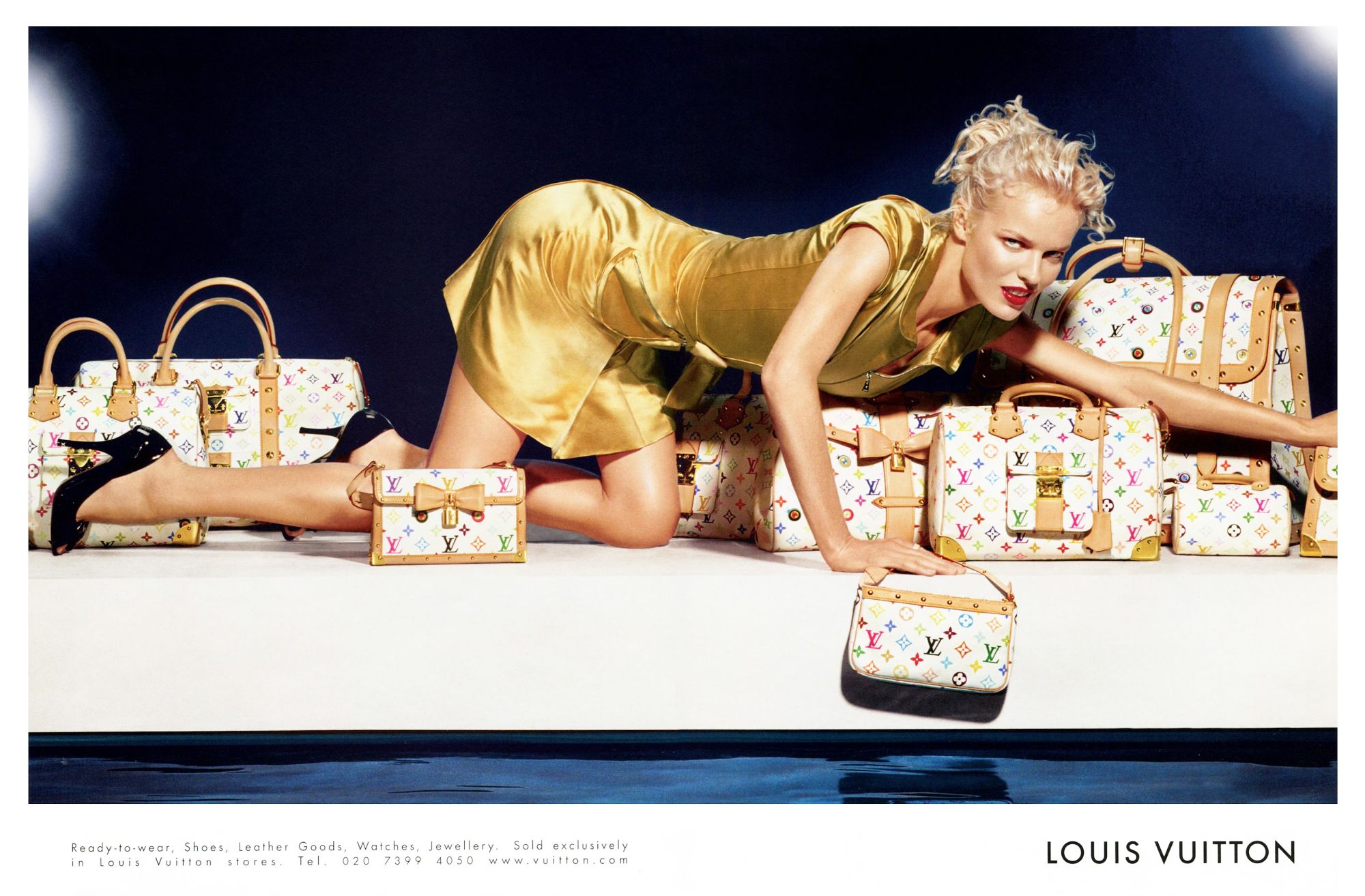 Eva Herzigova, scattata da Mert & Marcus, ci mostra quelle che quasi vent’anni dopo sarebbero diventate le borse second hand più desiderate: la collaborazione con l'artista Takashi Murakami.