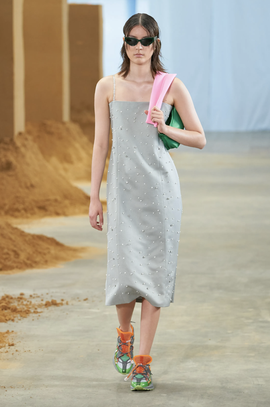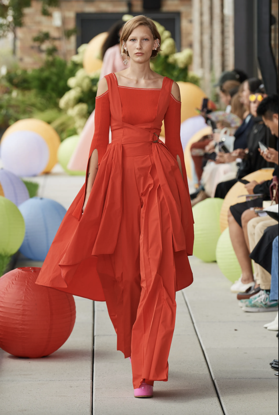 Tra gli show a tutto colore vanno segnalati: Stine Goya che unisce all’abito grigio e midi, sneakers e borsa colorfull, Burberry tra rosa baby e argento spaziale, Altuzarra che mescola suede, cotone e denim in una gradazione quasi monocroma di blu, Adeam con un rosso aranciato che va da testa a piedi, Valentino che crea scintille verdi con il caban micro.