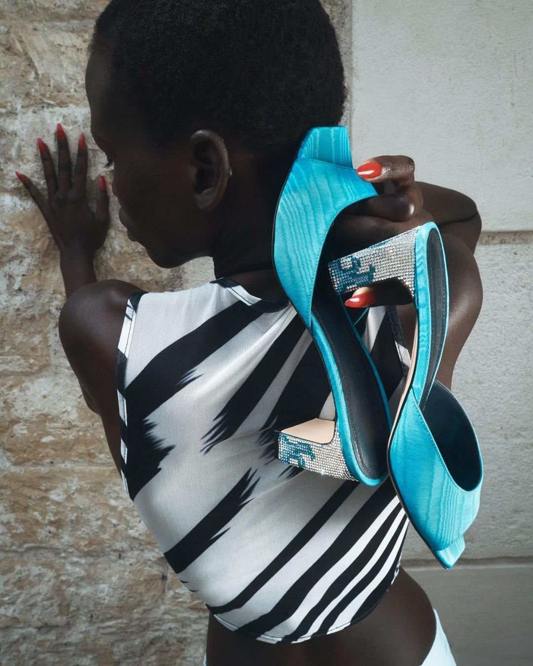 Non solo strass e animalier, Iindaco è un progetto che punta all'innovazione del lusso secondo un modello di economia circolare. Il brand nasce dall'amicizia di Domitilla Rapisardi e Pamela Costantini, due creative che condividono la passione per il Made In Italy. Il nome Iindaco fa riferimento a quella tonalità di blu di cui si colora il cielo poco prima della discesa della notte, momento per uscire a cena o per un drink con le amiche, attitude che si materializza nei sandali del brand. Il modello must have di Iindaco è la mule con motivo a fiamma realizzato mediante applicazione di cristalli.
