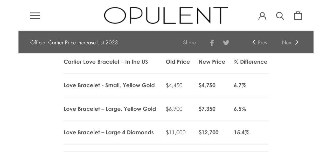 Il braccialetto Cartier Love, uno degli articoli più ricercati di Cartier, ha visto un aumento dei prezzi sia sul mercato statunitense che su quello europeo. Negli Stati Uniti l’aumento varia dal 6,5% al 15,4%, mentre in Europa varia dal 6,45% al 7%.