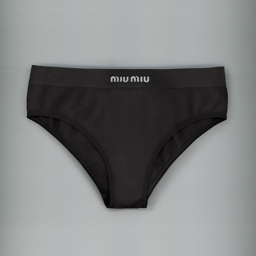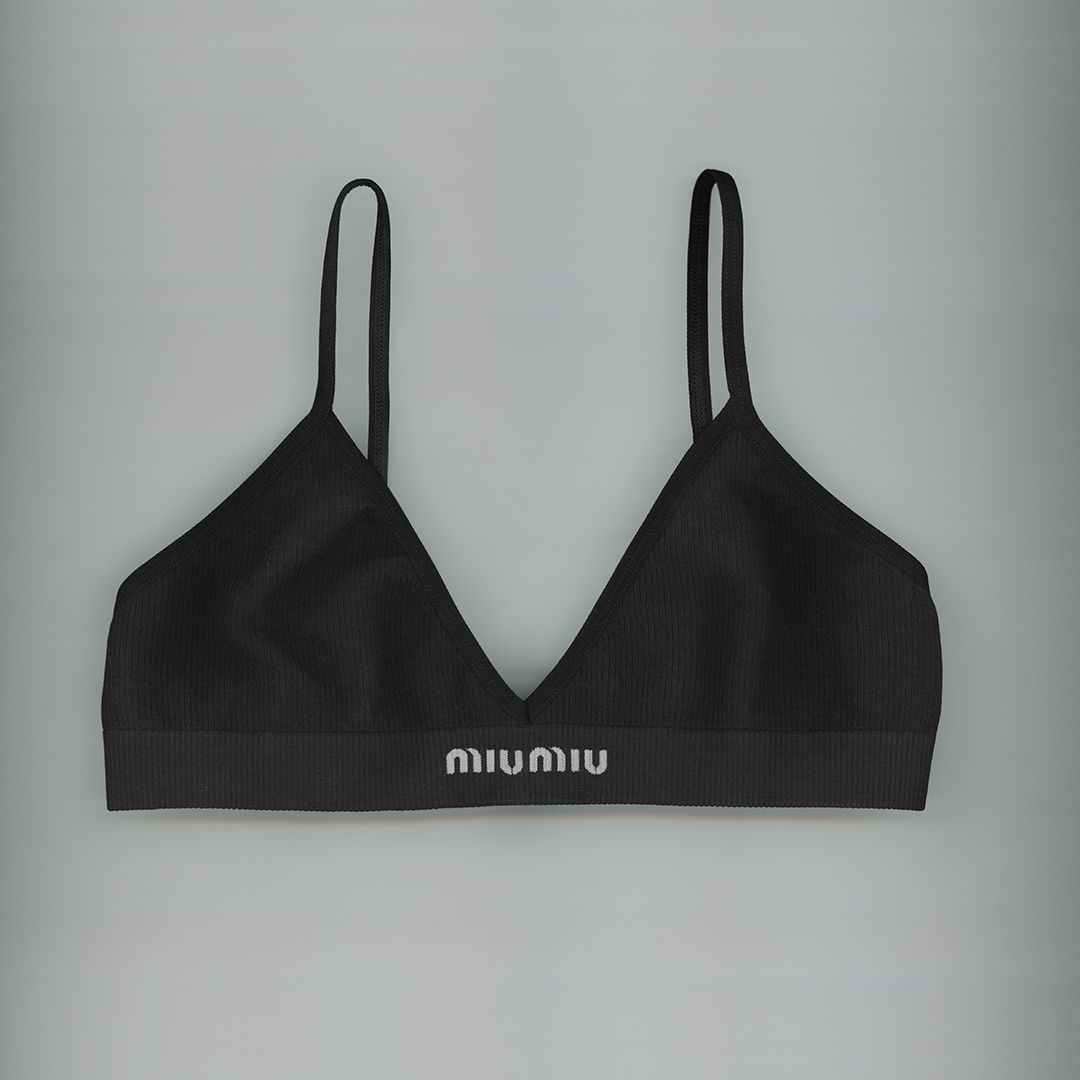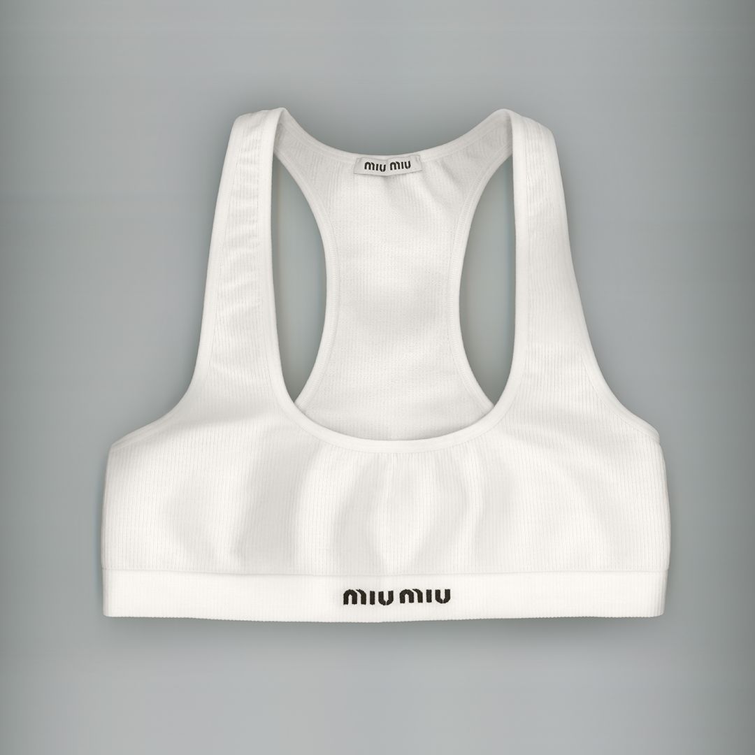 La prima collezione è quella seamless, in tessuti tecnici e silhouette sportive con logo, per le anime casul e per la vita di tutti i giorni. È disponibile da febbraio, ed è perfetta per realizzare look layered, magari con la fascia con logo a vista che sbuca dai pantaloni a vita bassa o sotto una gonna trasparente. Proprio come Emma Corrin nella campagna Miu Miu spring 2024. In questo drop non solo slip e bralette comode, ma anche un paio di culotte e un top con spalline incrociate.