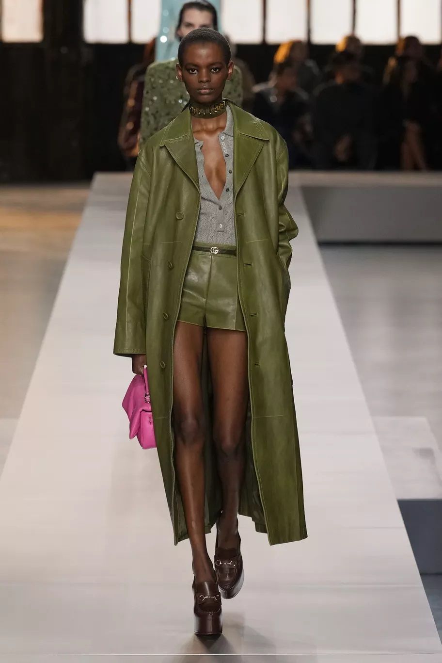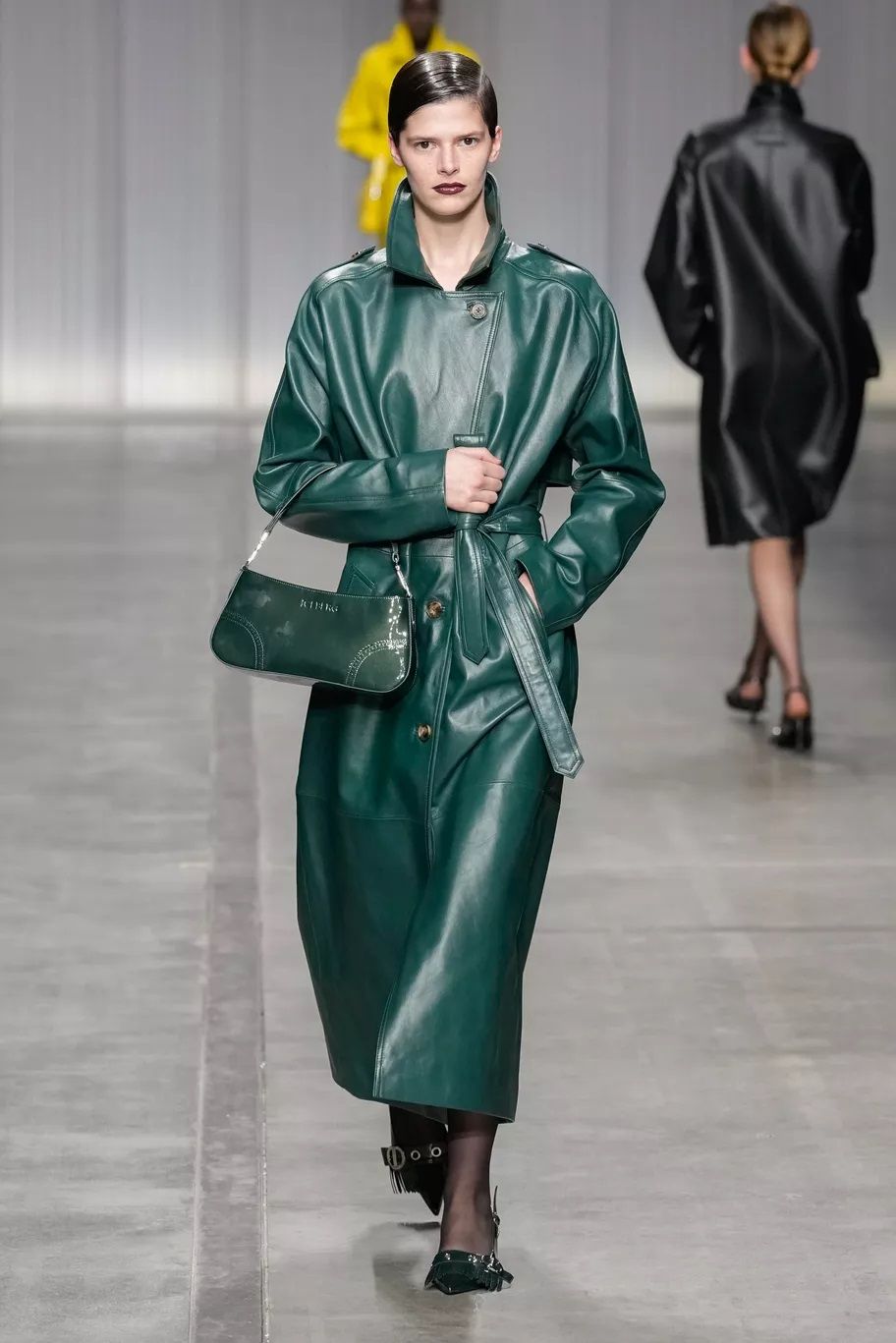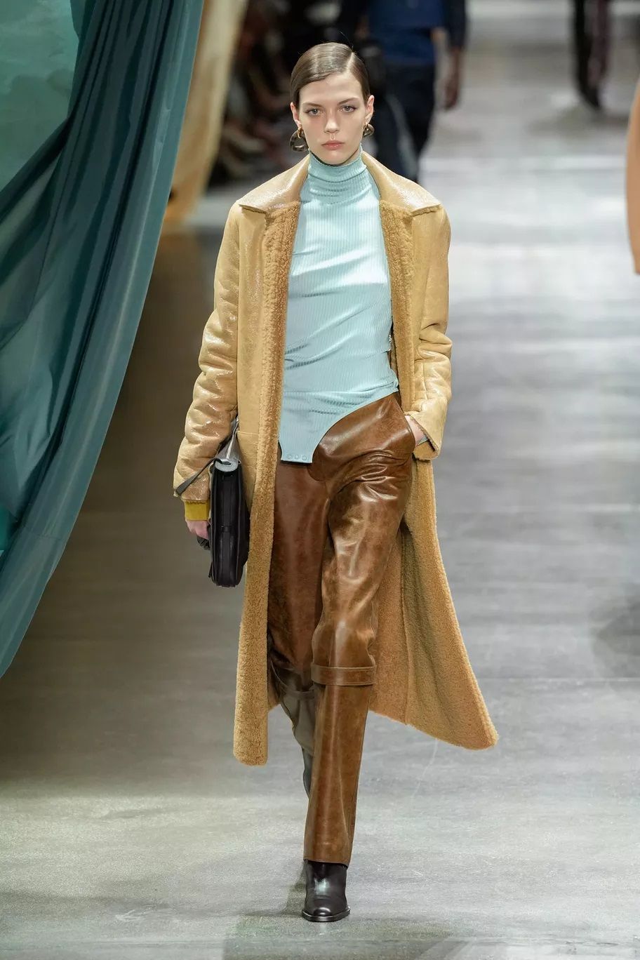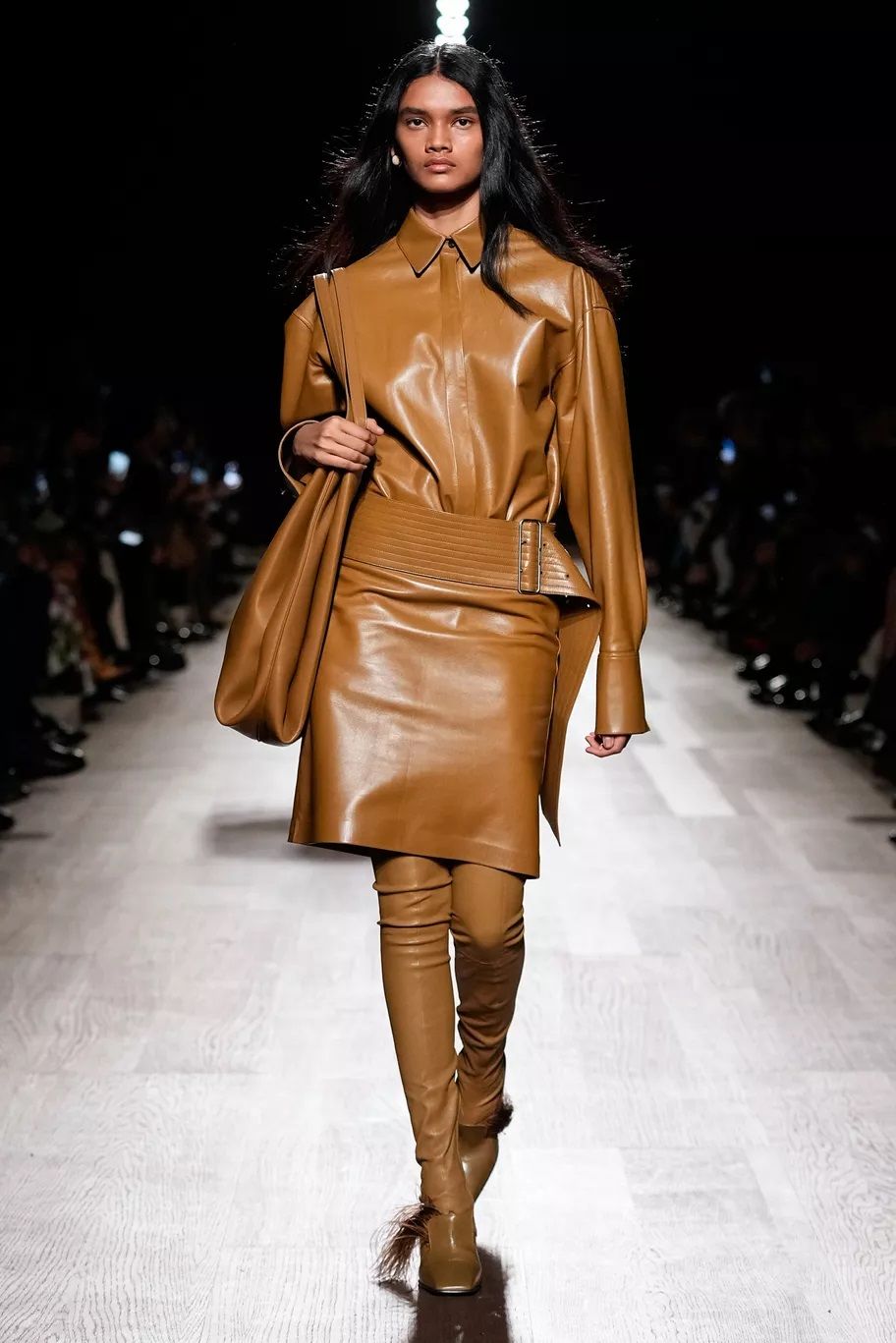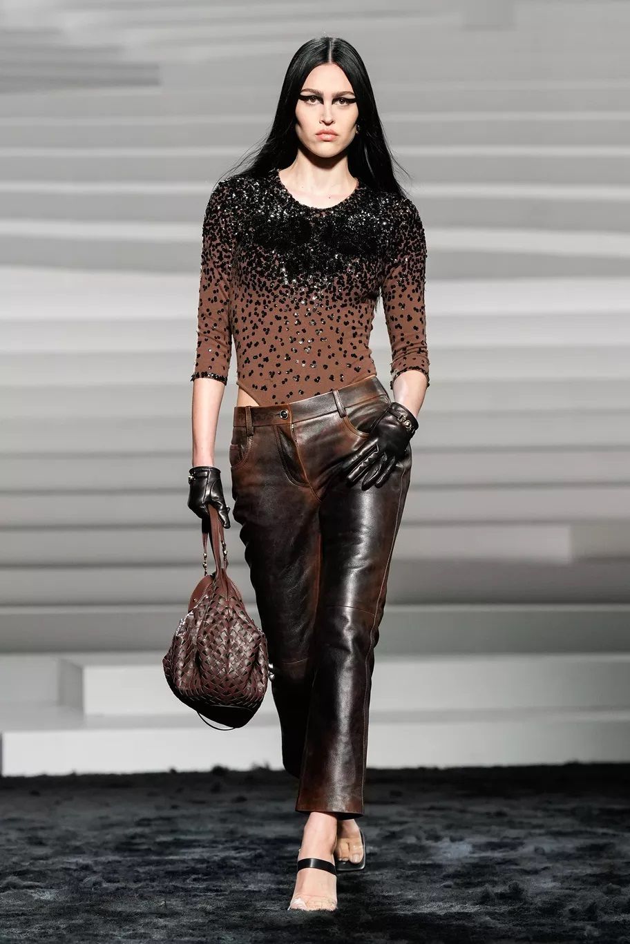 Maxi trench, abiti, pantaloni, bluse, cuissardes, borse, …purché siano declinati in pelle, dal finish lucido, quasi vinilico. Gucci ha creato look total leather con caban che si portano con le minigonne e gli stivali alti; Marni ha abbinato lunghi abiti a triangolo a eleganti opera gloves; Ferrari ha optato per un effetto stropicciato e silhouette workwear; Fendi ha realizzato camicie e leggings attillatissimi. Il vero capo che trova un nuovo twist e aggiunge un tocco edgy ad ogni outfit è il trench in pelle, proposto, tra gli altri, da Dolce&Gabbana, Bottega Veneta e Iceberg. Il plus? È anche l’item passe-partout per andare dall’inverno alla primavera.