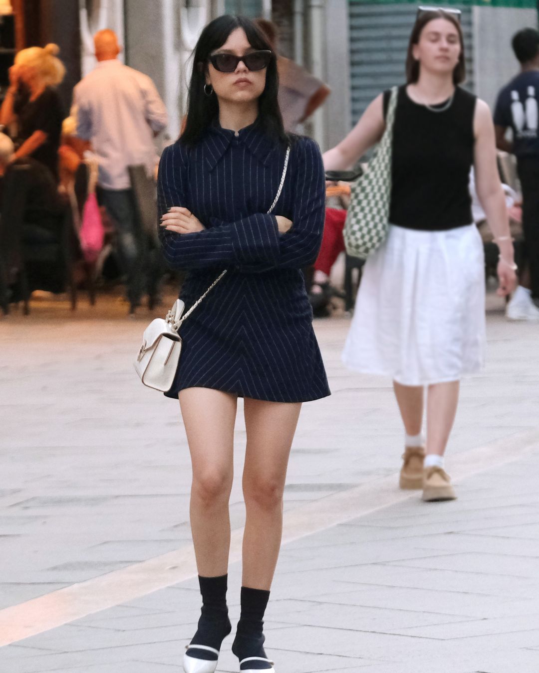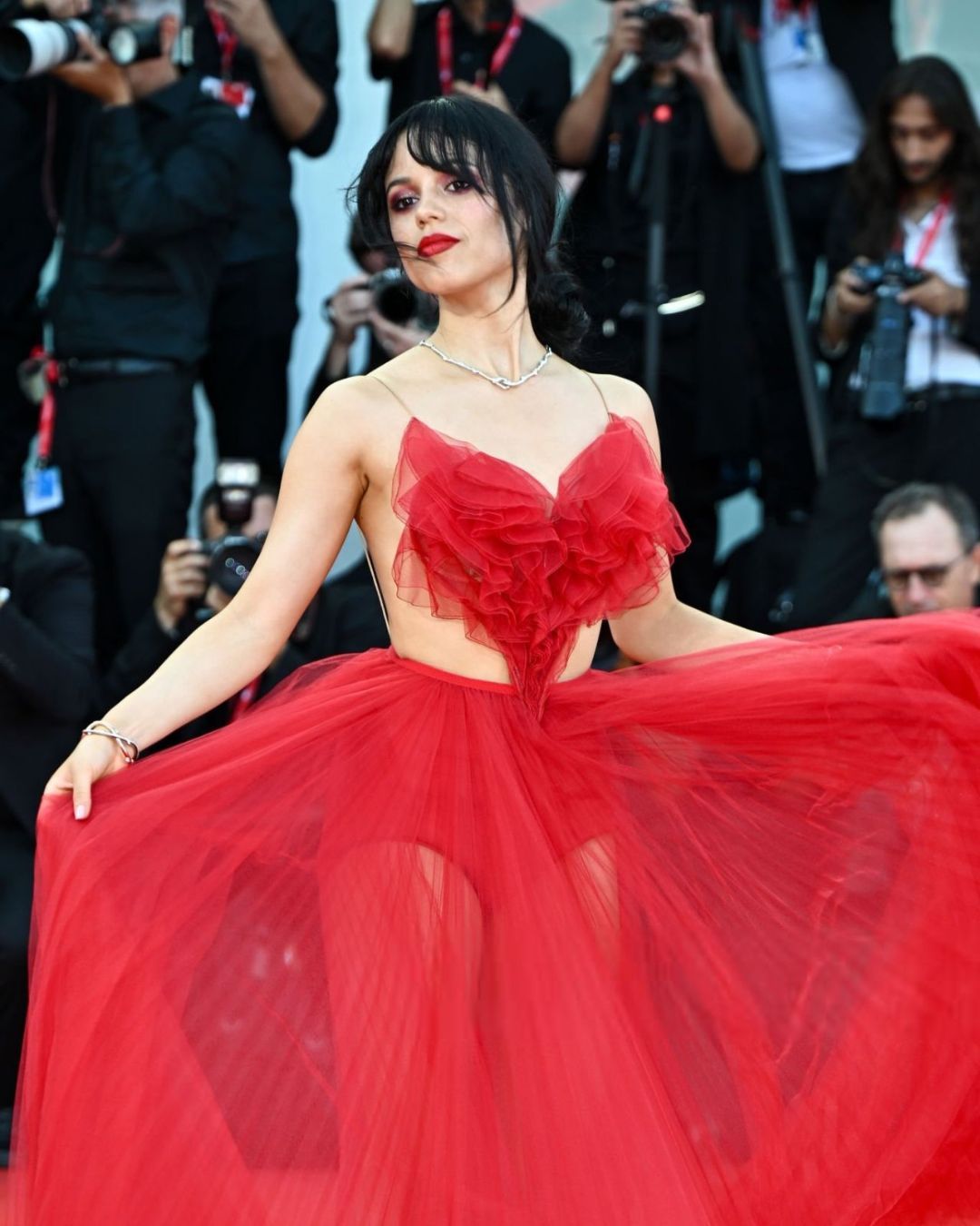 Jenna Ortega, di queste polemiche, se ne infischia. Fin dai tempi di Mercoledì, serie Netflix che l'ha resa famosa e conosciuta in tutto il mondo, inserisce elementi alt e presi dalle subculture nei suoi look da red carpet e anche off duty, sia nell'abbigliamento che nel make-up, e le riesce molto bene, anche grazie all'aiuto del suo stylist Enrique Melendez. Il suo arrivo a Venezia, naturalmente in barca, è stato segnato da un mini-abito Desigual nero a righe, con calzini neri e scarpe e borsa bianchi. Sul viso grossi occhiali da sole, anch'essi neri. Tocco di colore per il red carpet dell'anteprima, con un abito rosso custom firmato Christian Dior e make-up rosso con capelli raccolti e frangetta libera sulla fronte. Impossibile non pensare a Lydia Deetz, nel primo Beetlejuice. Rosso, ma profondo, quasi borgogna, il completo con spalline importanti di Paul Smith, per l'incontro con la stampa. E il power suiting diventa super alt.