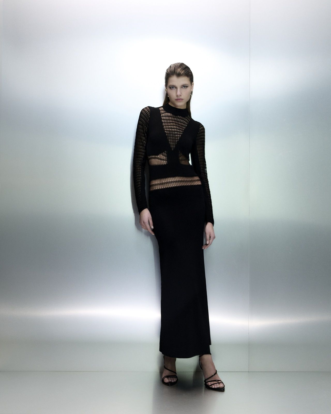 La capsule Midnight è composta da 4 look, dagli abiti da sera e da cocktail ai set in tweed. Tra i pezzi chiave che catturano l’attenzione spiccano capi dalle silhouette aderenti e dalle scollature profonde, giacche di pelliccia, camicette di paillettes, abiti in rete, shorts in tweed e in pelle, da indossare con alti stivali in suede o sandali alti e da abbinare ad una giacchina corta o top perlescenti, ma anche un audace abito in pelle dal taglio asimmetrico. Il modello che tutte vorremo avere per la sera del 31 dicembre e per brillare ai party più esclusivi è un abito bodycon in maglia, caratterizzato da un delicato drappeggio e da una scollatura profonda, ornata di cristalli Swarovski. La collezione è declinata in nero, oro e argento, colori che, aiutati da materiali lussuosi, trasparenze e audaci cut-out, creano un interessante gioco di luci e ombre.