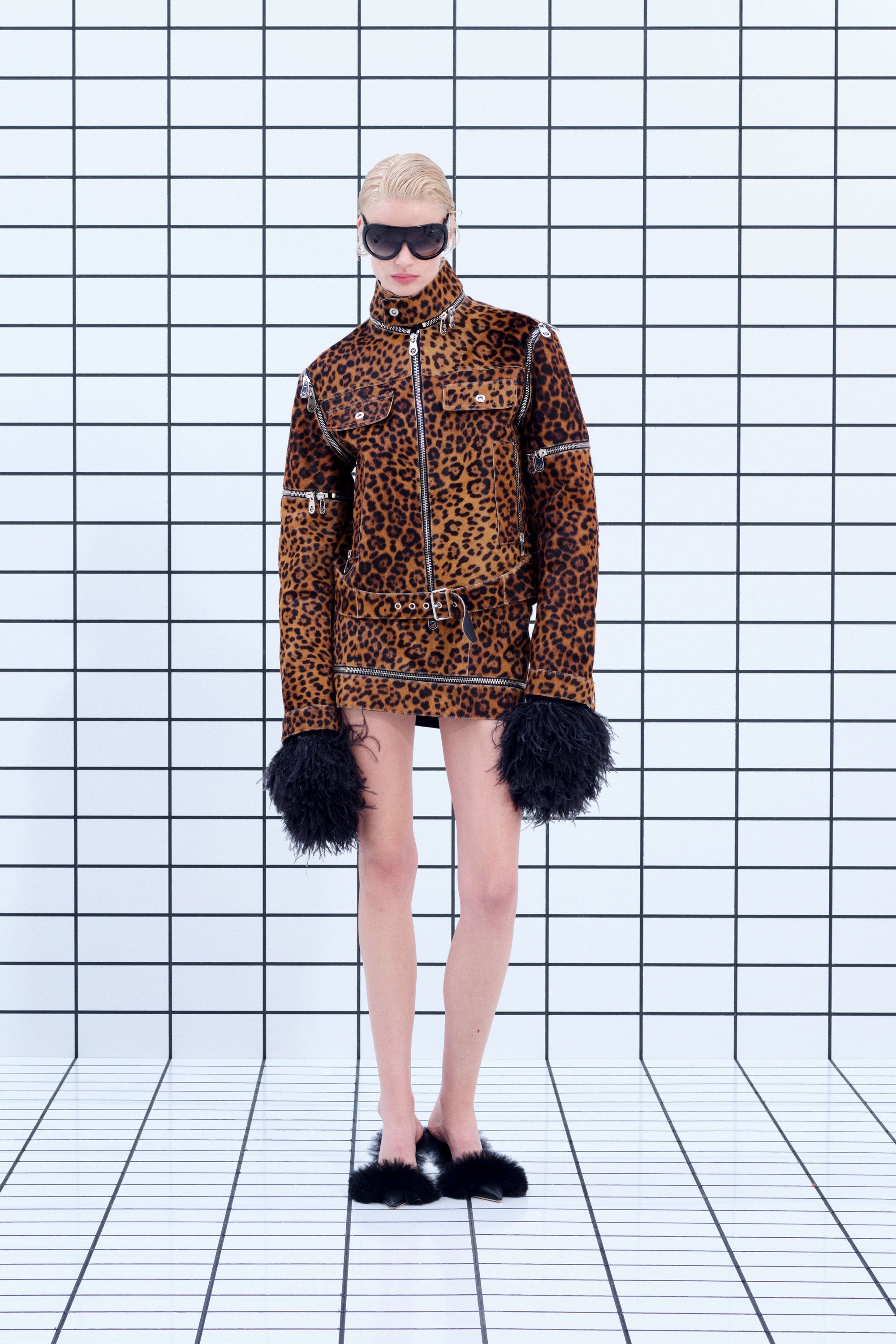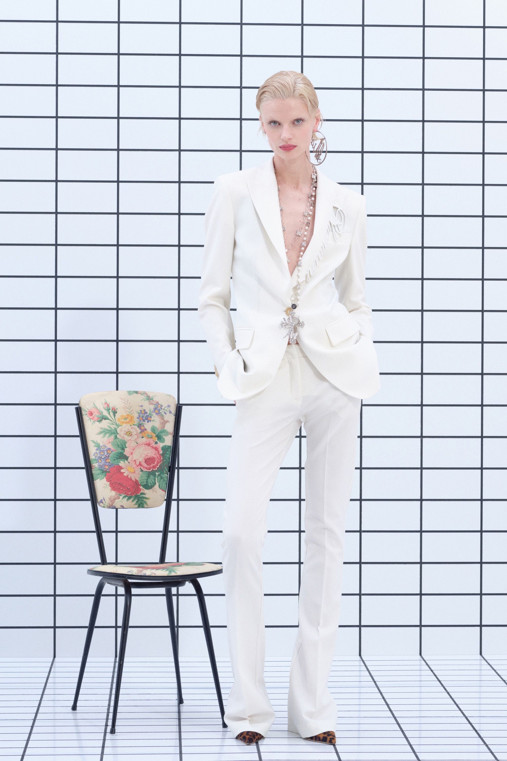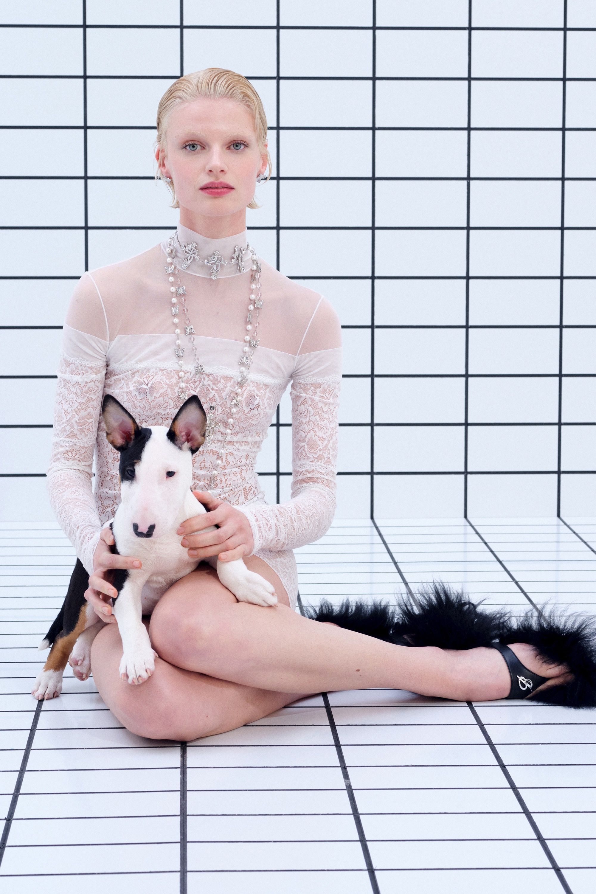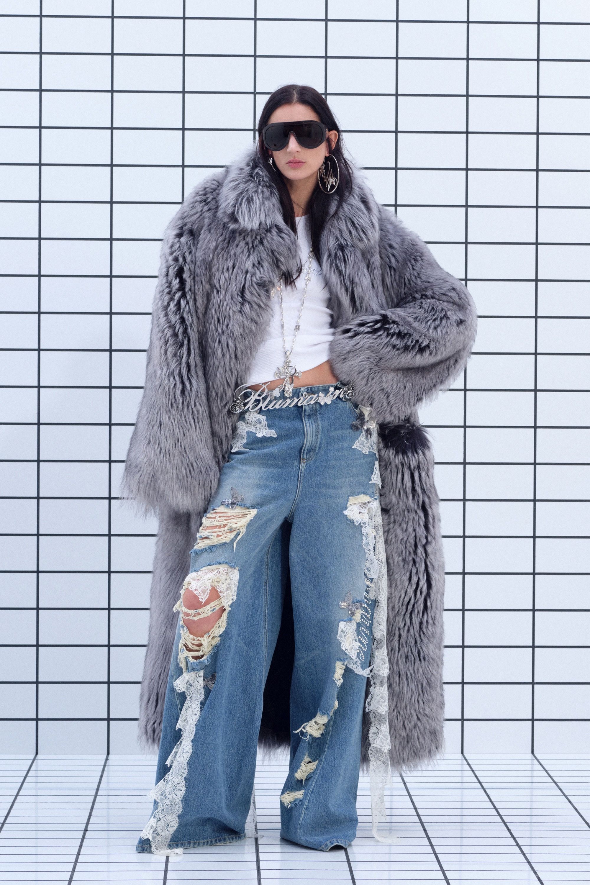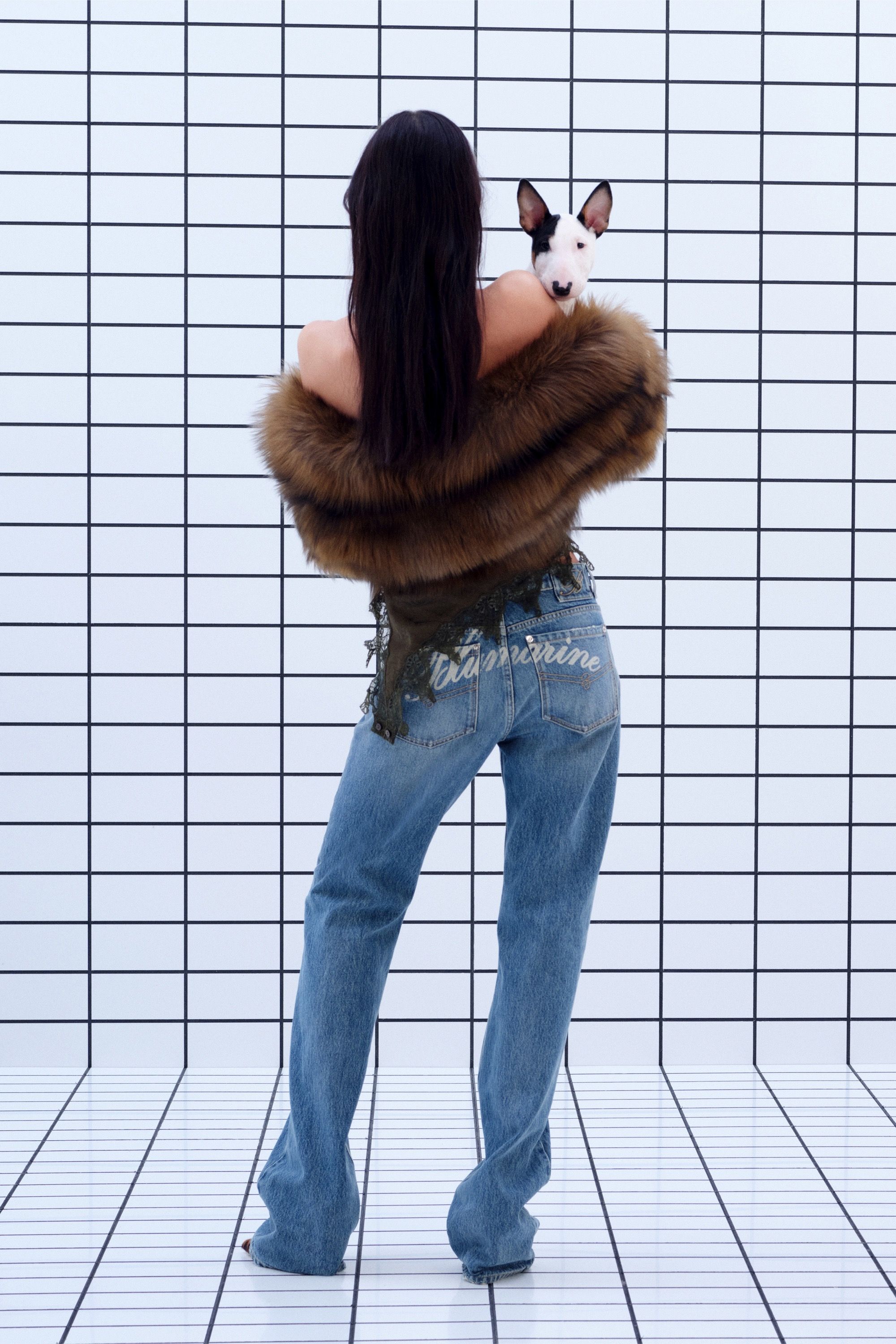 Se la giocosità del nuovo Blumarine ha pieno corso con le scritte “Woof” e “Miao” oltre che con le stampe di cuccioli di gatto e cane su magliette e soprattutto sugli slip visibili attraverso mille trasparenze, rivelati dai tagli corti dei top croppati, l’anima del brand si esprime attraverso i suoi due emblemi: il cardigan orlato di pelliccia e le rose. Amante degli orli di pelliccia, Koma li trasferisce su una vasta gamma di abiti: capispalla, giacche, twin-set, maglieria, accessori – tutti prodotti con diversi materiali come le piume di struzzo, la sheepskin o il cavallino effetto cashmere. Quanto alla rosa, invece, protagonista di stampe d’archivio, la si ritrova su abiti in jersey, gonne e abiti lunghi in crepon a balze oltre che sugli abiti in georgette e chiffon e anche sui revers di alcune giacche. Altri fiori si trovano sugli abiti da sera corti e lunghi costruiti come mosaici di pannelli di pizzo i cui dettagli sono alquanto intricati mentre, seguendo l’idea di mescolare il guardaroba di  diverse generazioni, Koma ha adattato silhouette classiche con materiali moderni: abitini neri in neoprene o denim, abiti da cocktail in viscosa o pelle; tailleur che diventano maglieria. D’ispirazione più y2K, invece, ci sono i capi che presentano il logo del brand sul retro dei jeans o sui decolletè.