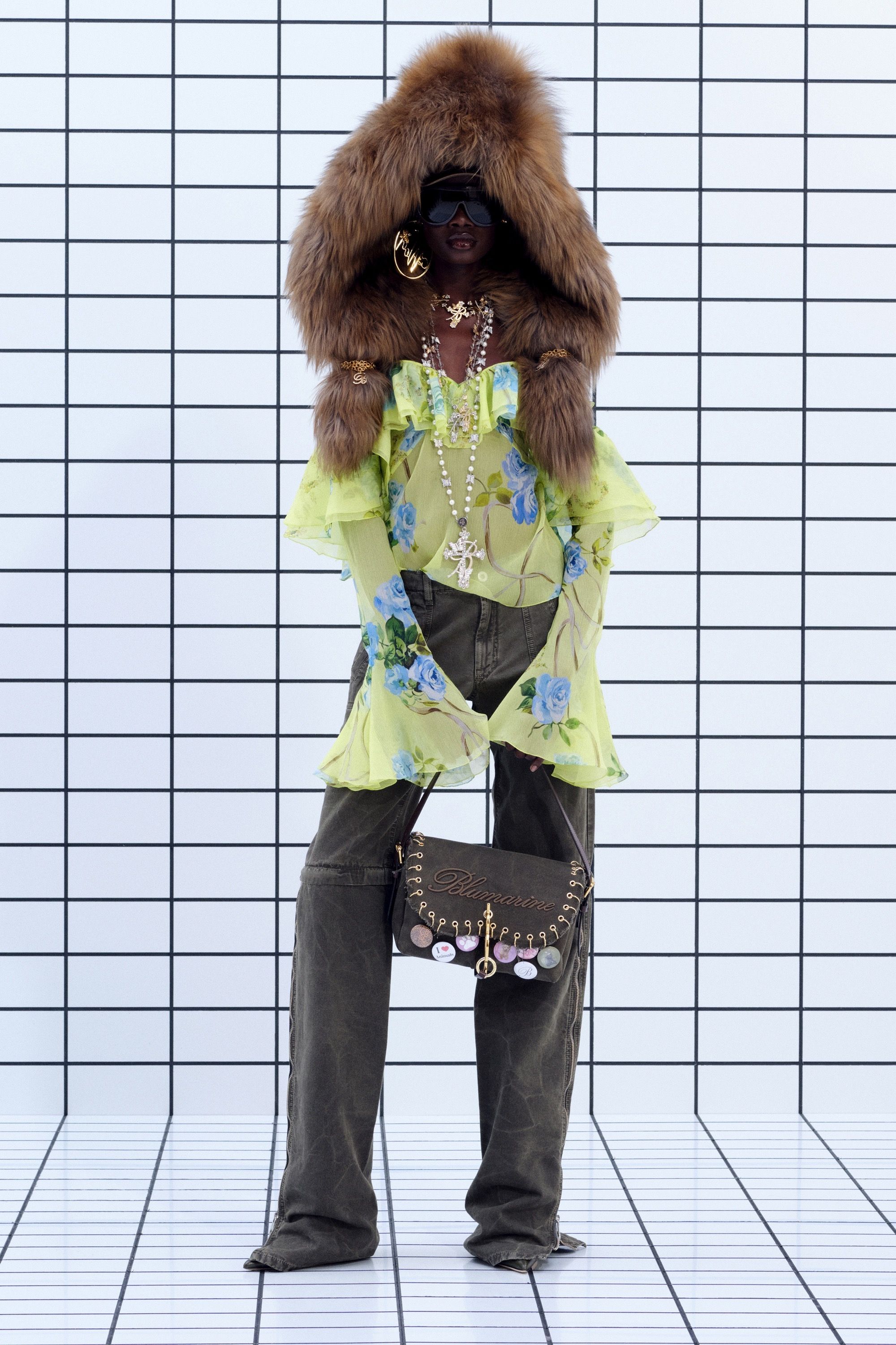 Infine, gli accessori reinterpretano il DNA del brand con un tocco ironico e sofisticato. La borsa Kiss Me, dalla forma di labbra, viene proposta in una versione in montone effetto cashmere, mentre la nuova borsa a tracolla, ispirata alla silhouette di un derrière, è disponibile in canvas verde cargo, pelle nera o pelle nera washed out, con dettagli come ciondoli decorativi o finiture in montone. Una borsa da sera con la celebre B del brand è stata prodotta in formato piccolo o mini. Ma gli altri accessori includono collane rosario con ciondoli a croce, pendenti con le scritte ‘Woof’ e ‘Miao’ e gioielli cat-eye. Il tema animalier si ritrova negli stivali leopardati in cavallino con tacco a stiletto e nei sandali boudoir impreziositi da shearling o piume. Data la presenza di animali domestici sia nel lookbook che tra le ispirazioni della collezione, Koma ha creato anche una serie di collari, guinzagli con borchie argentate a forma di rosa e un porta-sacchetti da polso in pelle. È molto interessante, anche da prodotti periferici come questi, capire che nel creare la nuova identità di Blumarine l’idea di David Koma sia nata subito così ben strutturata e dettagliata – non priva di un suo umorismo che è assolutamente imperativo nella seriosa moda di oggi. Un mood che senza dubbio emergerà al suo meglio nella prossima sfilata del brand che Milano e il mondo della moda attendono per la prossima fashion week femminile.