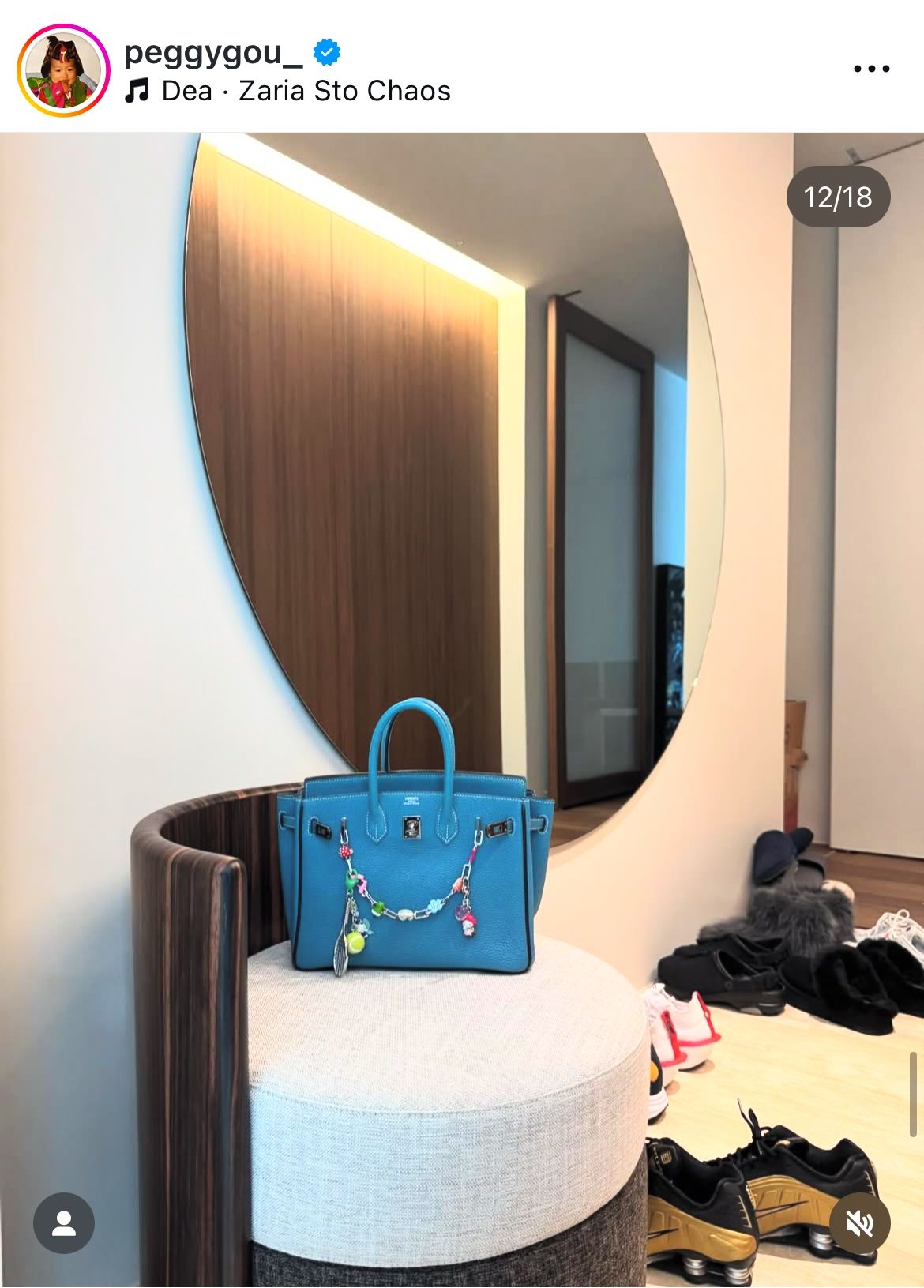 La collezione firmata Hermès di Peggy Gou è piuttosto variegata, con colori inaspettati e modelli tradizionali sempre arricchiti da charms e dettagli pop. Come in questi due casi, con una Birkin verde lime fomato maxi e un’altra più piccola color ceruleo. Entrambe rigorosamente accessoriate.