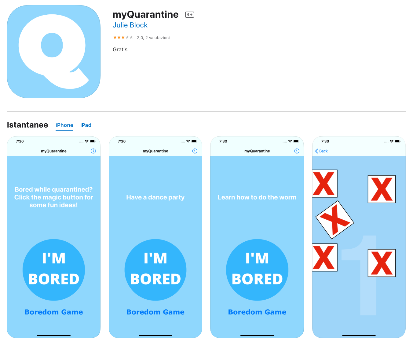 Questo mi ha spinto a chiedermi cos’altro avessero mai inventato i geni che popolano Internet. Digitando “Quarantine” sempre sull’App Store infatti si è aperto un mondo. C’è l’app MyQuarantine che schiacciando un pulsante dà suggerimenti istantanei per ammazzare il tempo.