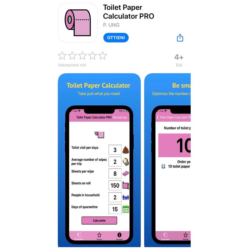 Poi c'è Quarantine Dice Training, l'app che ti incoraggia ad allenarti in un’ottica di gamification: lancia i dati e fai l’esercizio che ti viene richiesto. E forse la migliore di tutte è Toilet Paper Calculator per calcolare esattamente quanta carta igienica ti serve da qui a.. un lungo periodo.