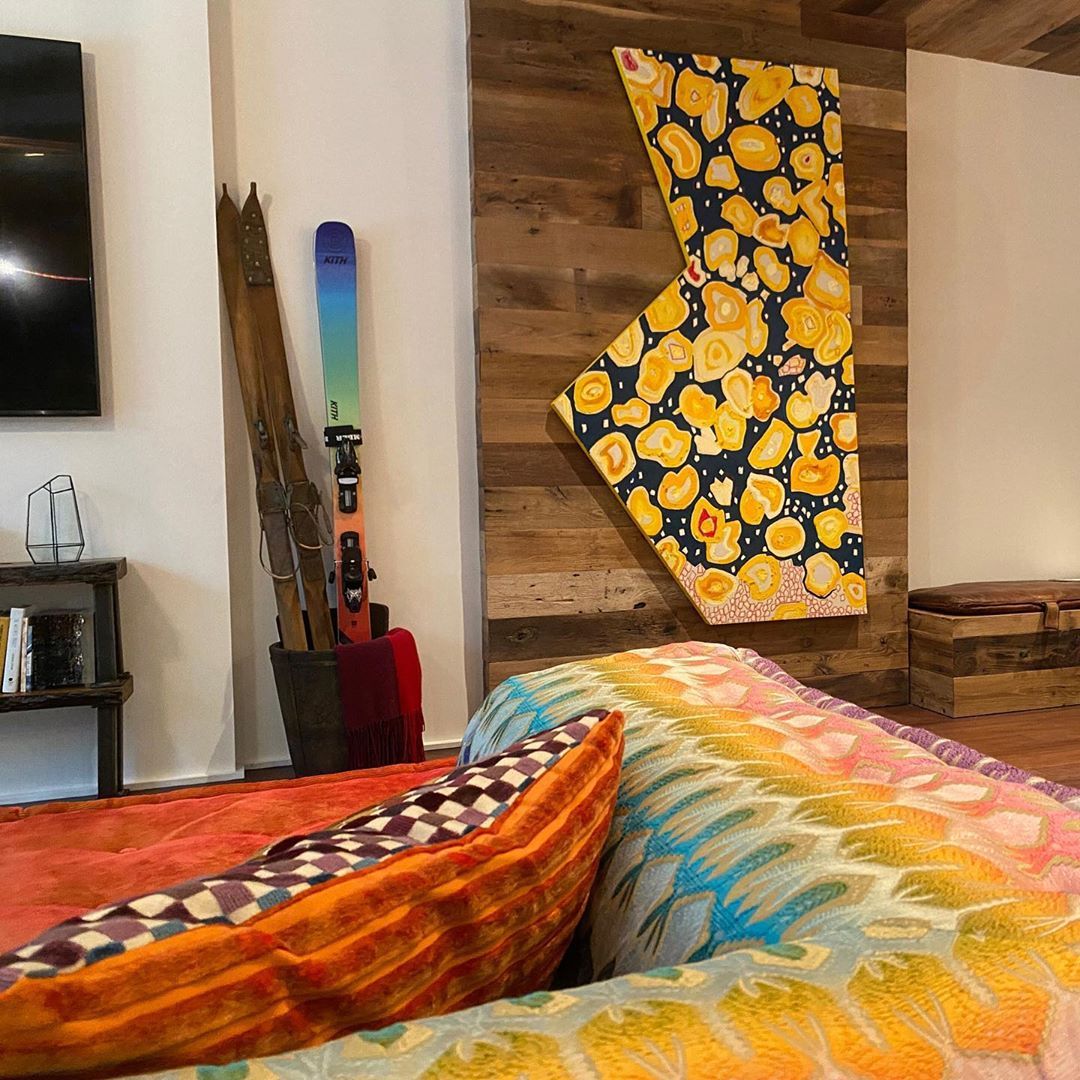 Coloratissima e sui toni caldi ma neutri, la zona living fa pensare ad atmosfere orientali e lontane, ed è caratterizzata da un divano ad angolo firmato Missoni con cuscini di Jean Paul Gaultier. Una cesta in vimini scuro contiene riviste vintage e necessaire personalizzato in marmo con le iniziali “G.H”. Sulla parete un’opera della giovanissima artista americana Austyn, nota per la sua palette cromatica esplosiva e iper-saturata. Un altro tocco di stile sono il paio di sci di Kith appoggiati al muro, che riprendono le sfumature del divano Missoni. Quanta energia nell’aria!