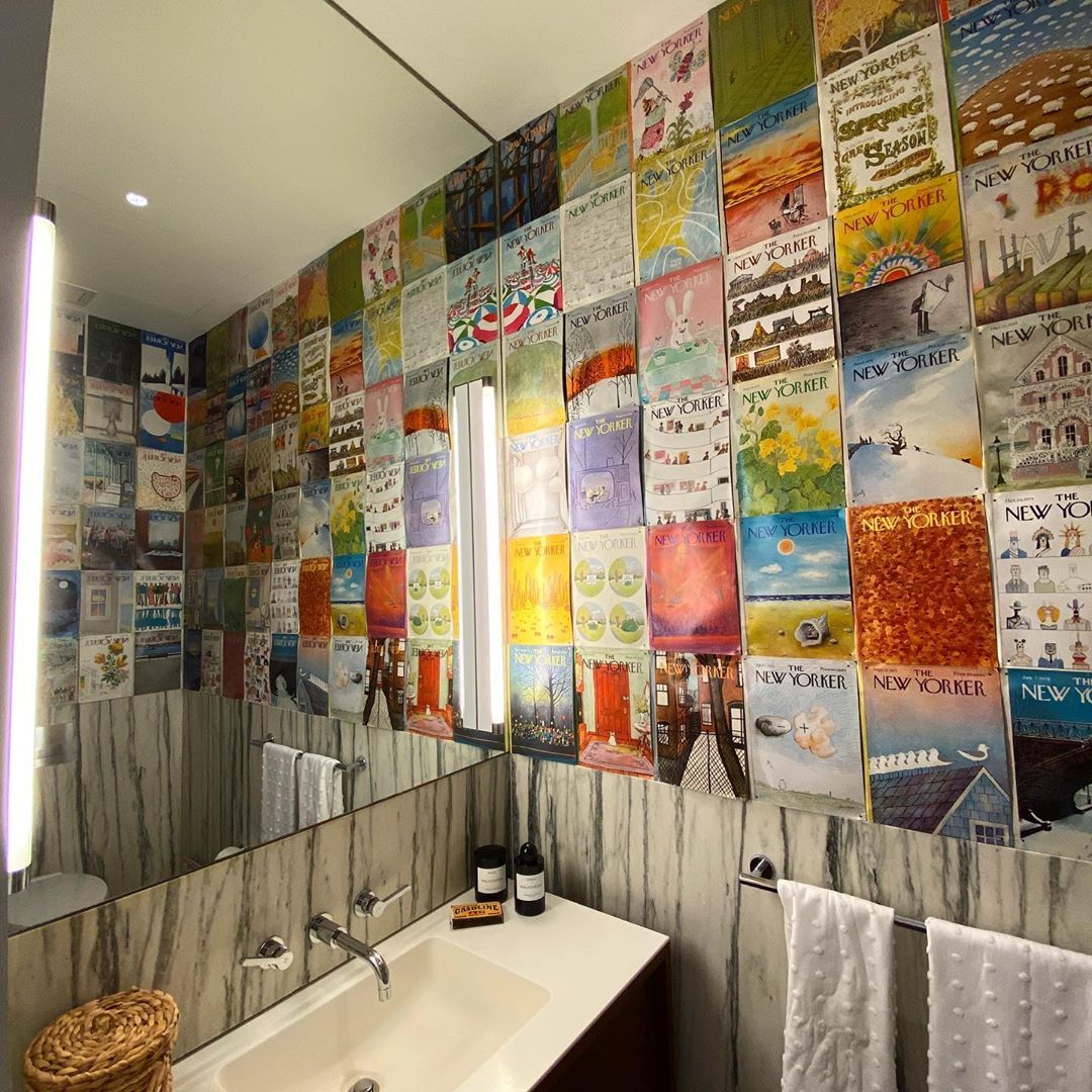 Il bagno principale in vetro e legno è luminosissimo e pieno di scaffali e cassetti dove riporre le migliaia di prodotti che Gigi riceverà ogni giorno. Molto diverso e metropolitano invece uno degli altri sei bagni, tappezzato da una collezione di copertine illustrate del New Yorker. Una delizia per gli occhi degli appassionati. Al tema “scrittura” rimanda anche una gigantesca penna gialla accostata sulla porta di questo caratteristico bagno. Che sia il luogo dove Gigi incanala i suoi pensieri creativi? Ne sapremo di più molto presto, non tarderà ad arrivare un video in diretta sulla sua beauty routine da questo posto da sogno.